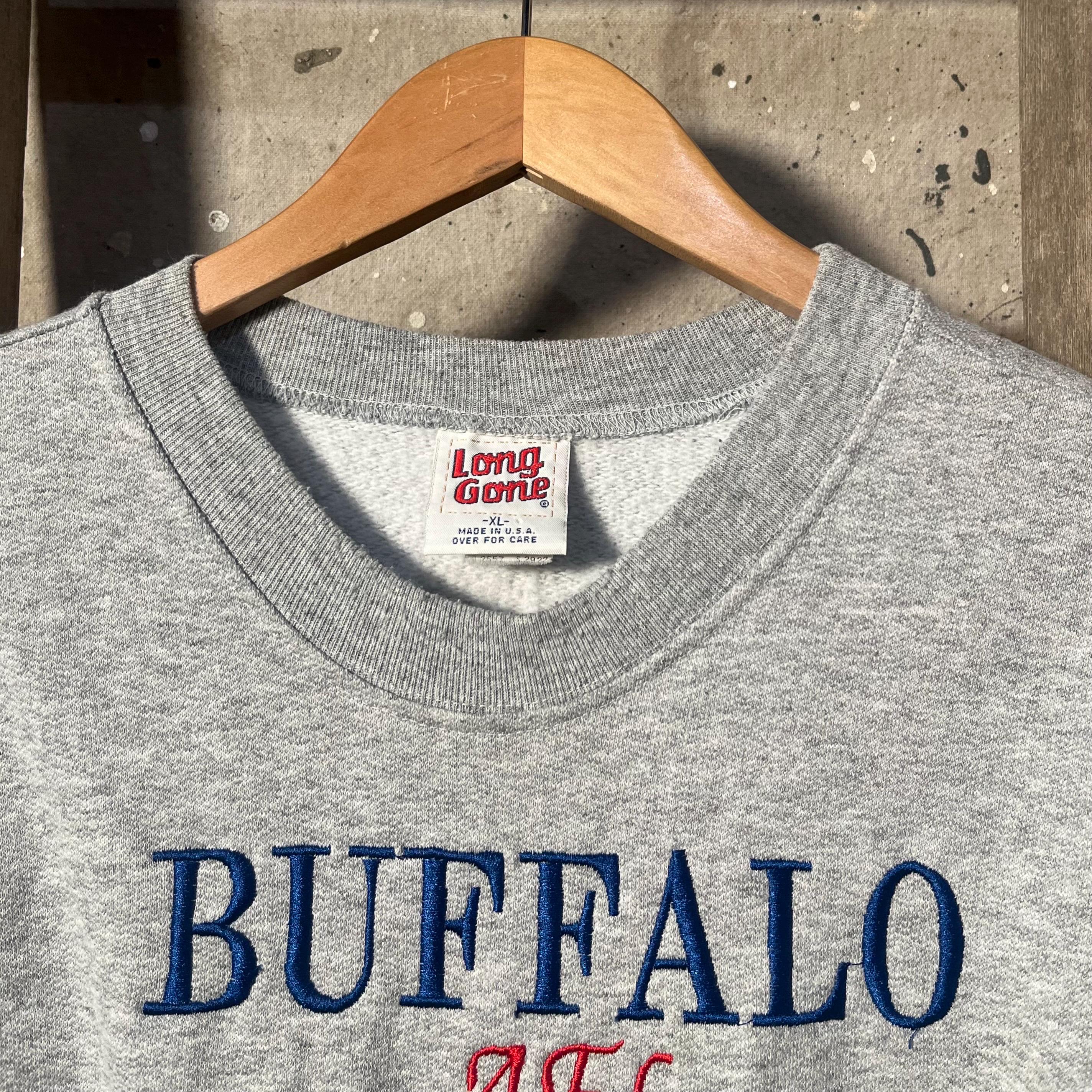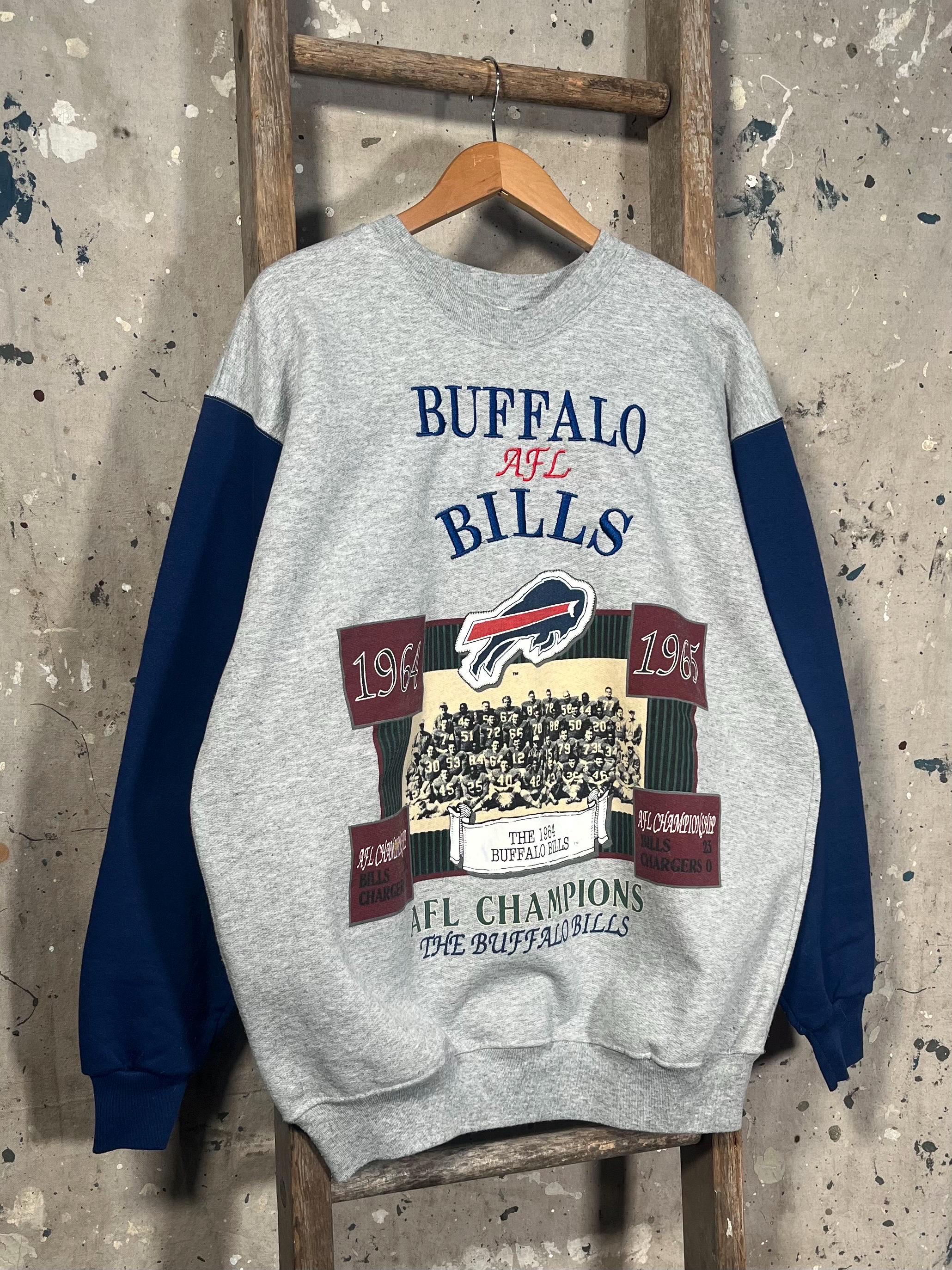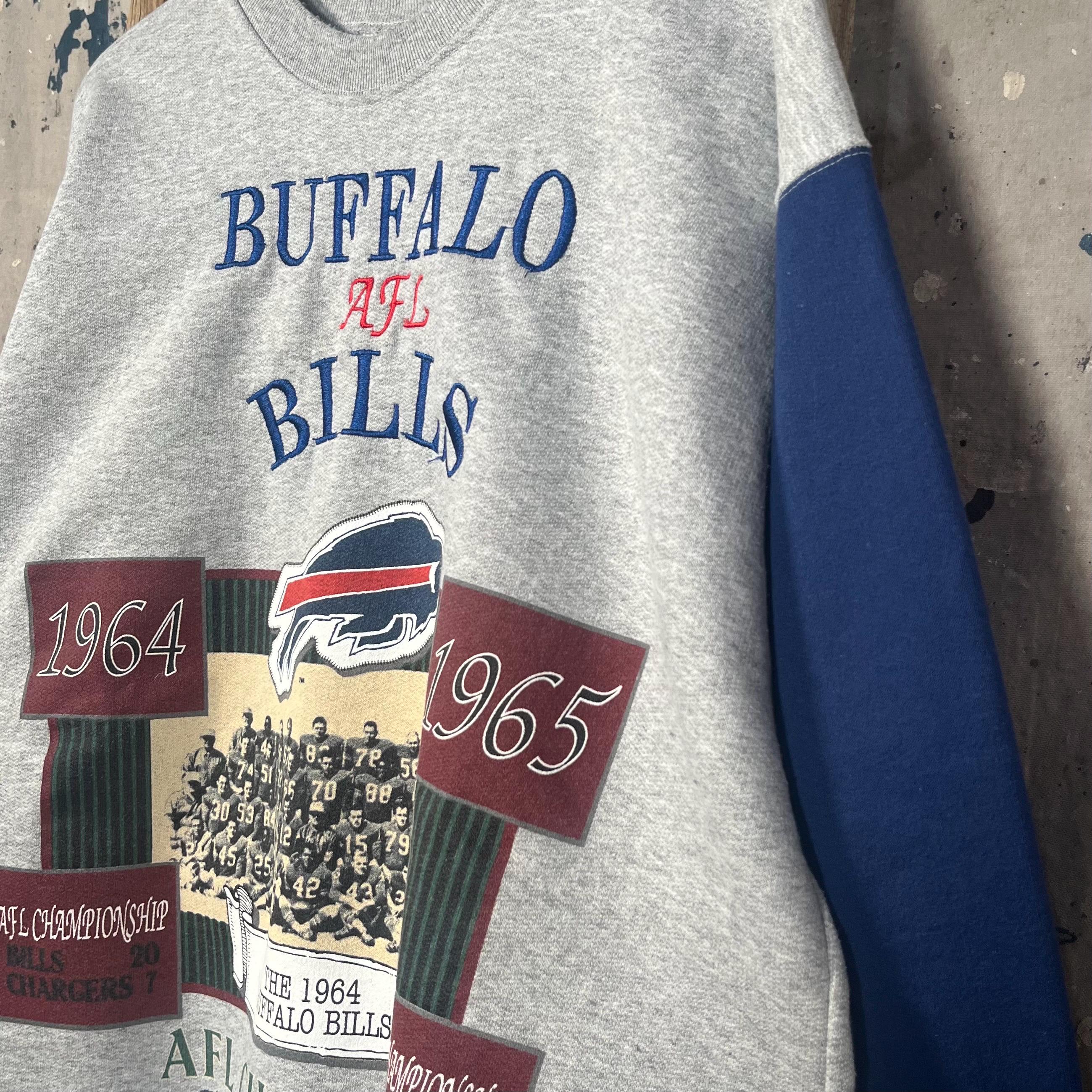 Incredibly rare 1980s early '90s Buffalo Bills sweatshirt . Huge Buffalo Bills historic photograph celebrating 1964 / 65 AFL championship team. Two tone with color block sleeves, embroidered chest large chest graphic. Good condition - see photos. Made in USA
