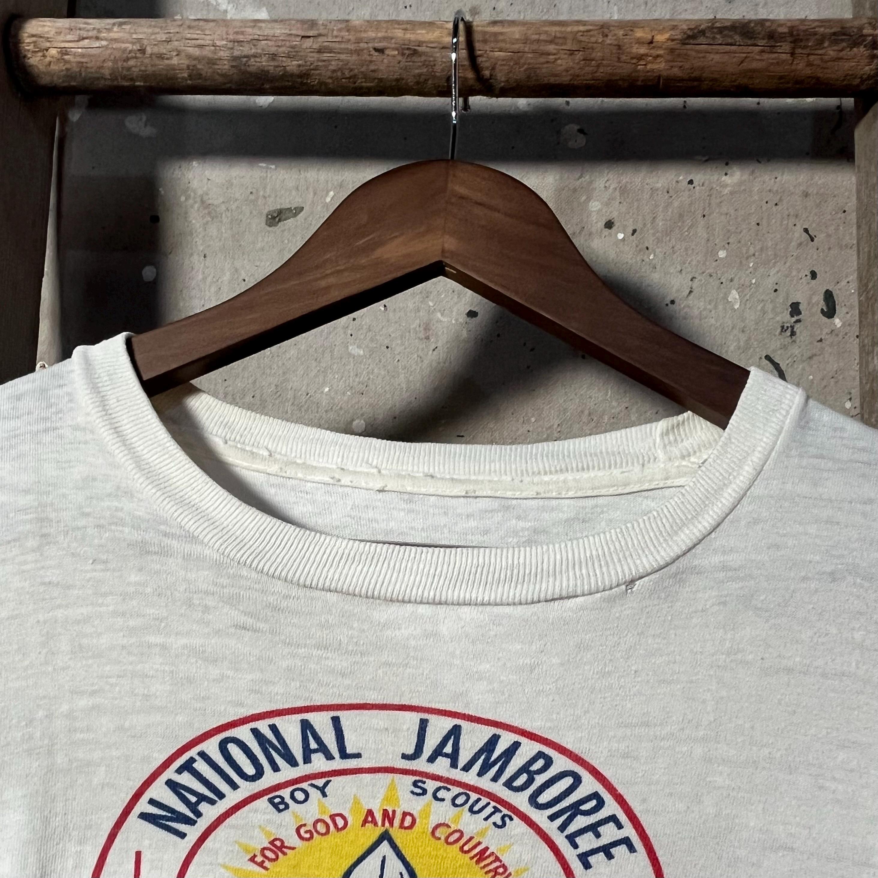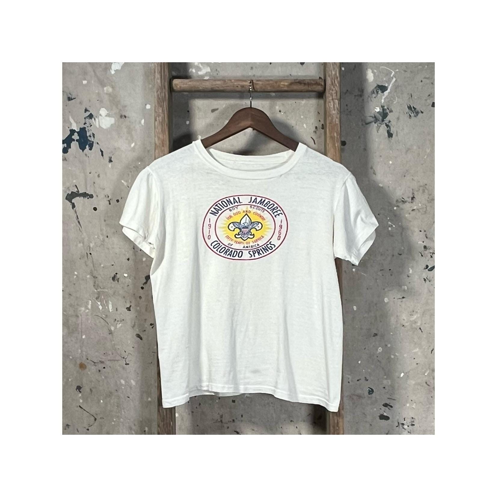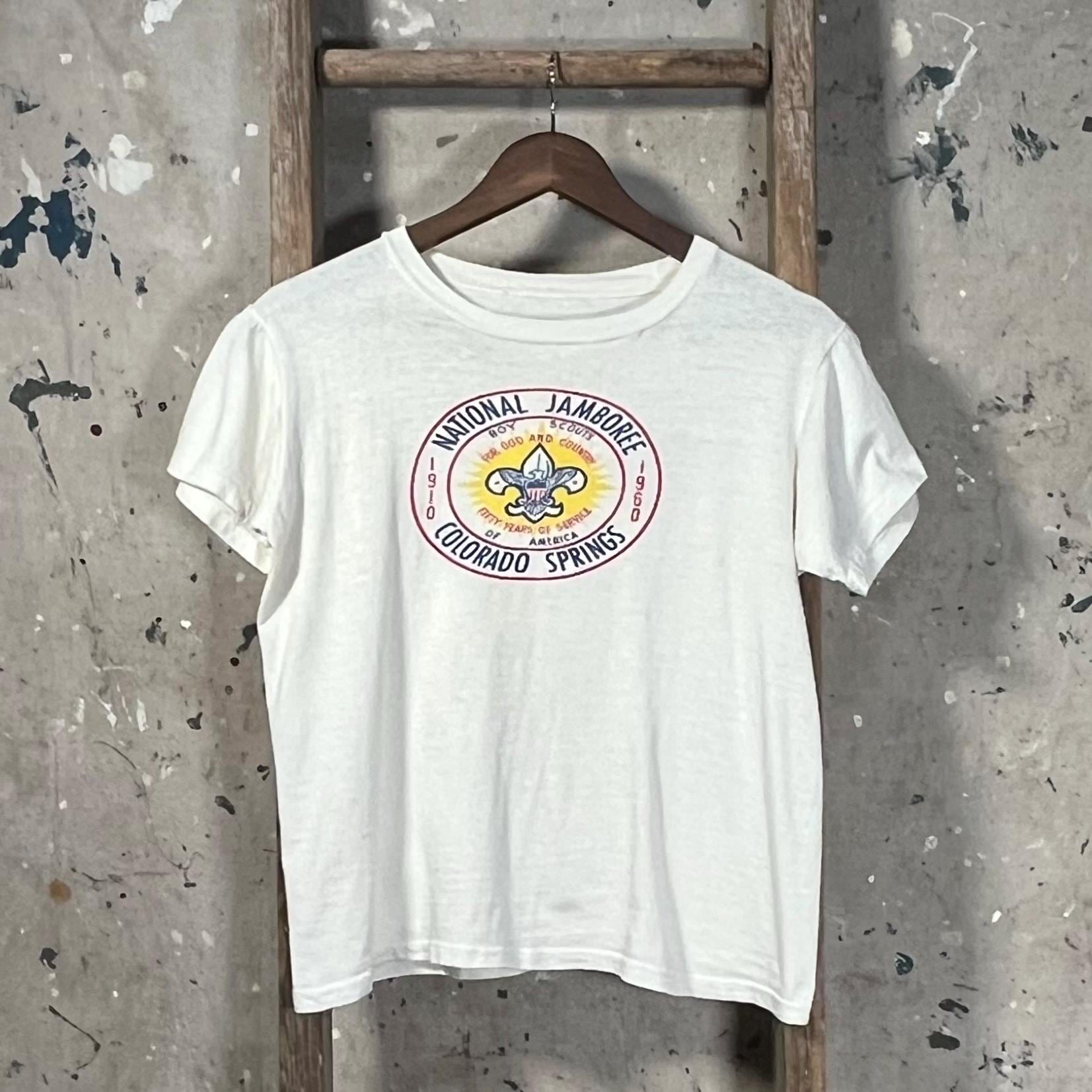 1960s Boy Scouts of America T-Shirt. Features screen printed chest graphic , from a National Jamboree in Colorado Springs. Super soft , all cotton tee with light natural distressing. Good condition - see photos.