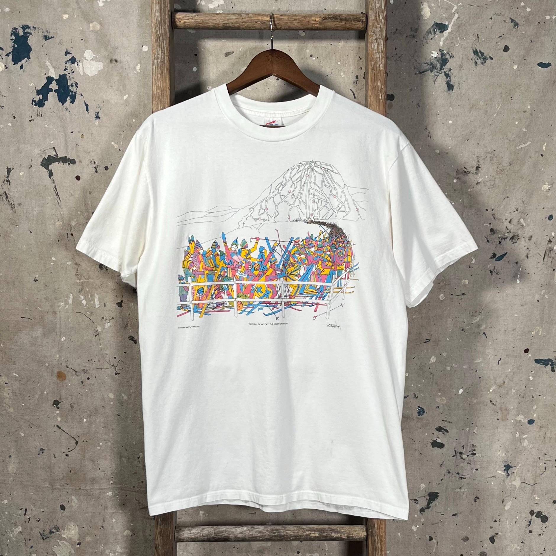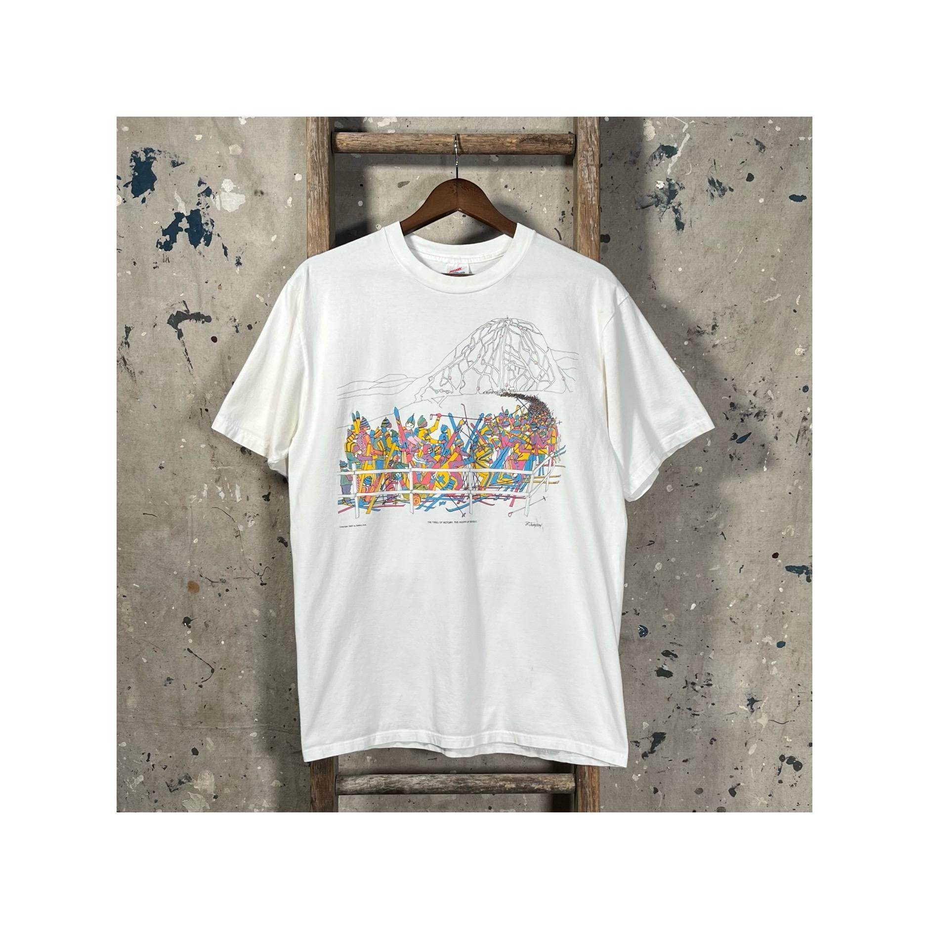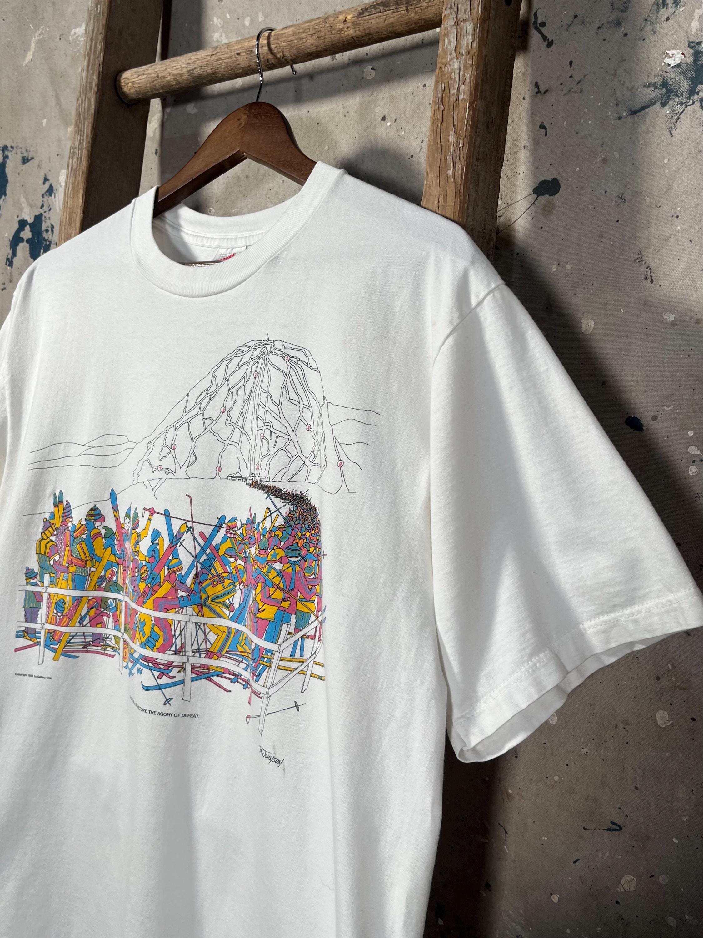 1990s Skiing T-Shirt. Features screen printed chest graphic , a mile long lift line. Soft all cotton , single stitch tee. Made in usa. Good vintage condition. Natural distressing, see photos.
