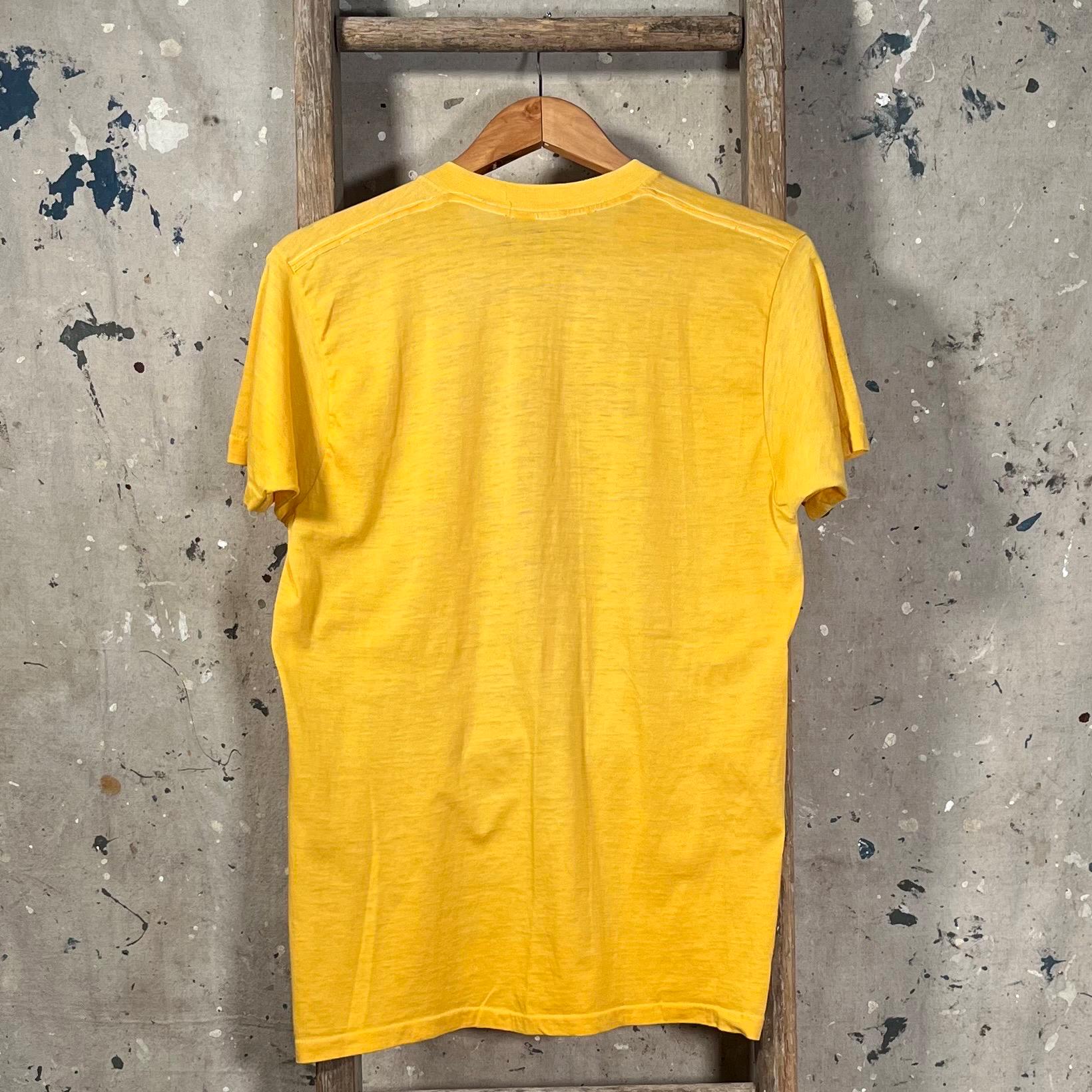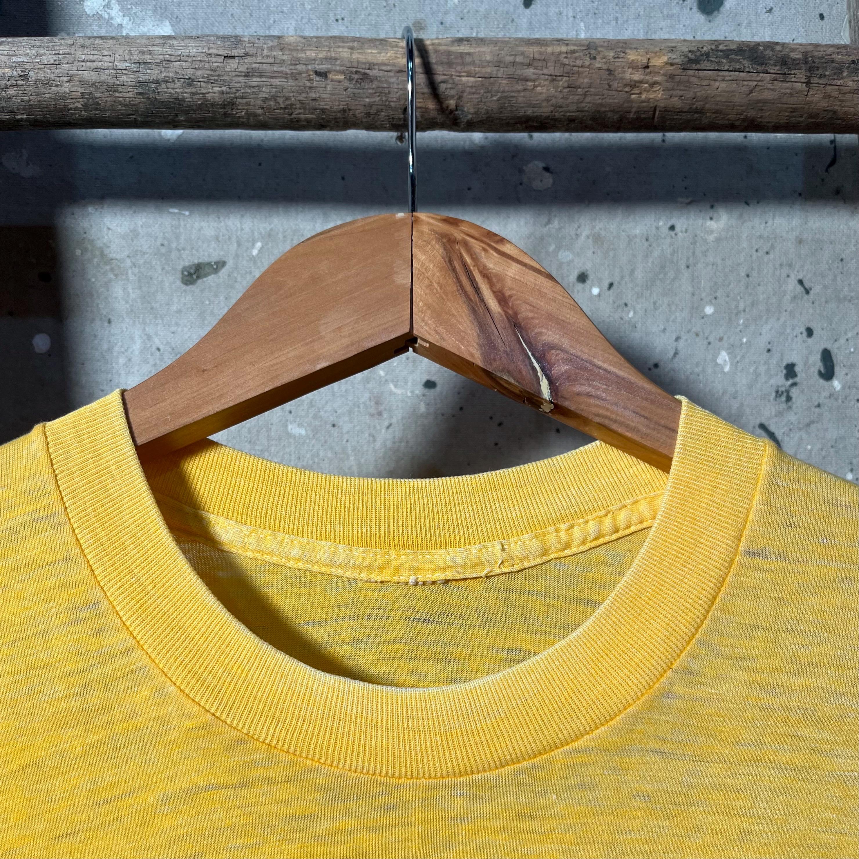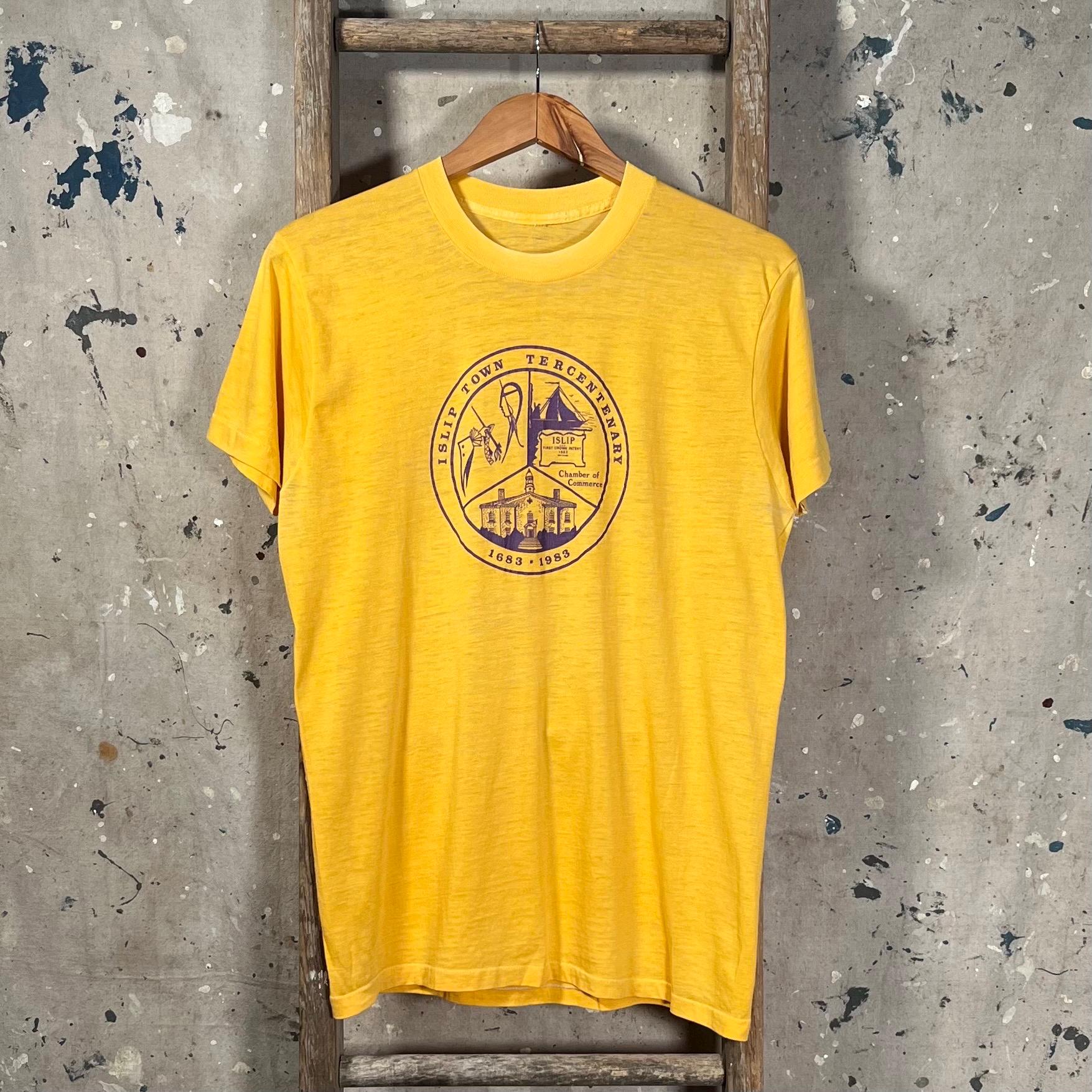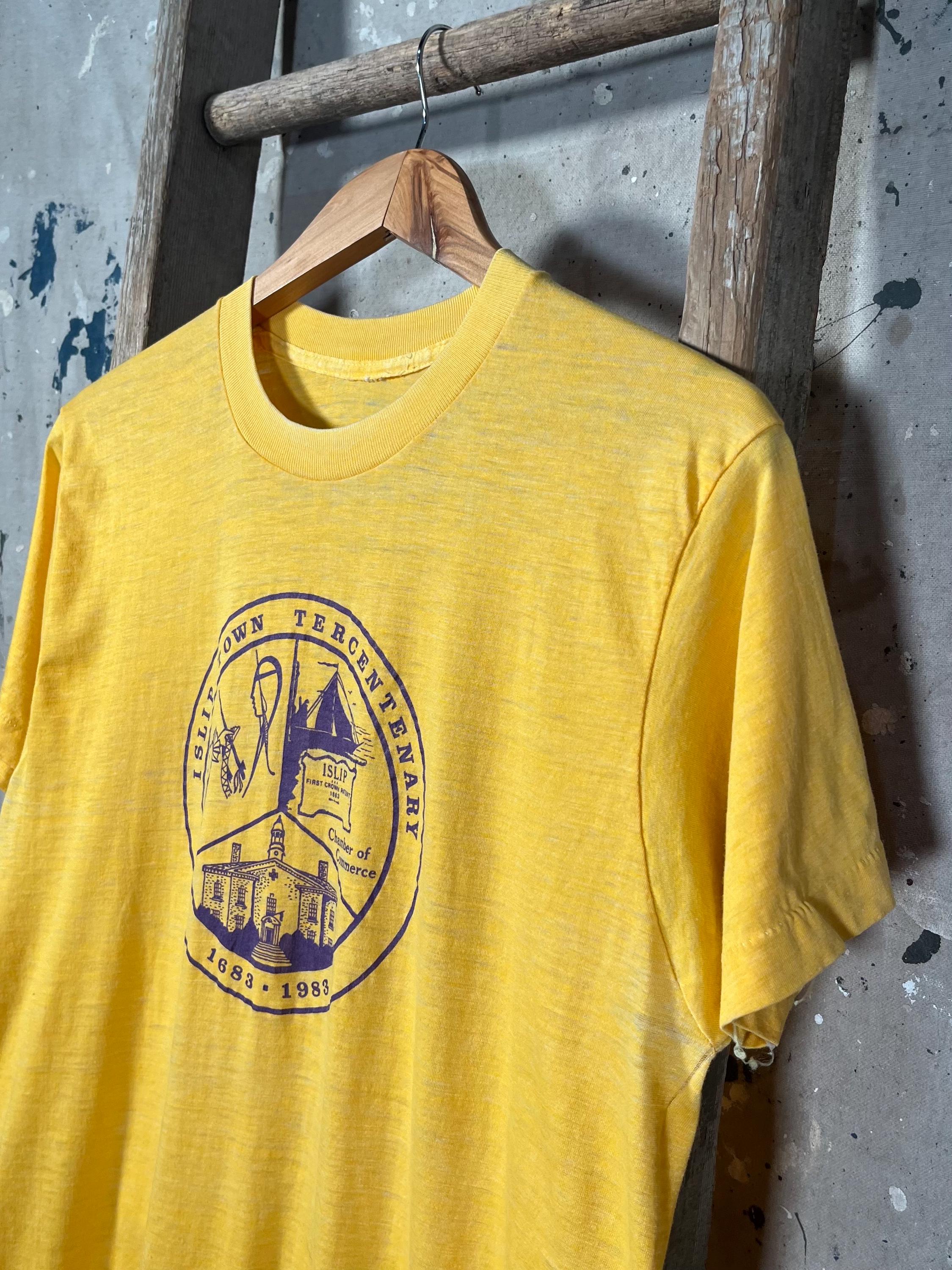 Paper Thin '80s Islip Town Tercentenary T-shirt. Features screen printed chest graphic on incredibly soft and thin yellow tee. Desirable wear throughout , good condition - see photos.