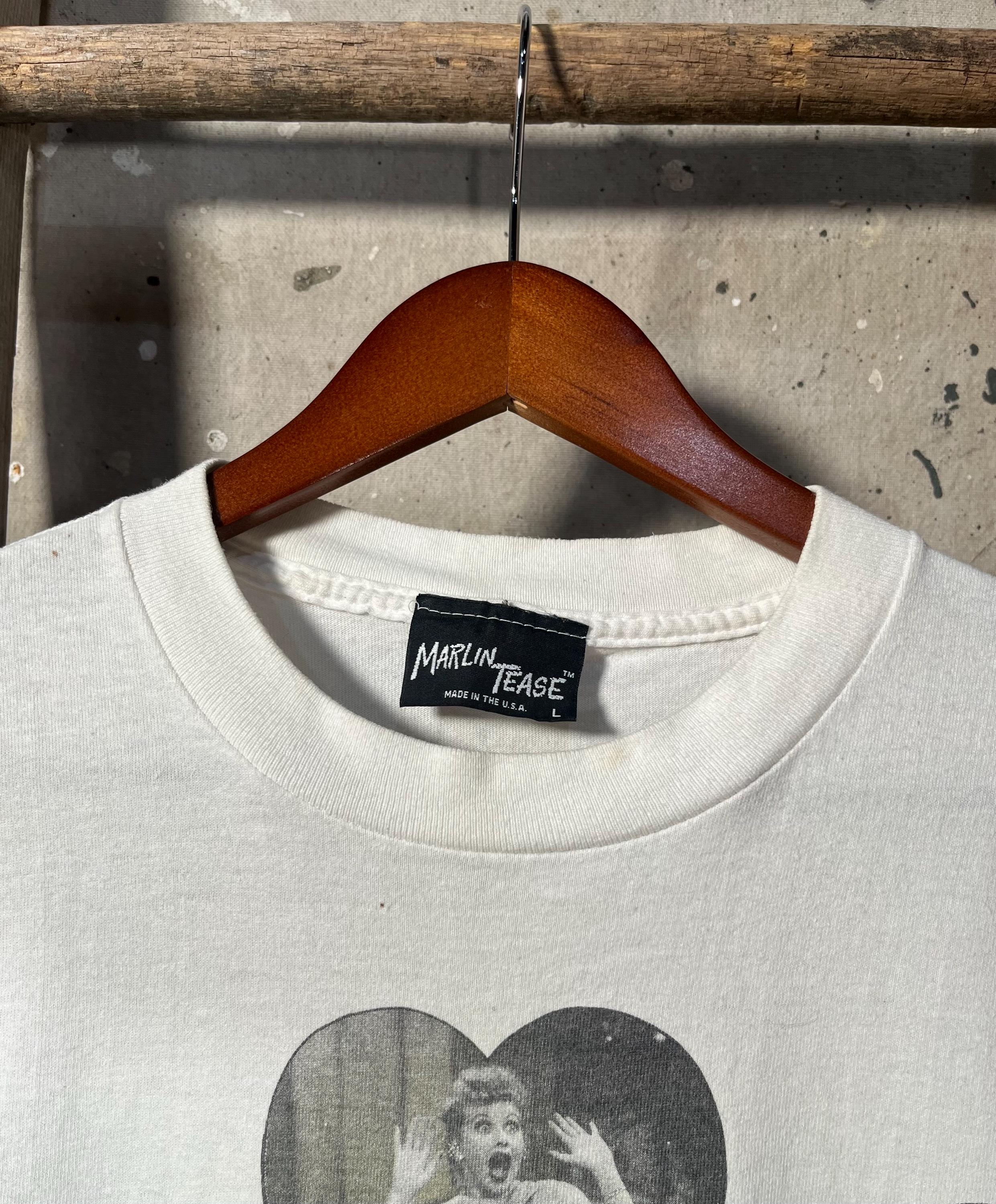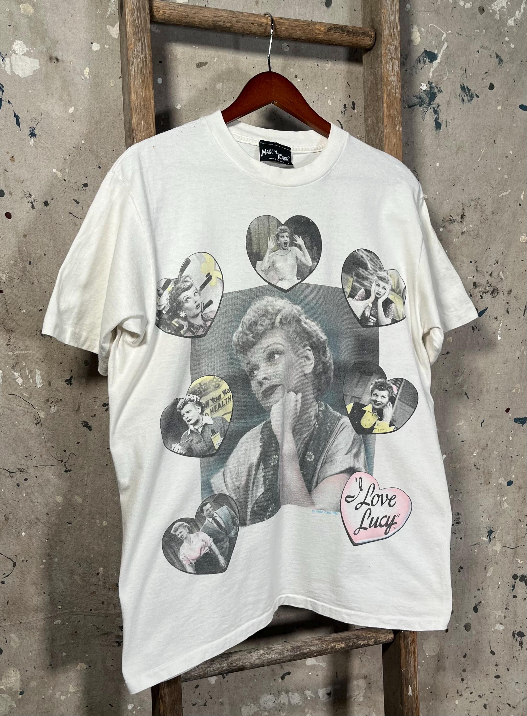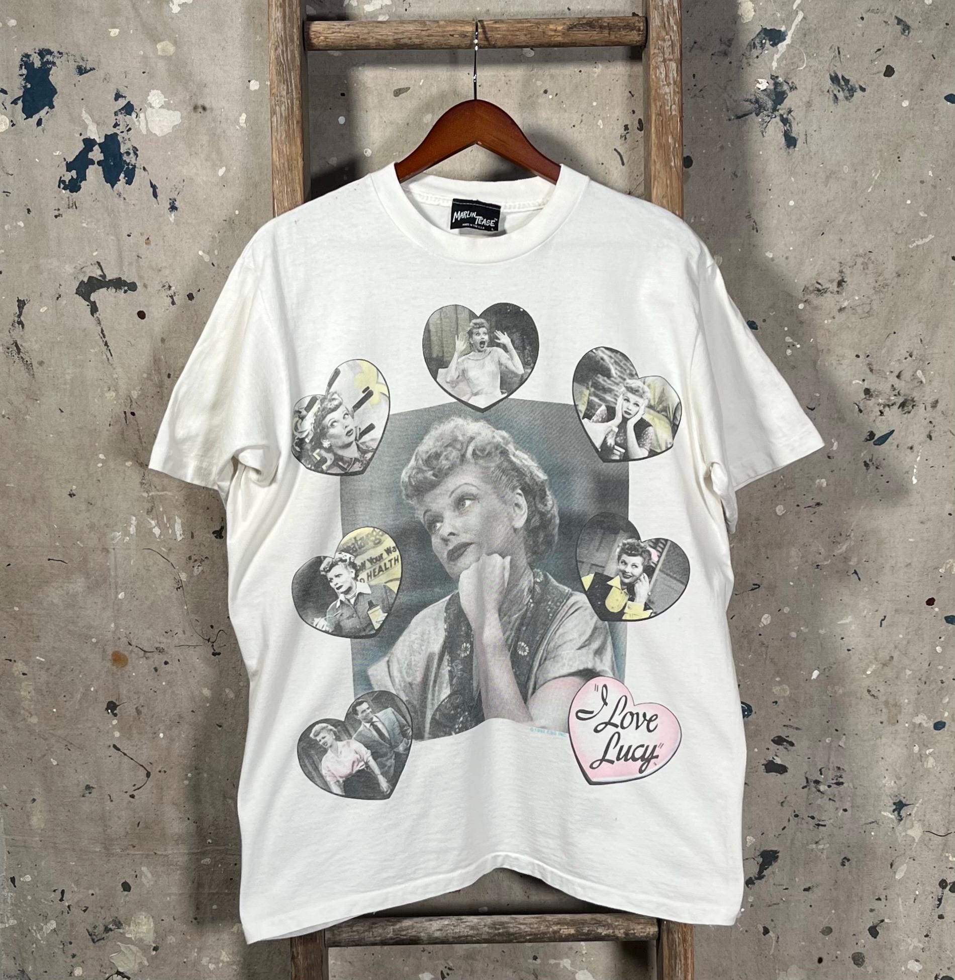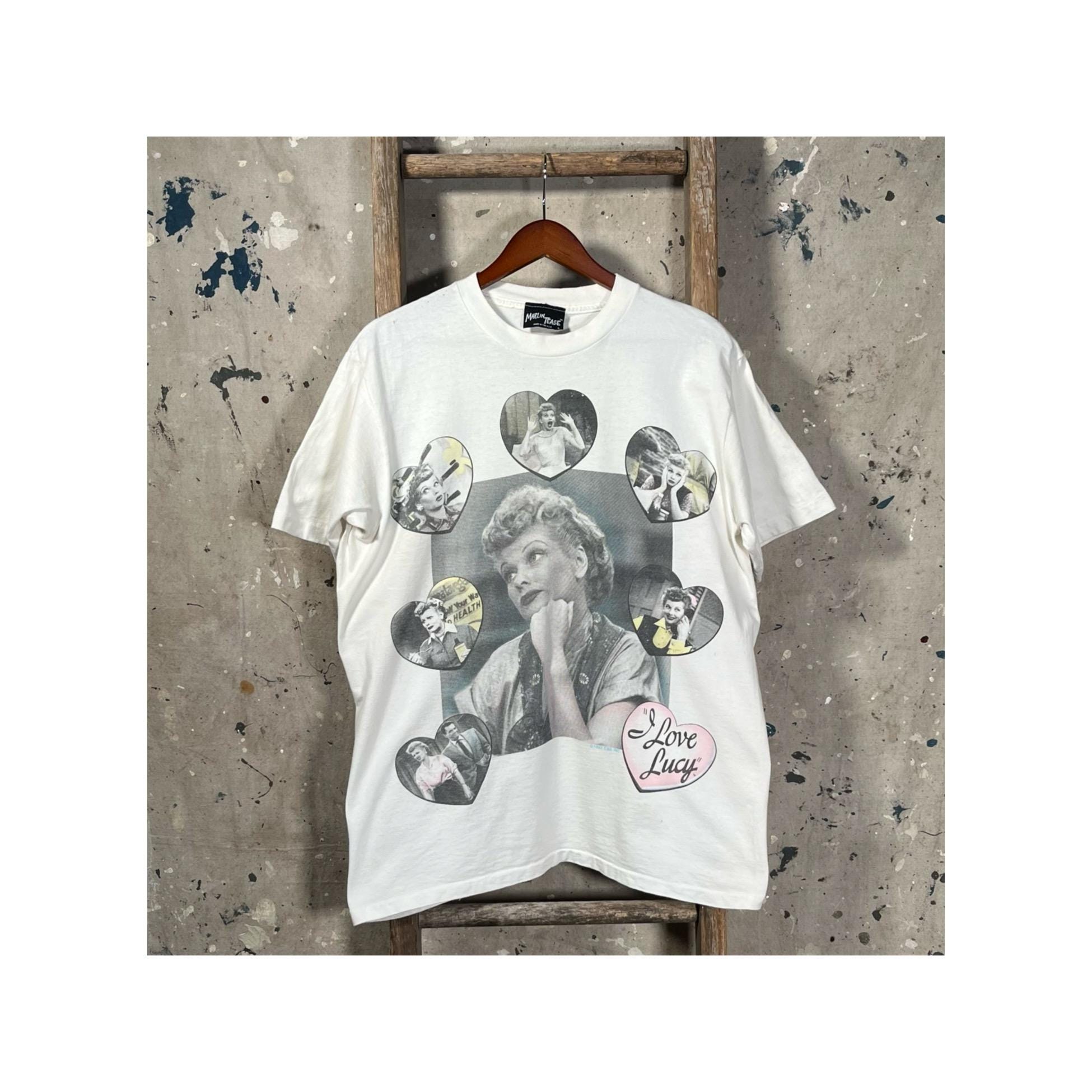 1990s I Love Lucy T-Shirt. Features large front chest graphic of different show scenes. Made in USA , single stitch , 100% cotton tee. Good condition , natural distressing , a couple blemishes at shoulder - see photos.