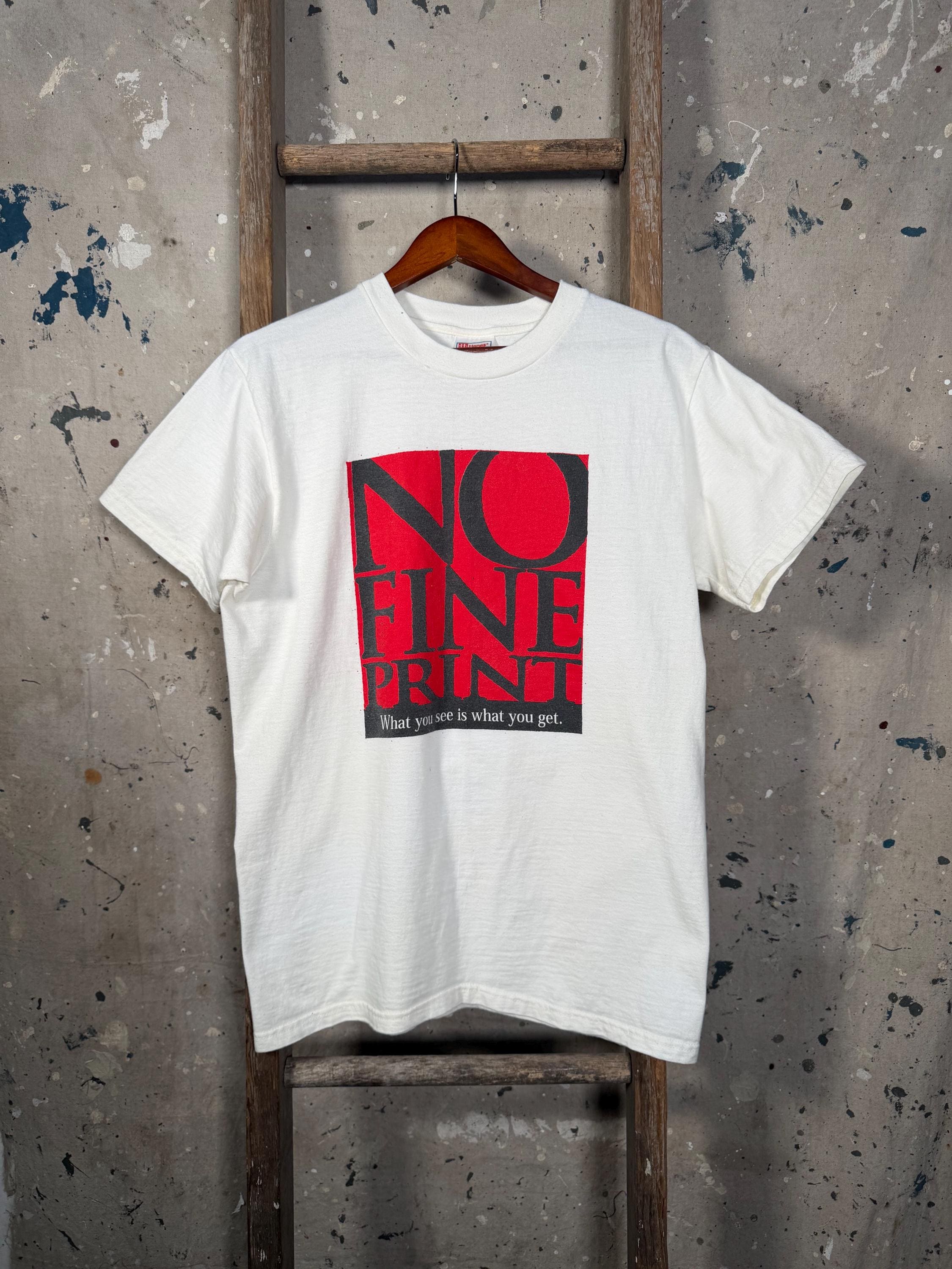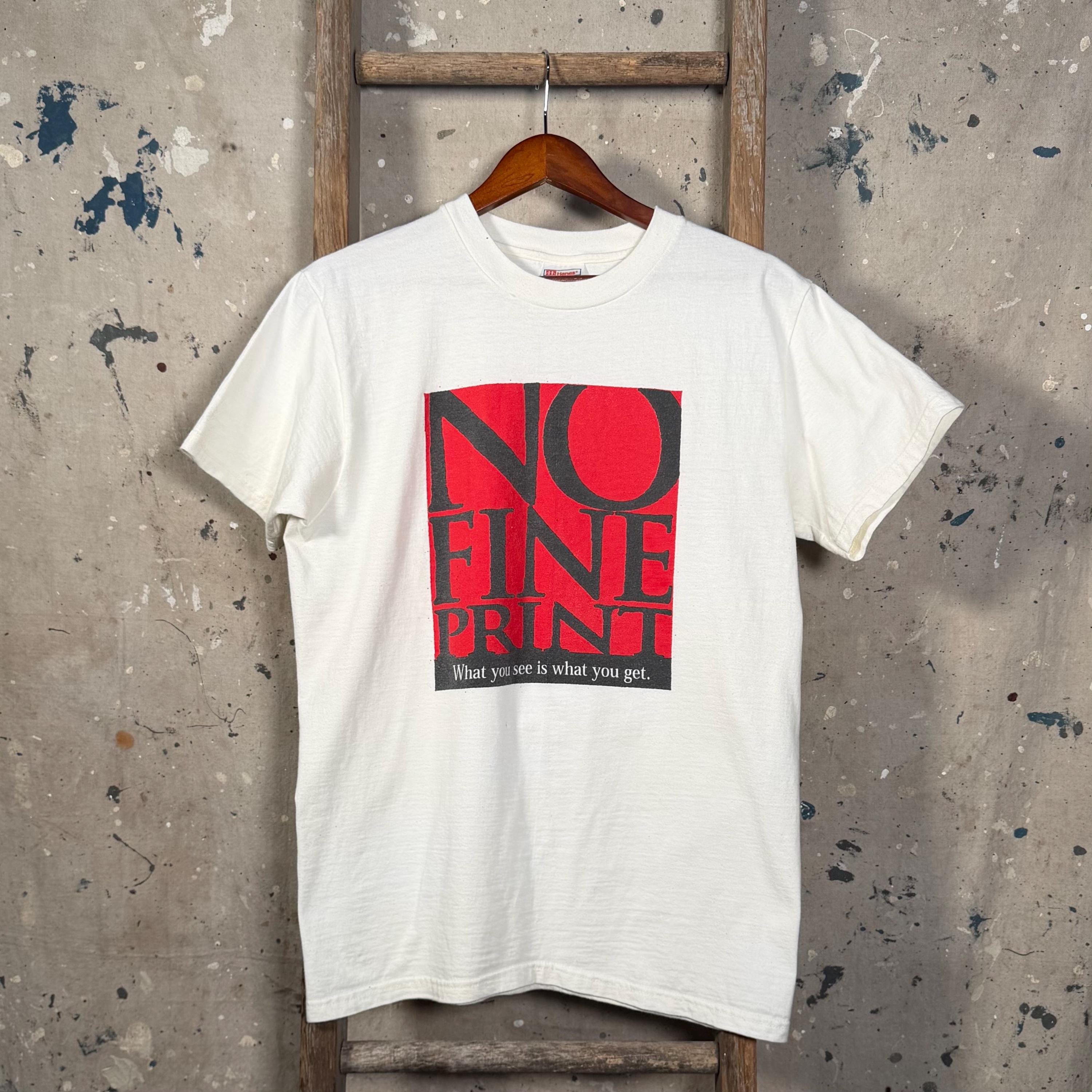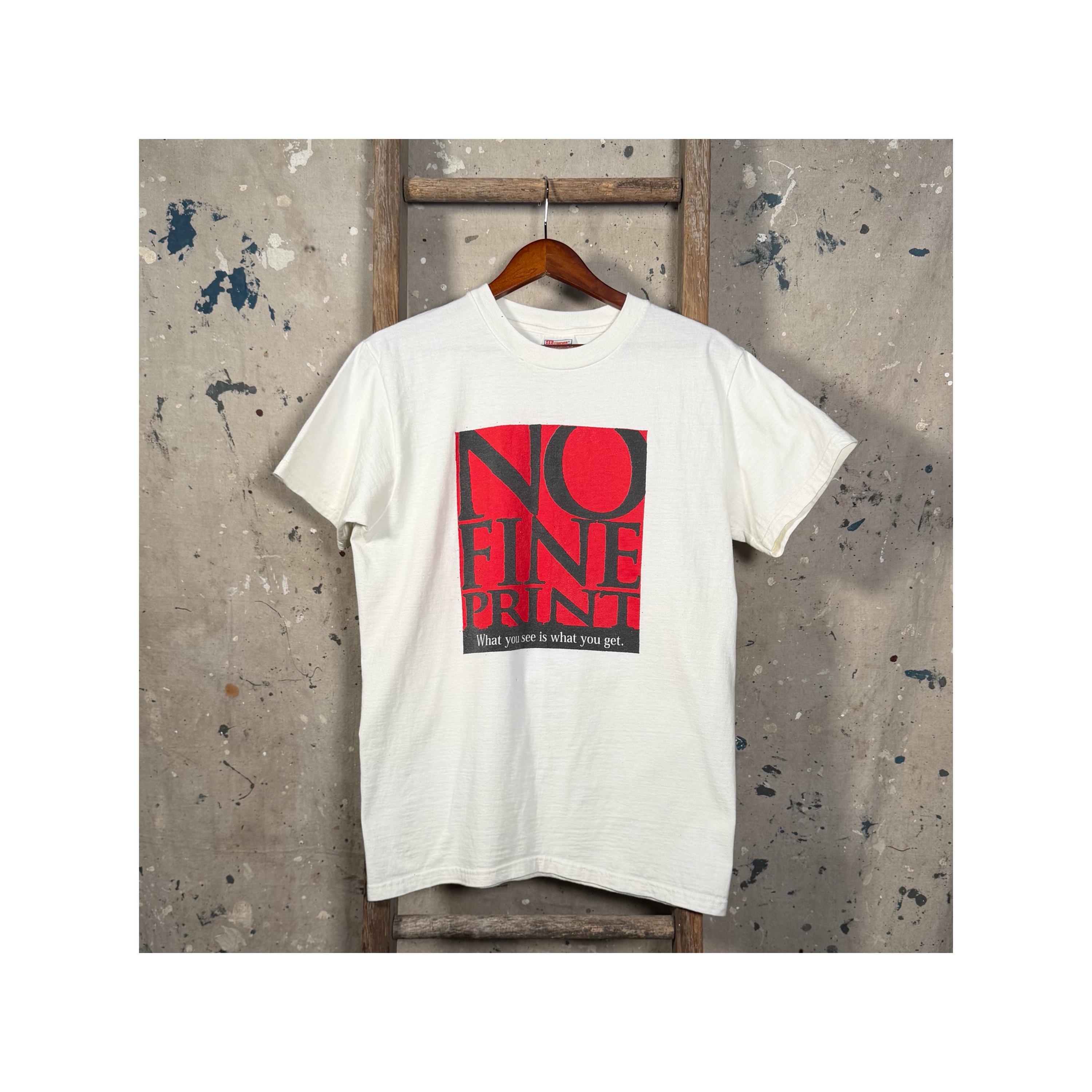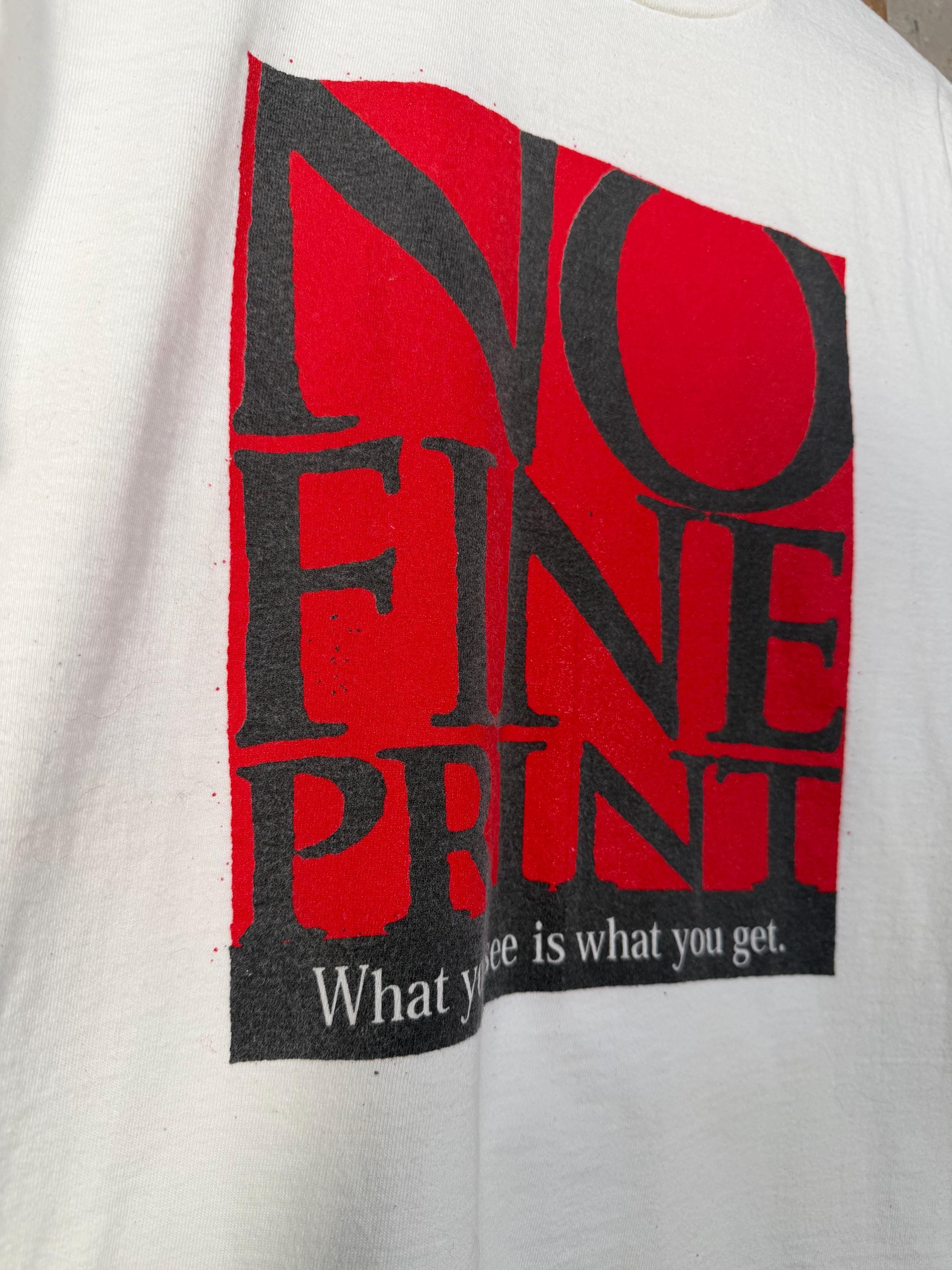 1990s 'No Fine Print' Credit Card T-Shirt. Double sided graphic. Good condition , natural fading and distressing throughout - see photos.