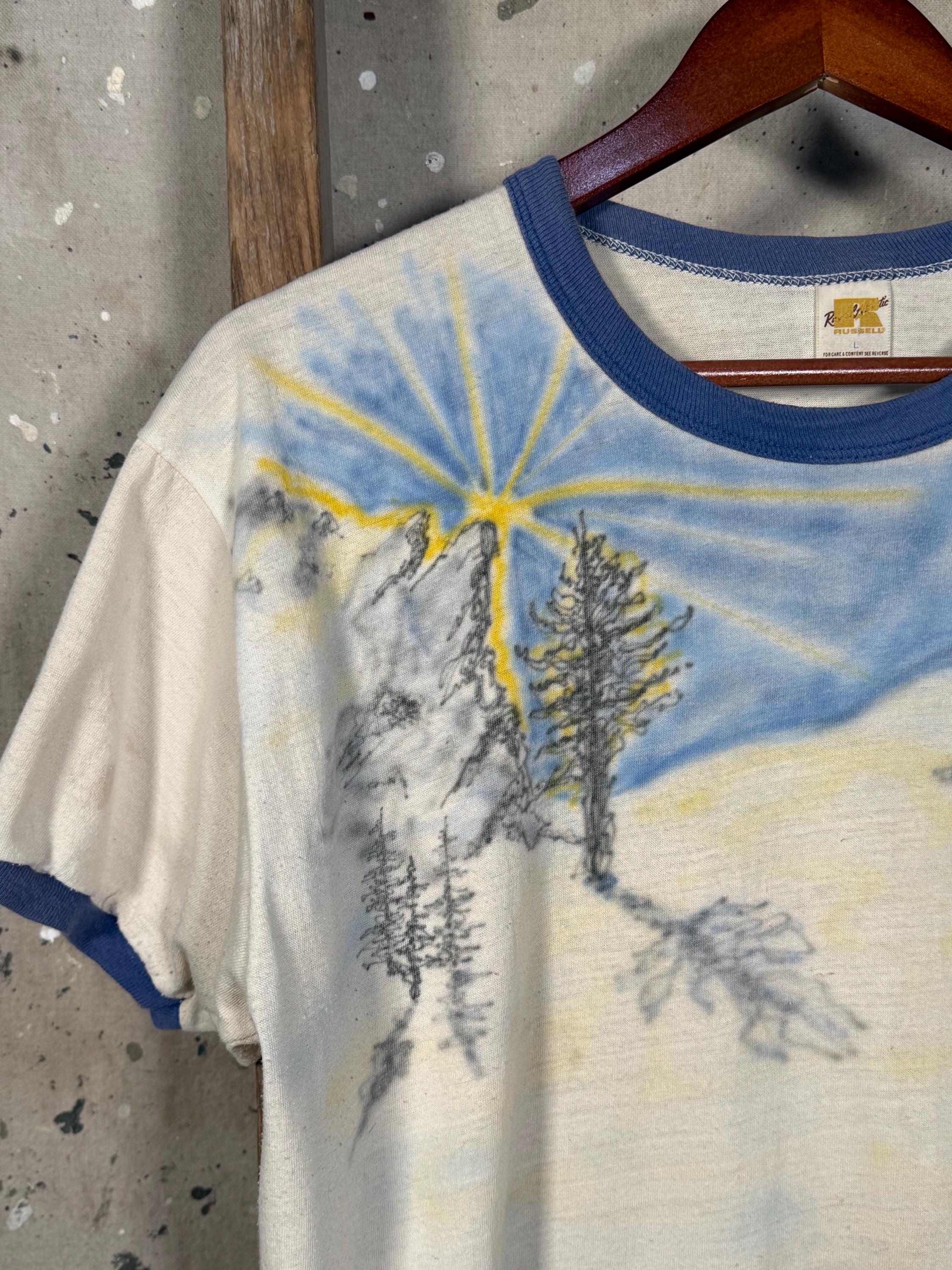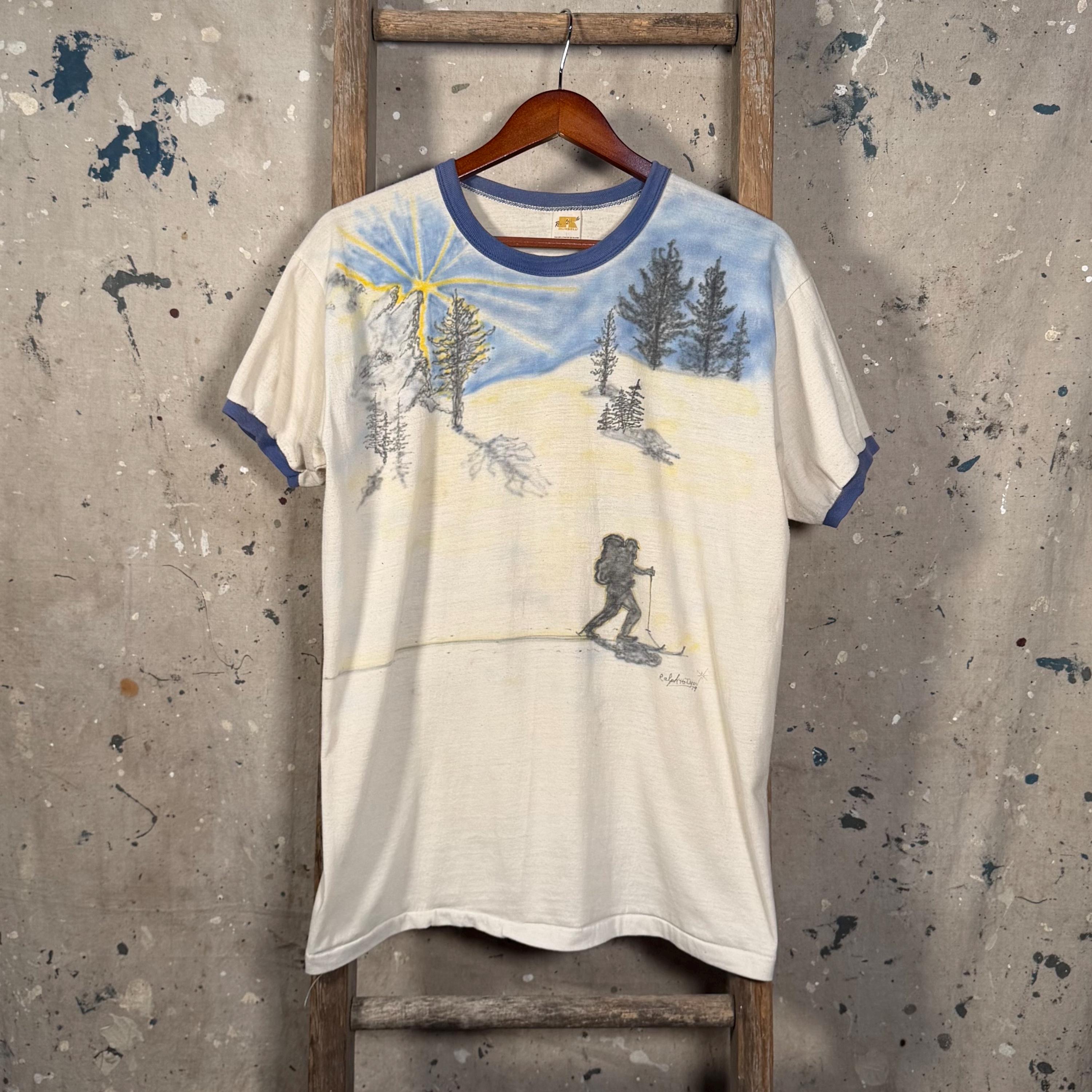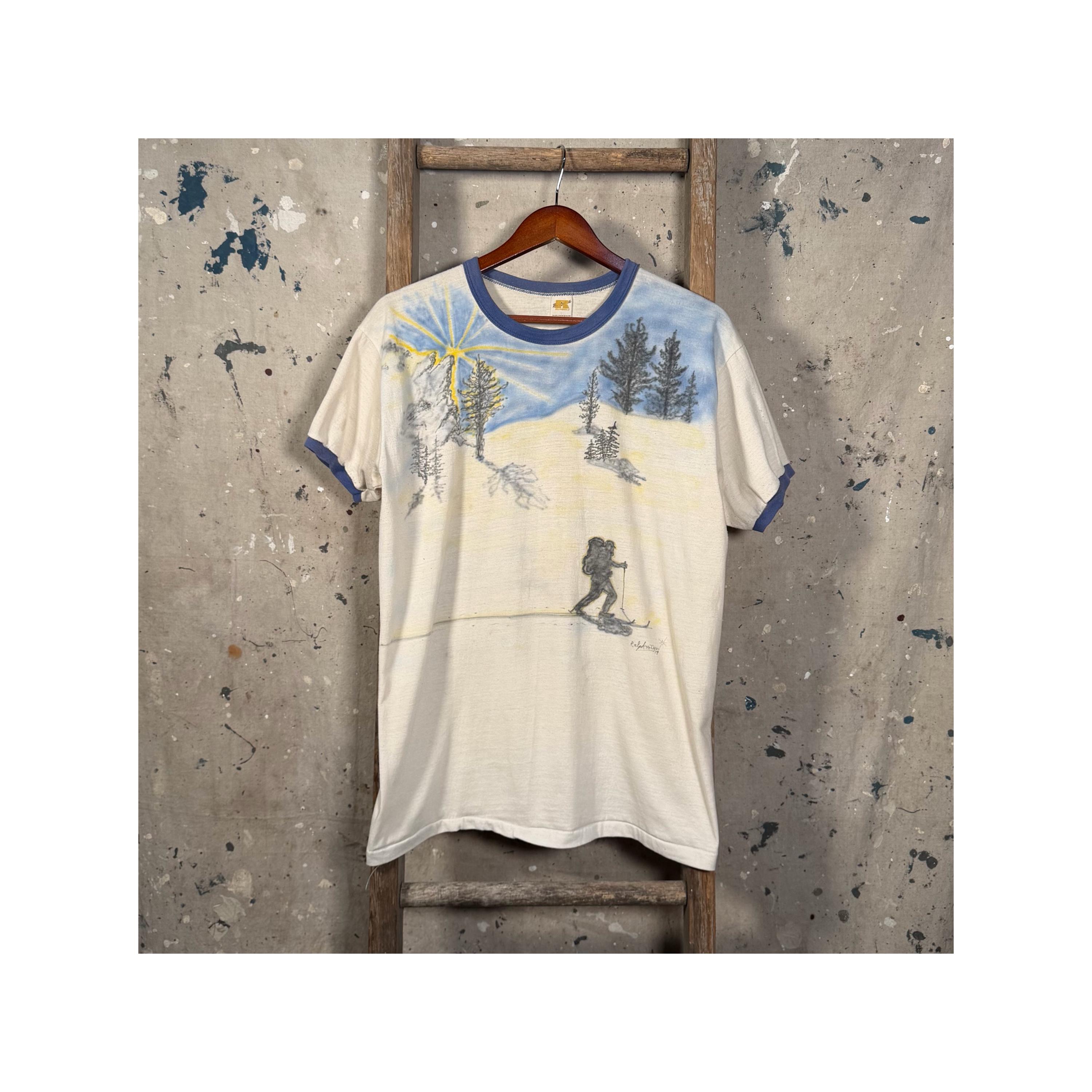 Hand drawn / air brushed 1970s ski shirt. One of a kind , illustrated ski sunset scene . Paper thin ringer tee, natural distressing , good condition - see photos.