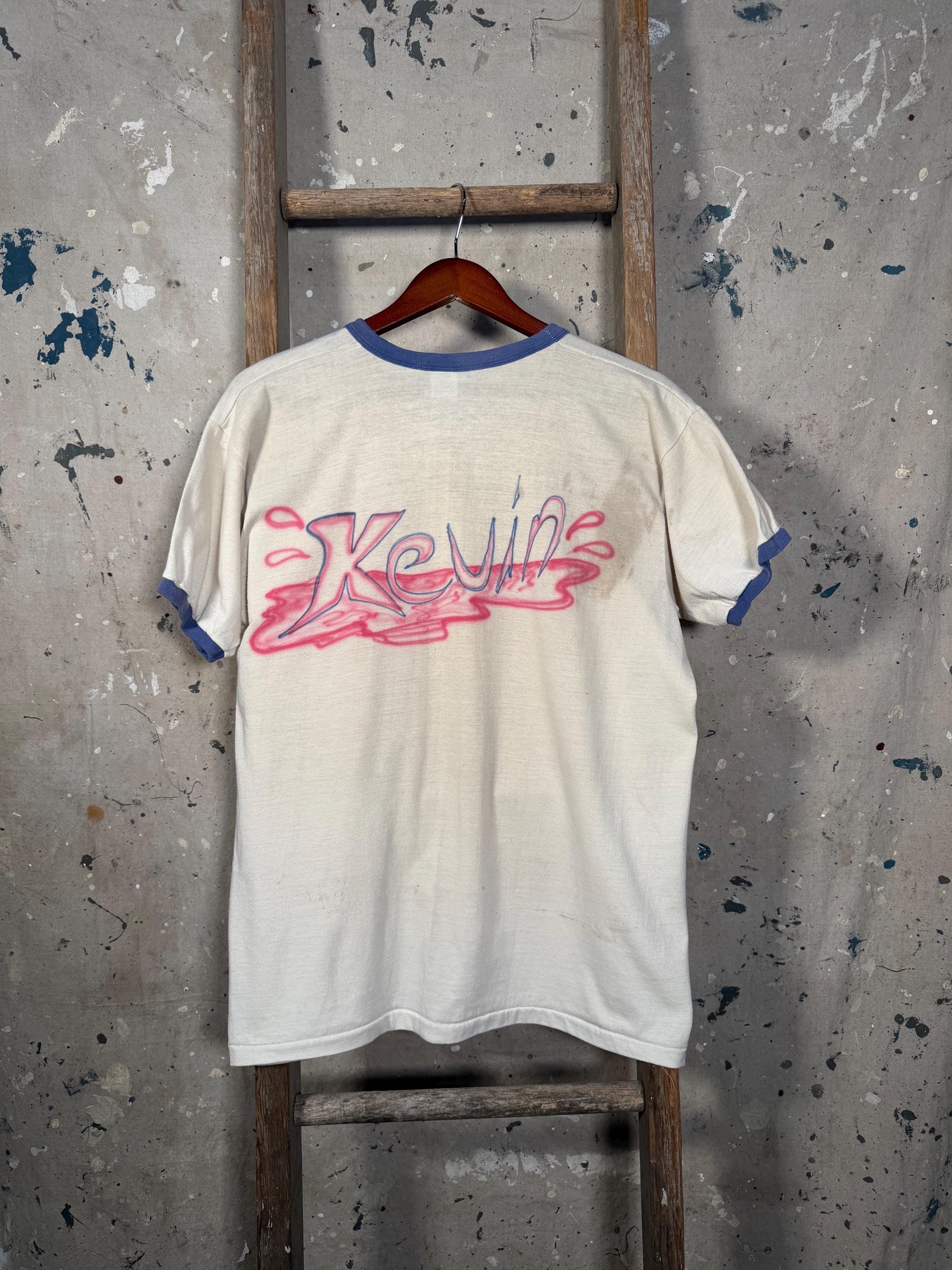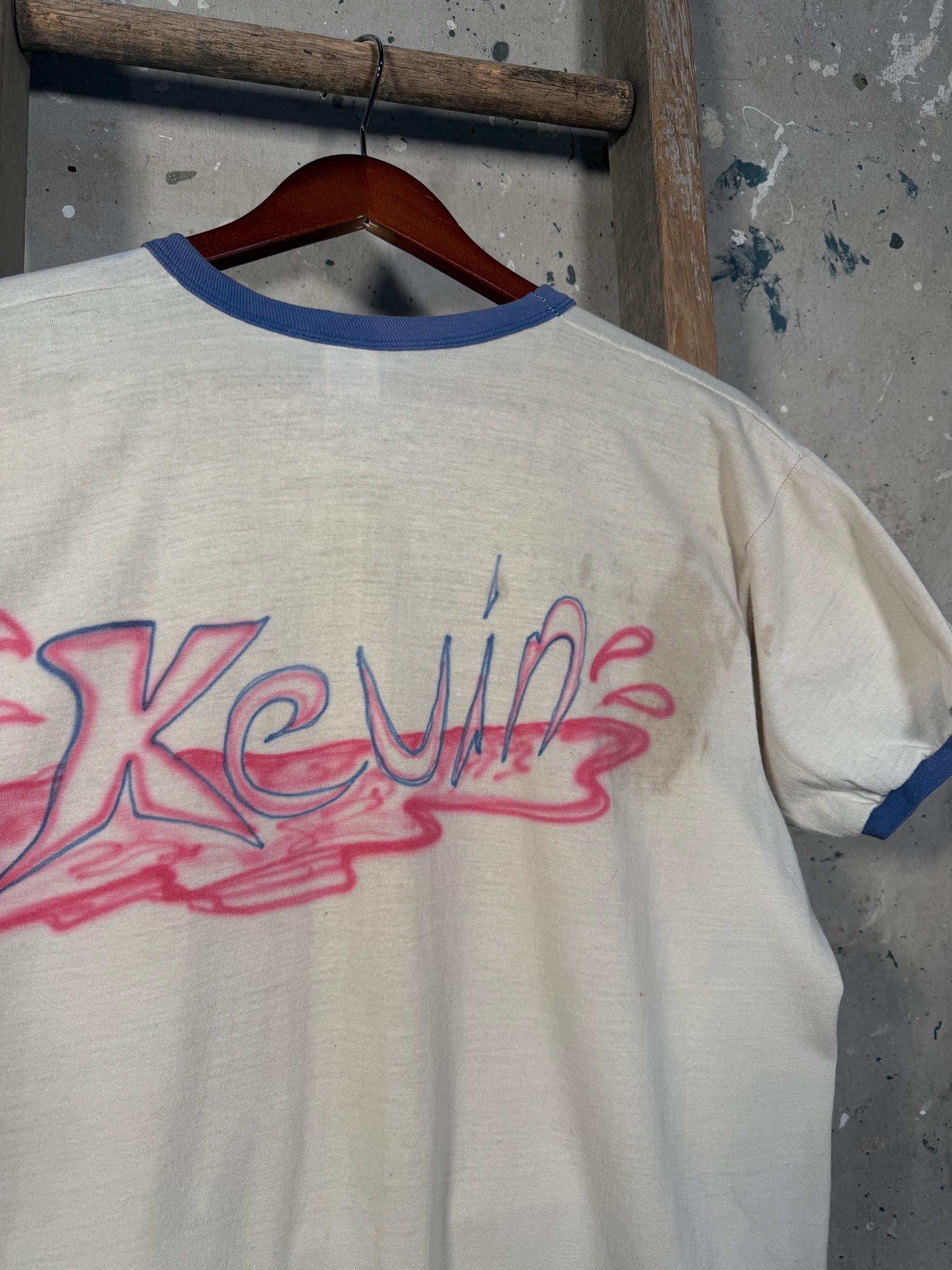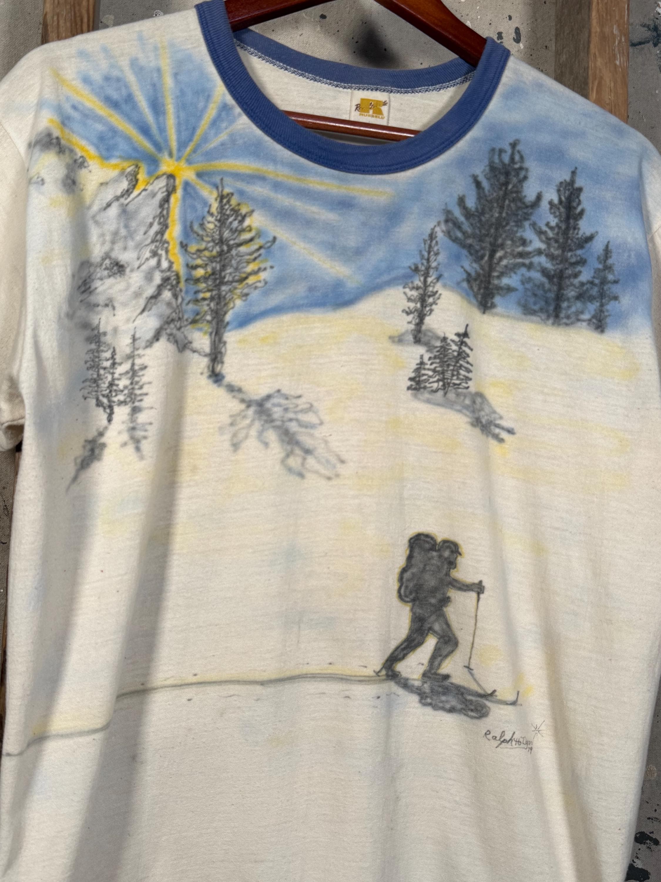 Hand drawn / air brushed 1970s ski shirt. One of a kind , illustrated ski sunset scene . Paper thin ringer tee, natural distressing , good condition - see photos.