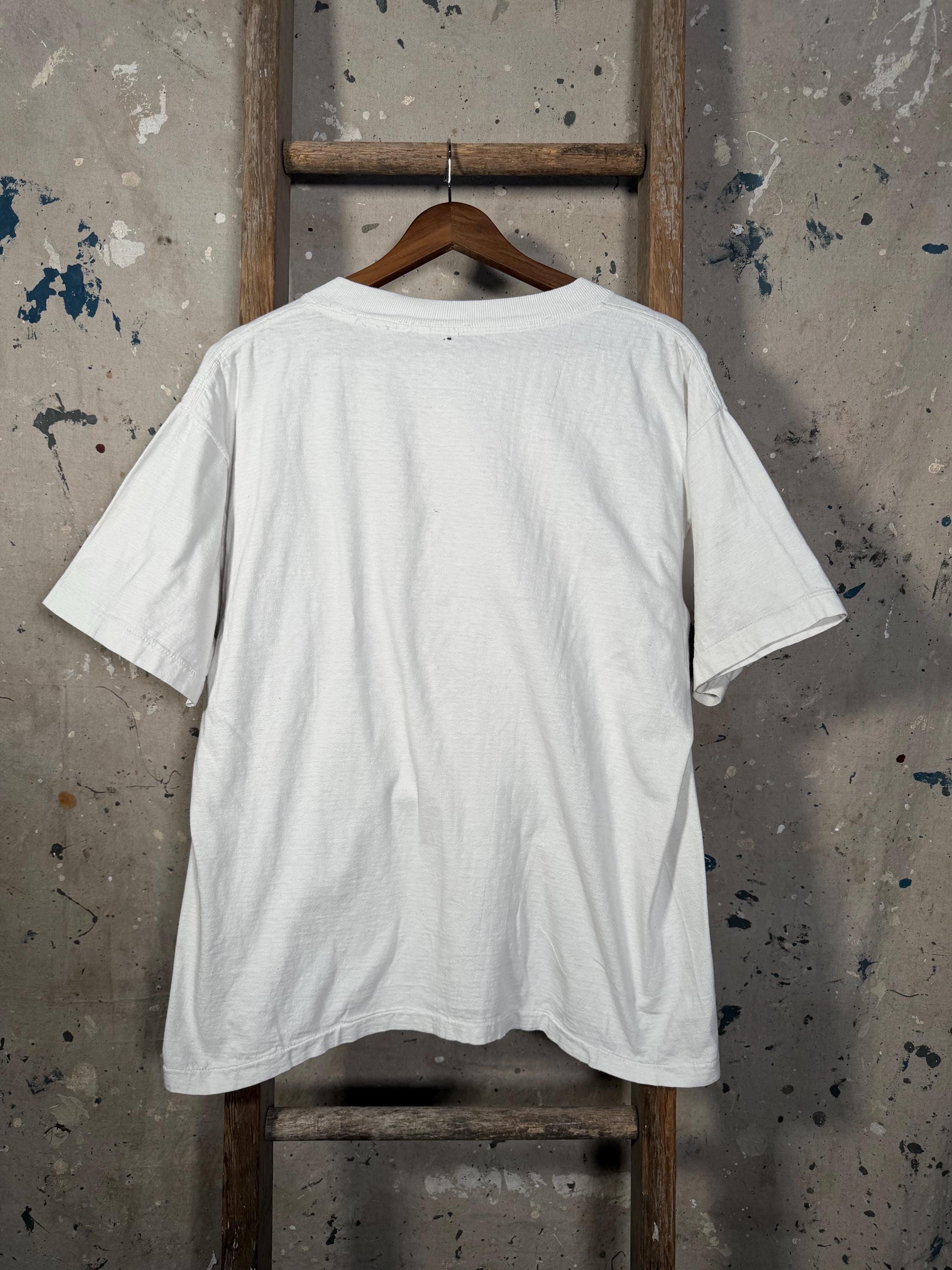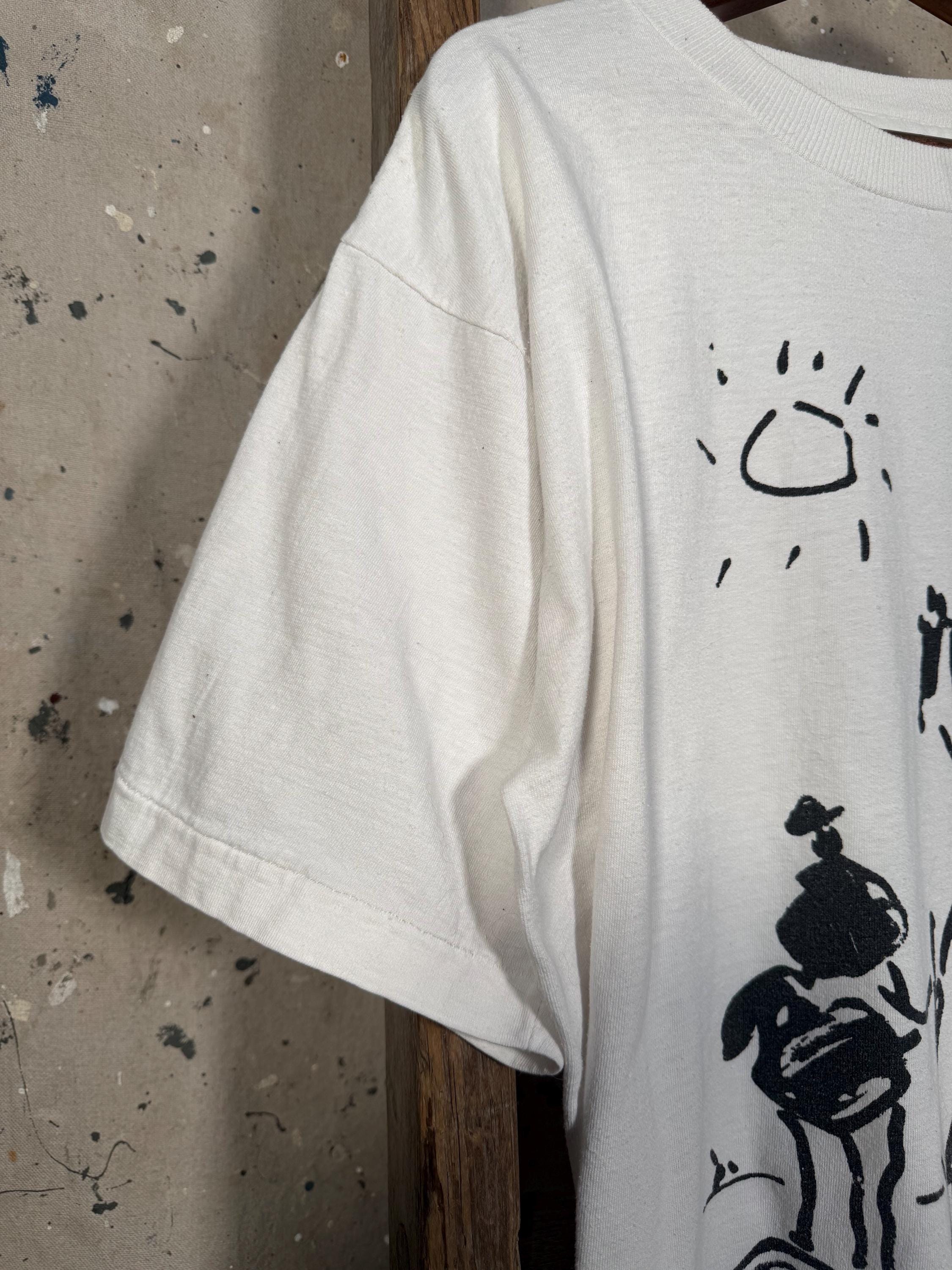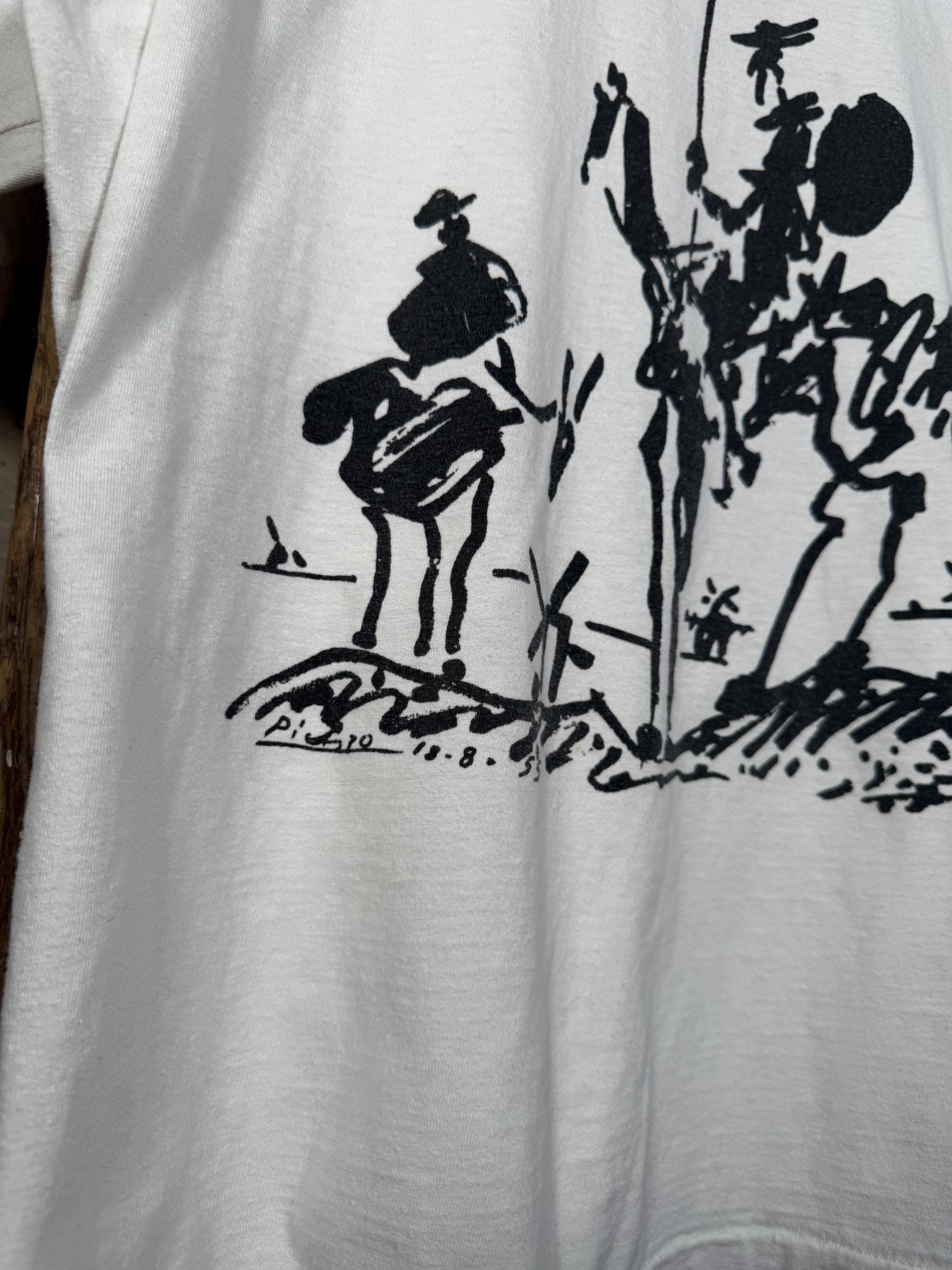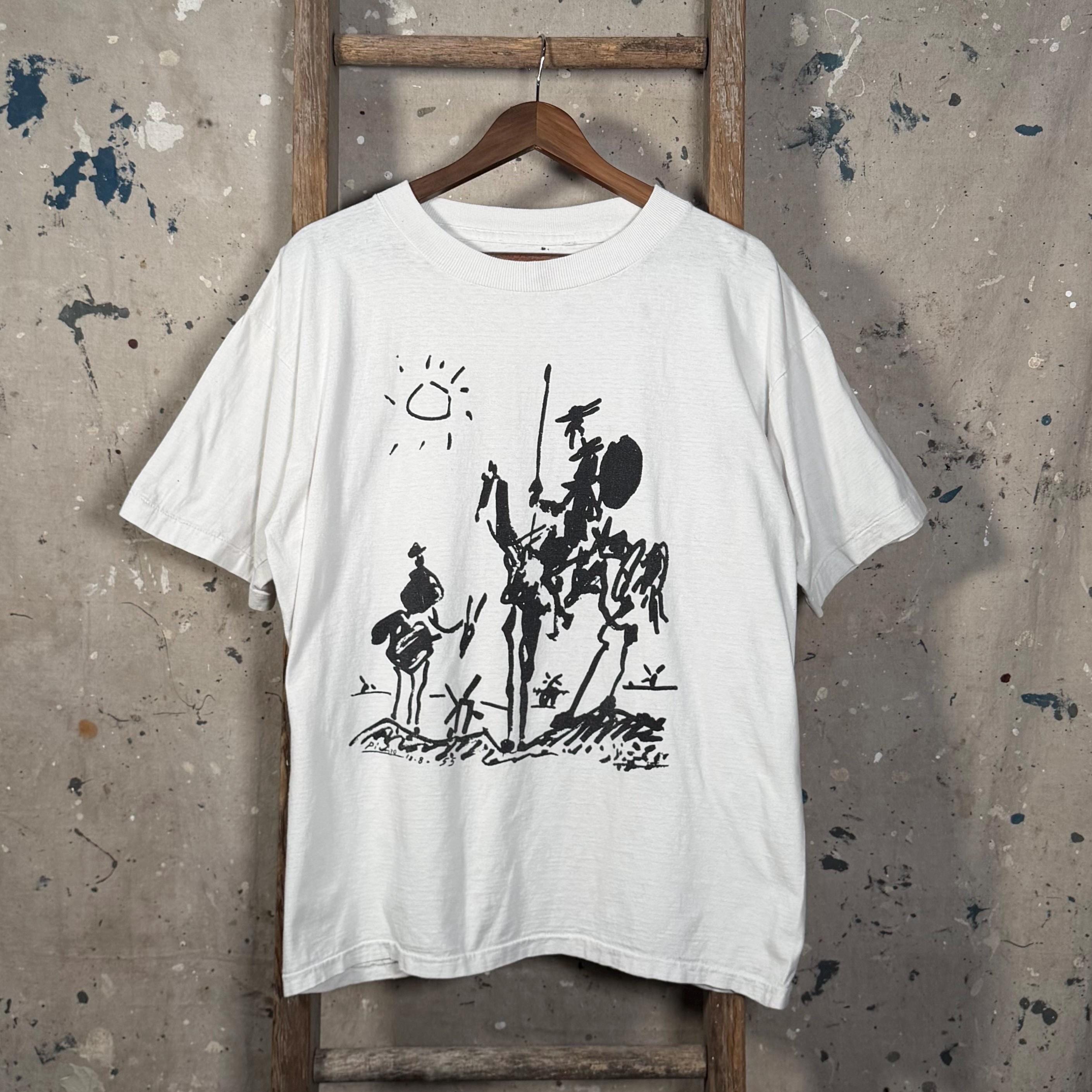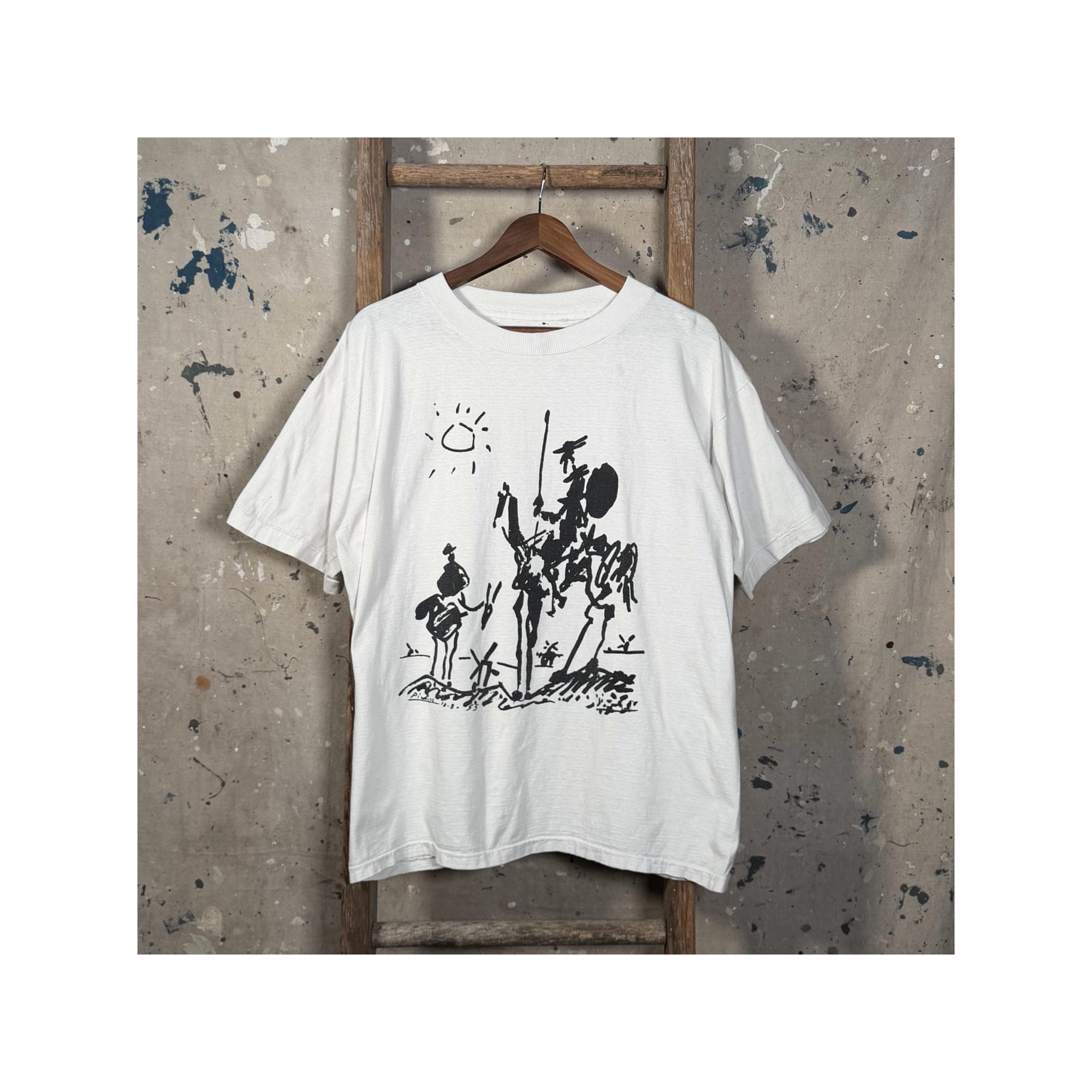 1990s Picasso Art T-Shirt. Features chest graphic of Picasso's 1955 Don Quixote & Pancho Sanchez Painting. Nice loose fit , soft all cotton tee. Good vintage condition , natural distressing throughout, some pinholes. See photos.