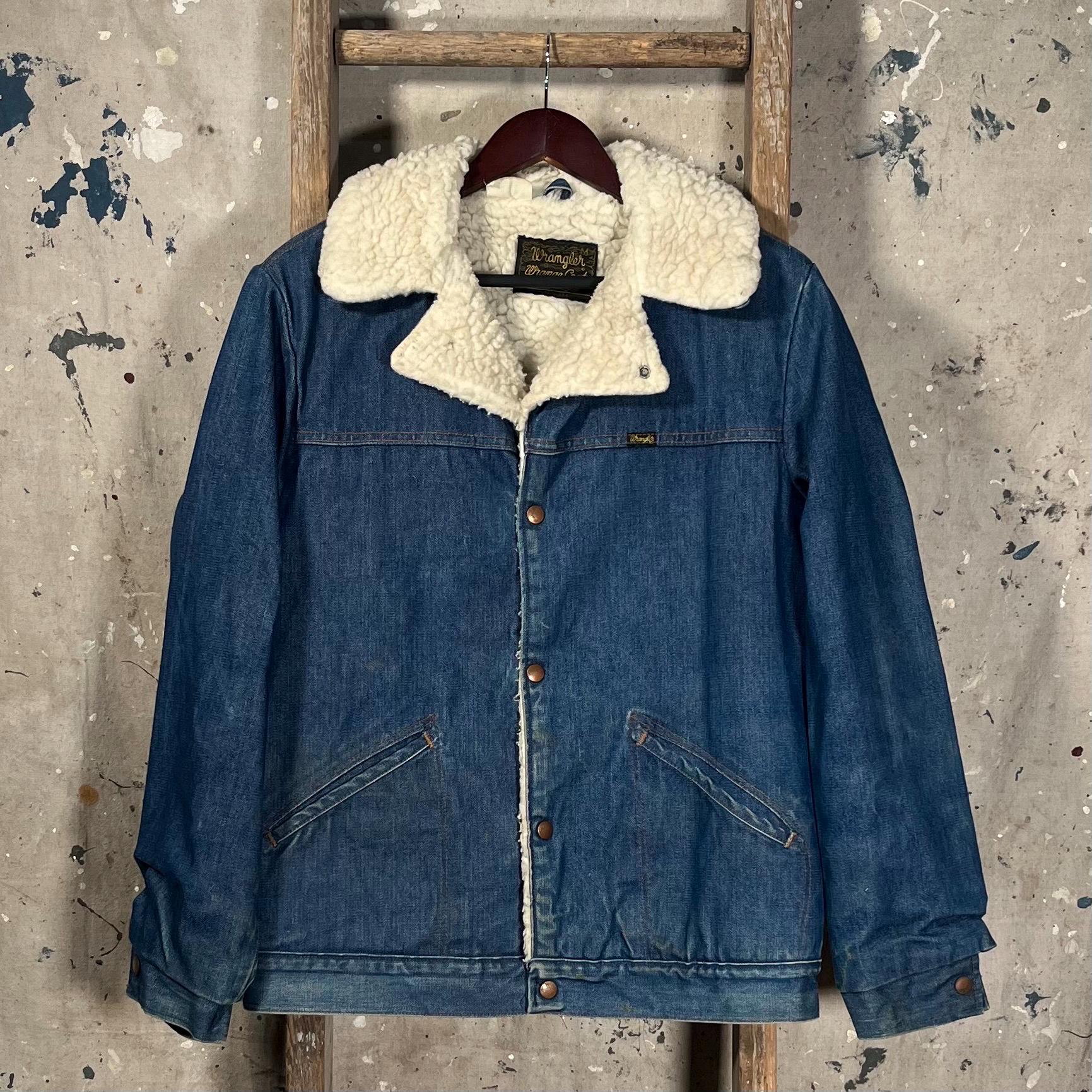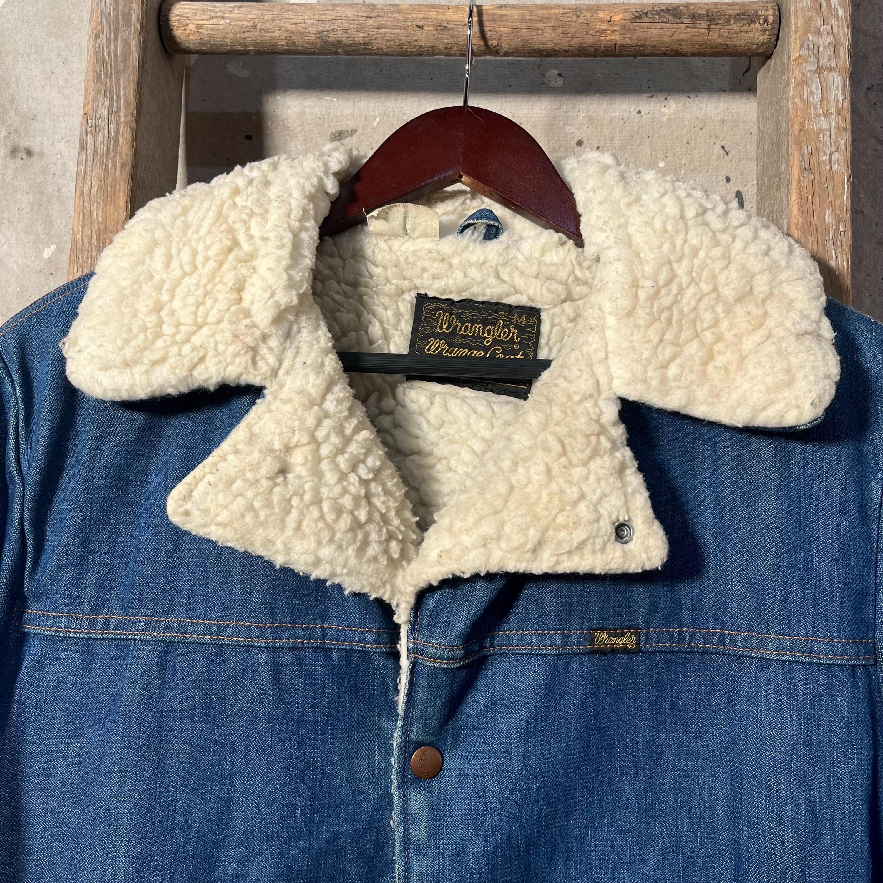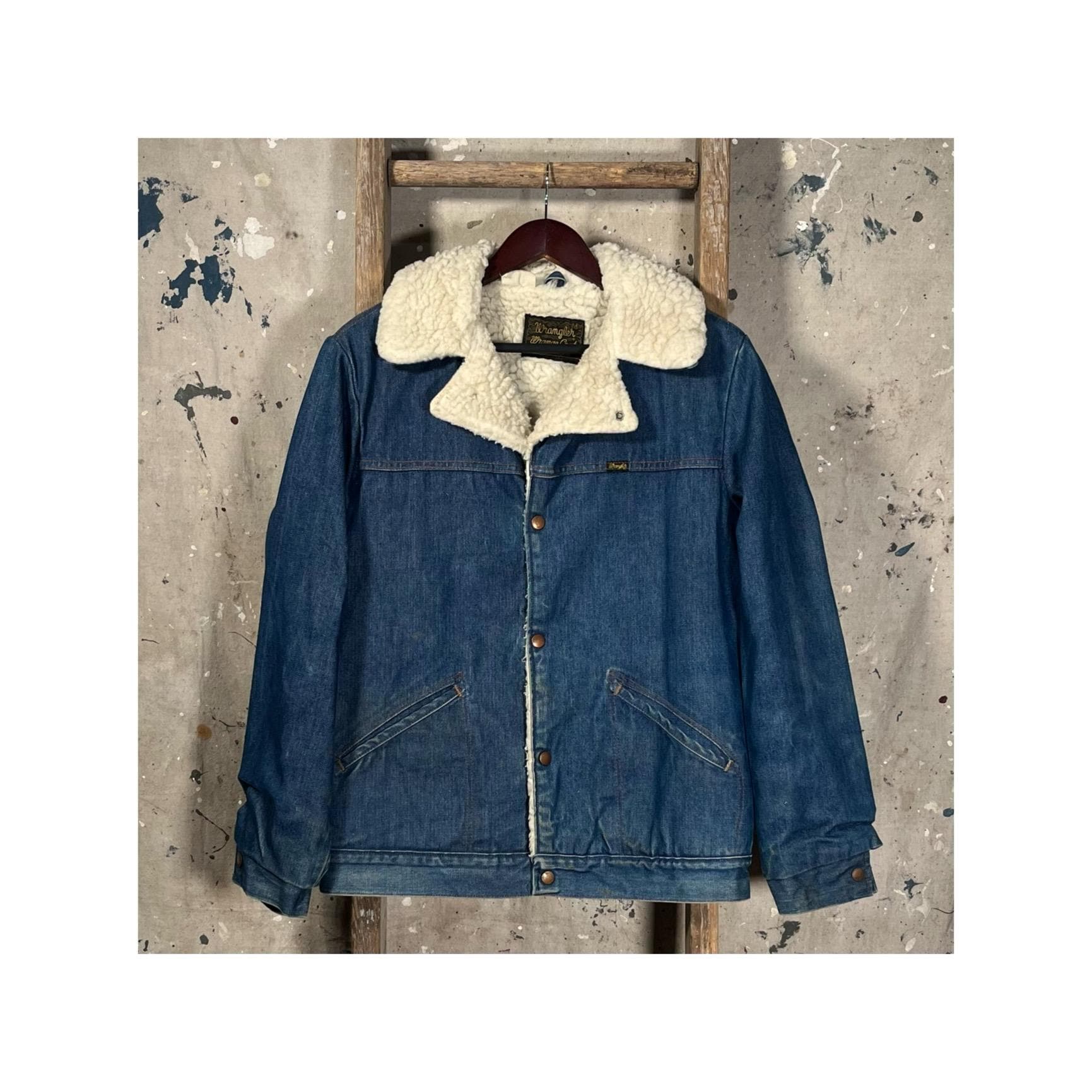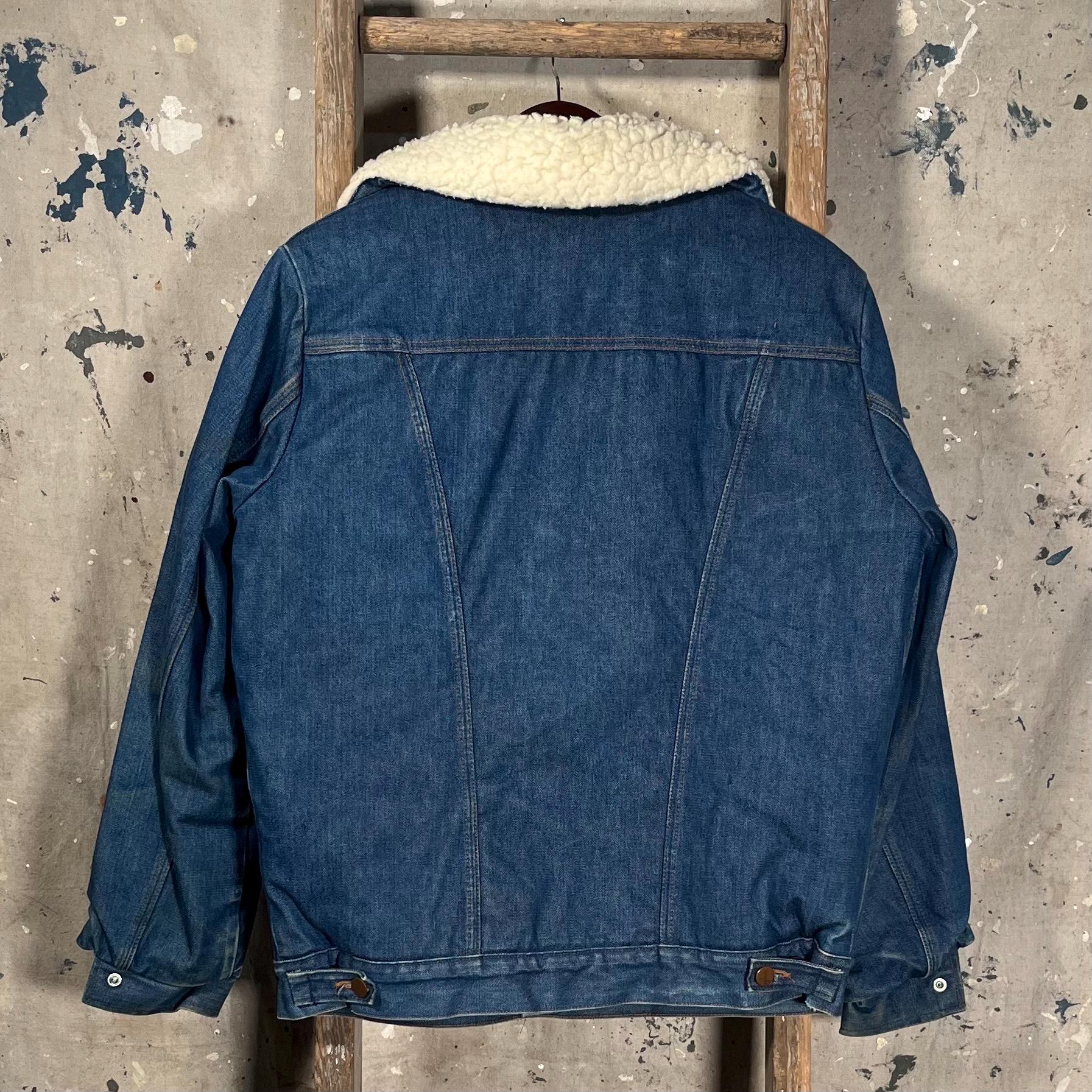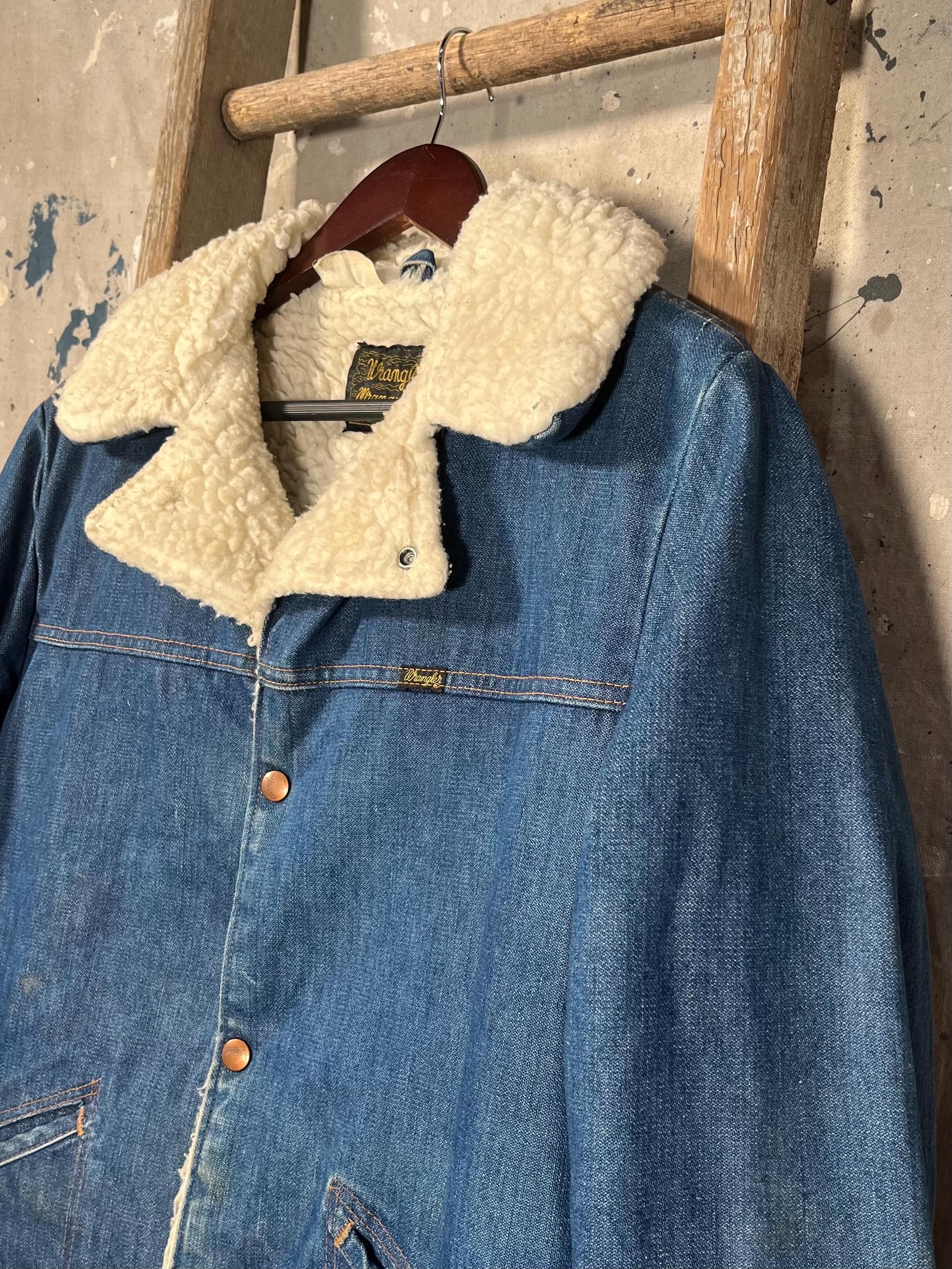 1970s Denim "Wrange jacket" by Wrangler. Sherpa lined with a heavy 13 ounce denim shell . Made in USA. Good condition, natural distressing throughout , see photos .