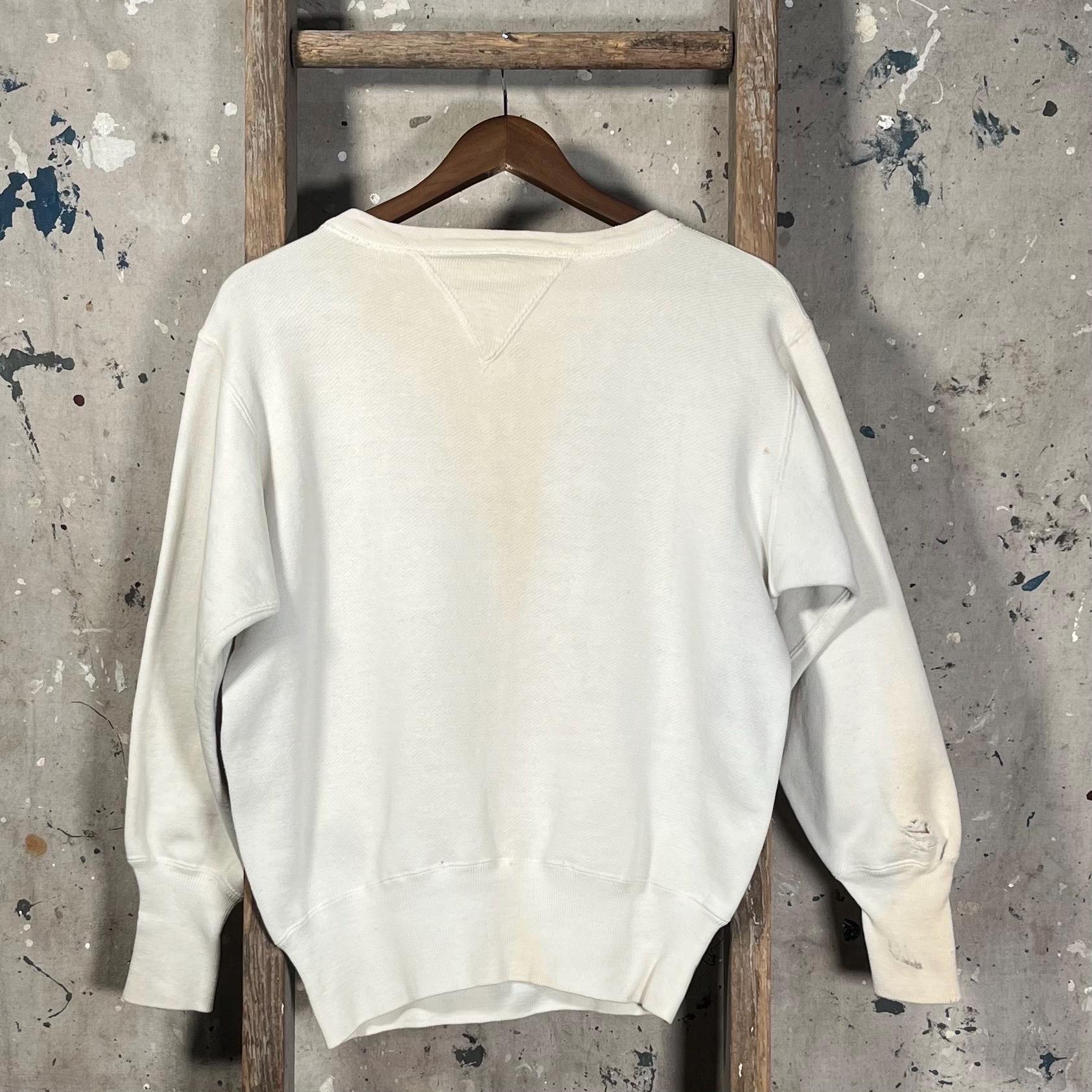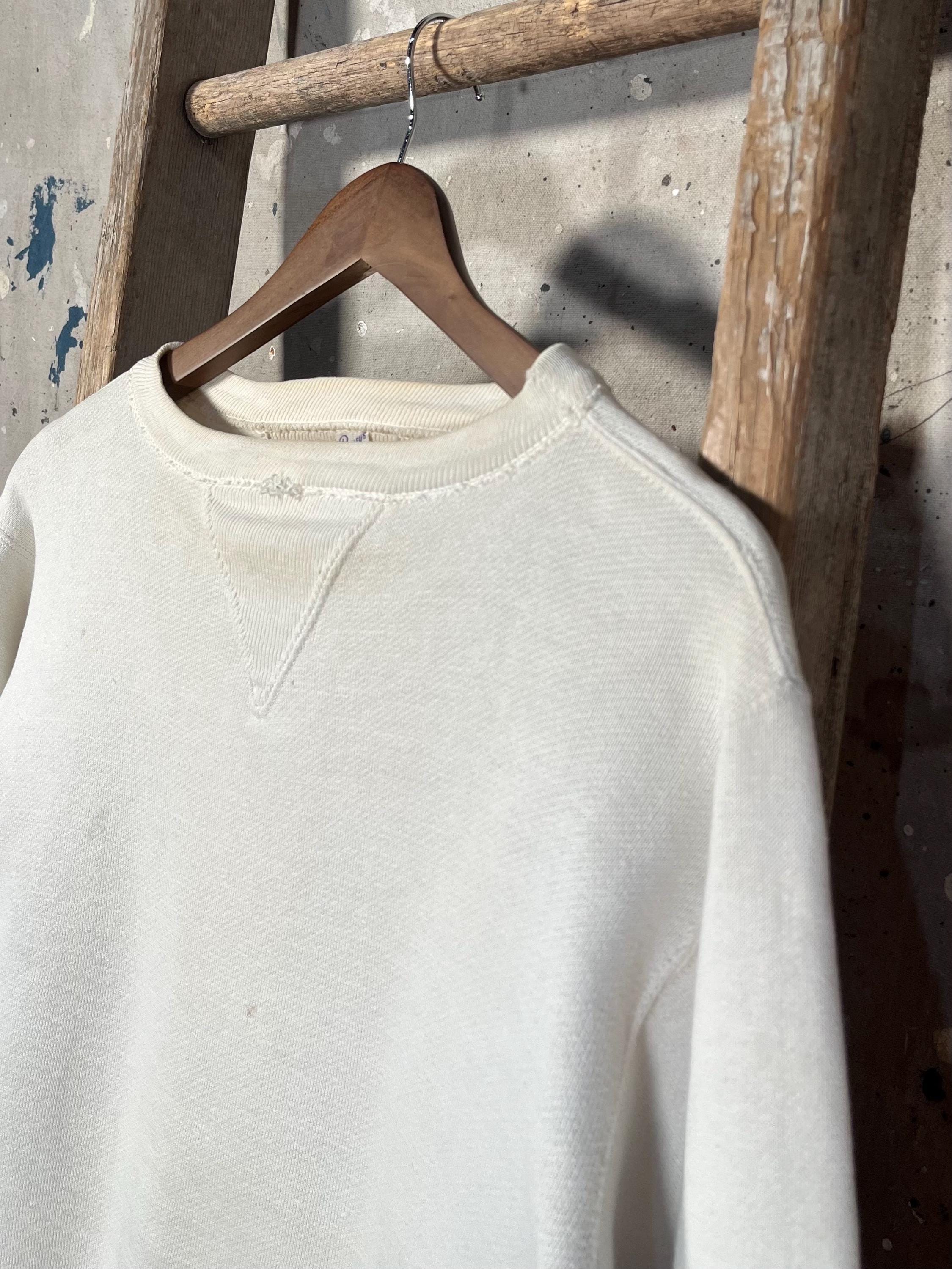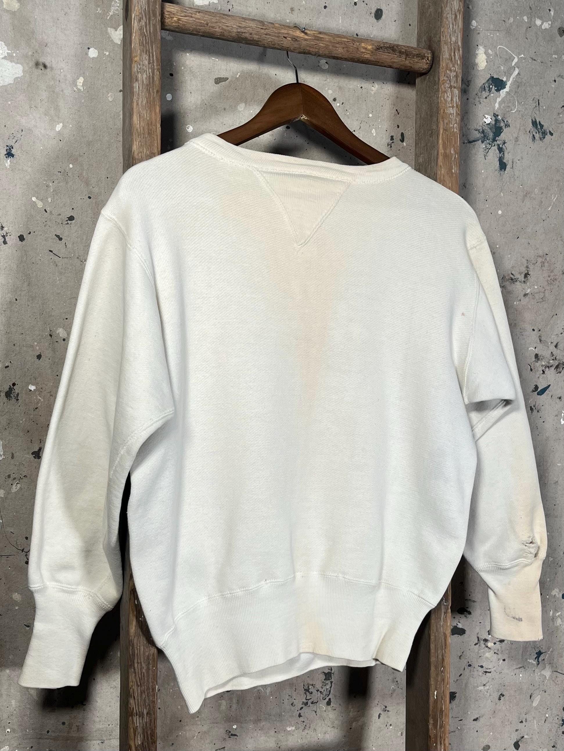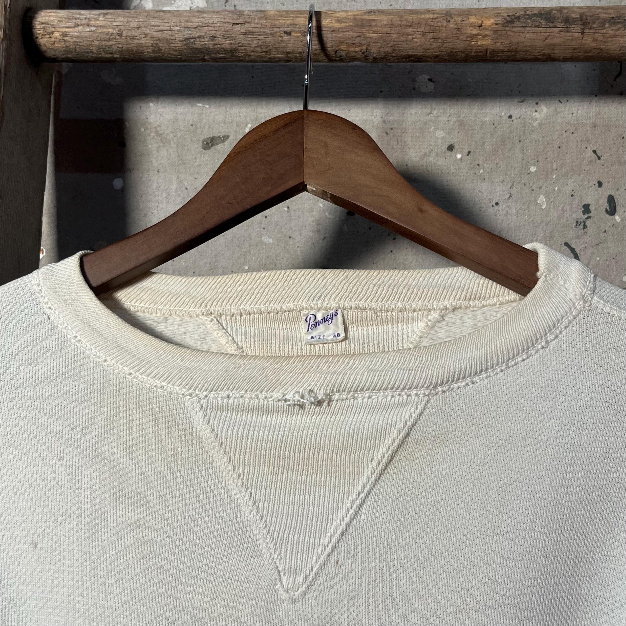1940s Sweatshirt by Penneys. Attached sleeve crewneck with wide ribbed waist band and sleeve cuffs. Natural distressing , good condition . See photos .