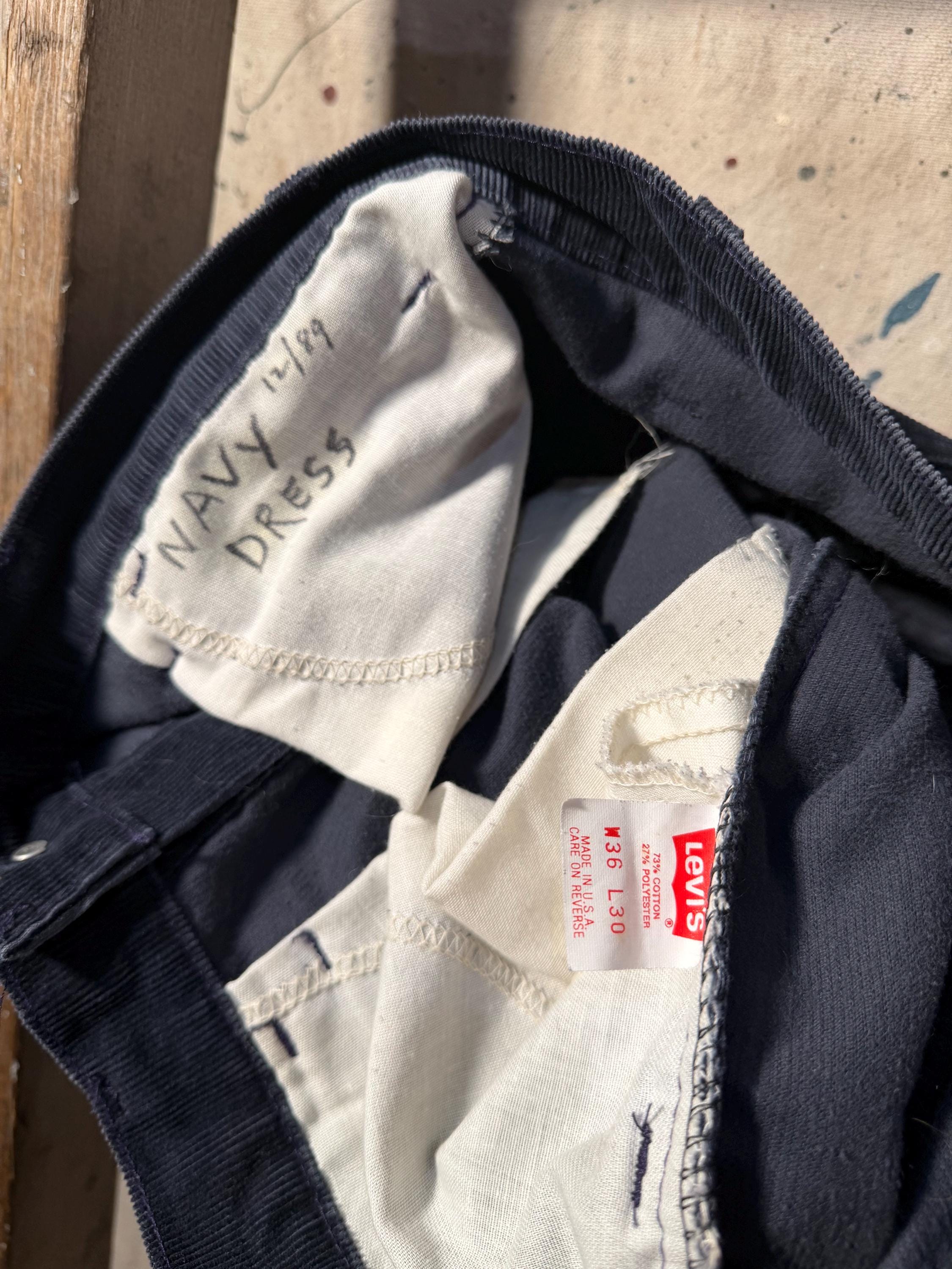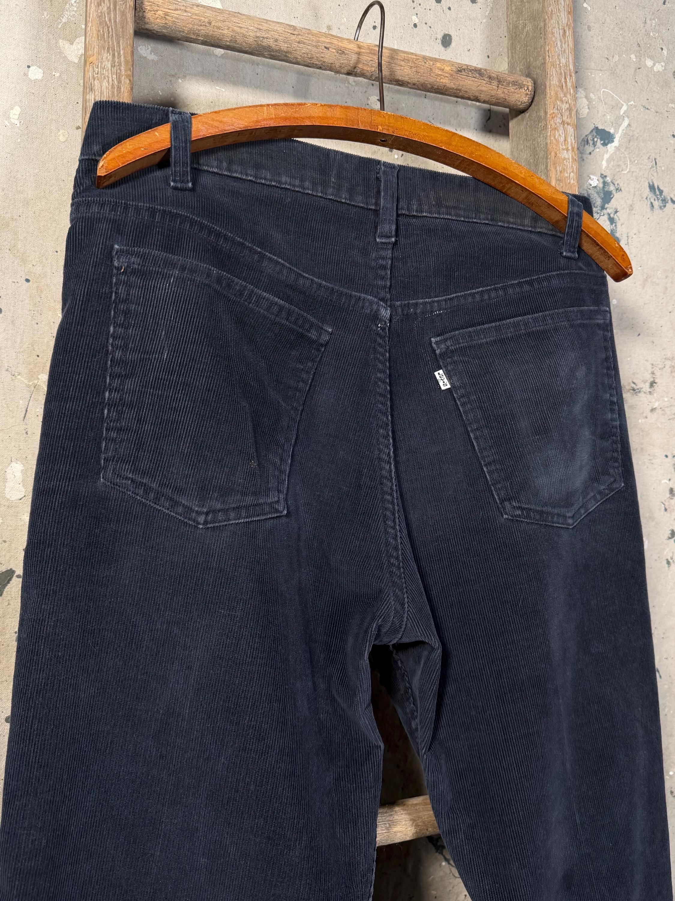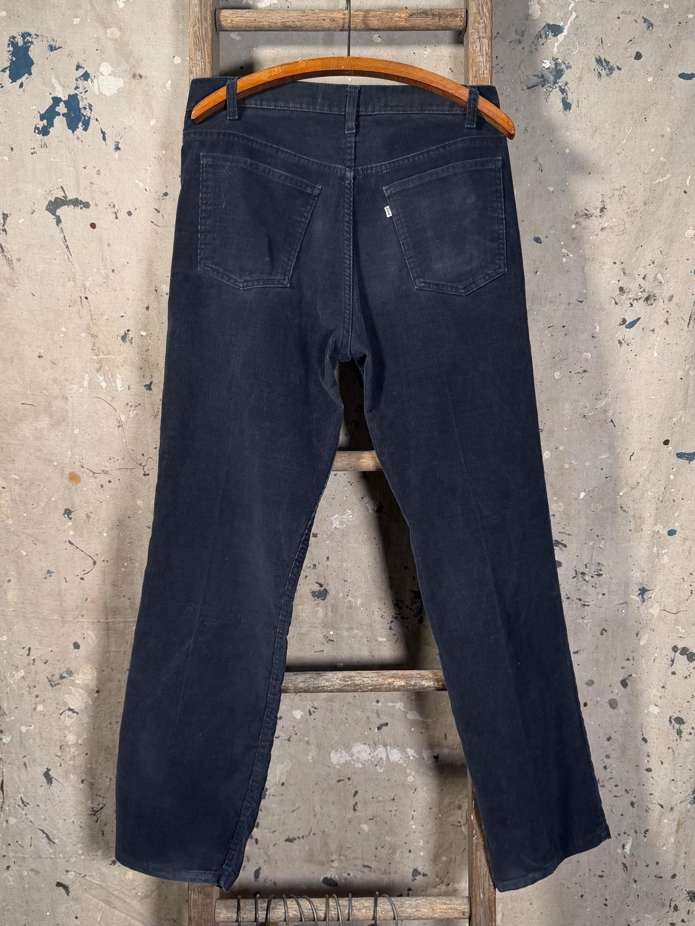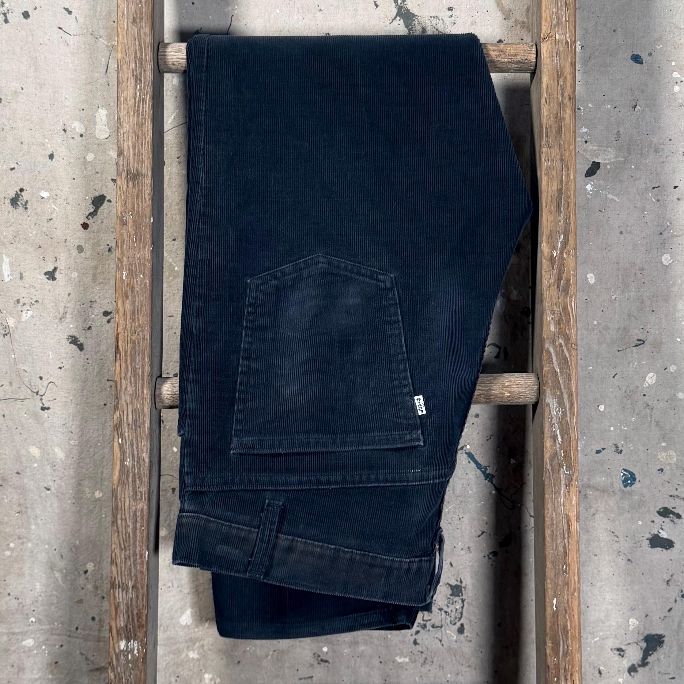 1970s Levi's 519 corduroy pants. Navy Blue, straight leg, white tab Levi's. Nicely worn in with light fade. Good condition, regular wear throughout - see photos.