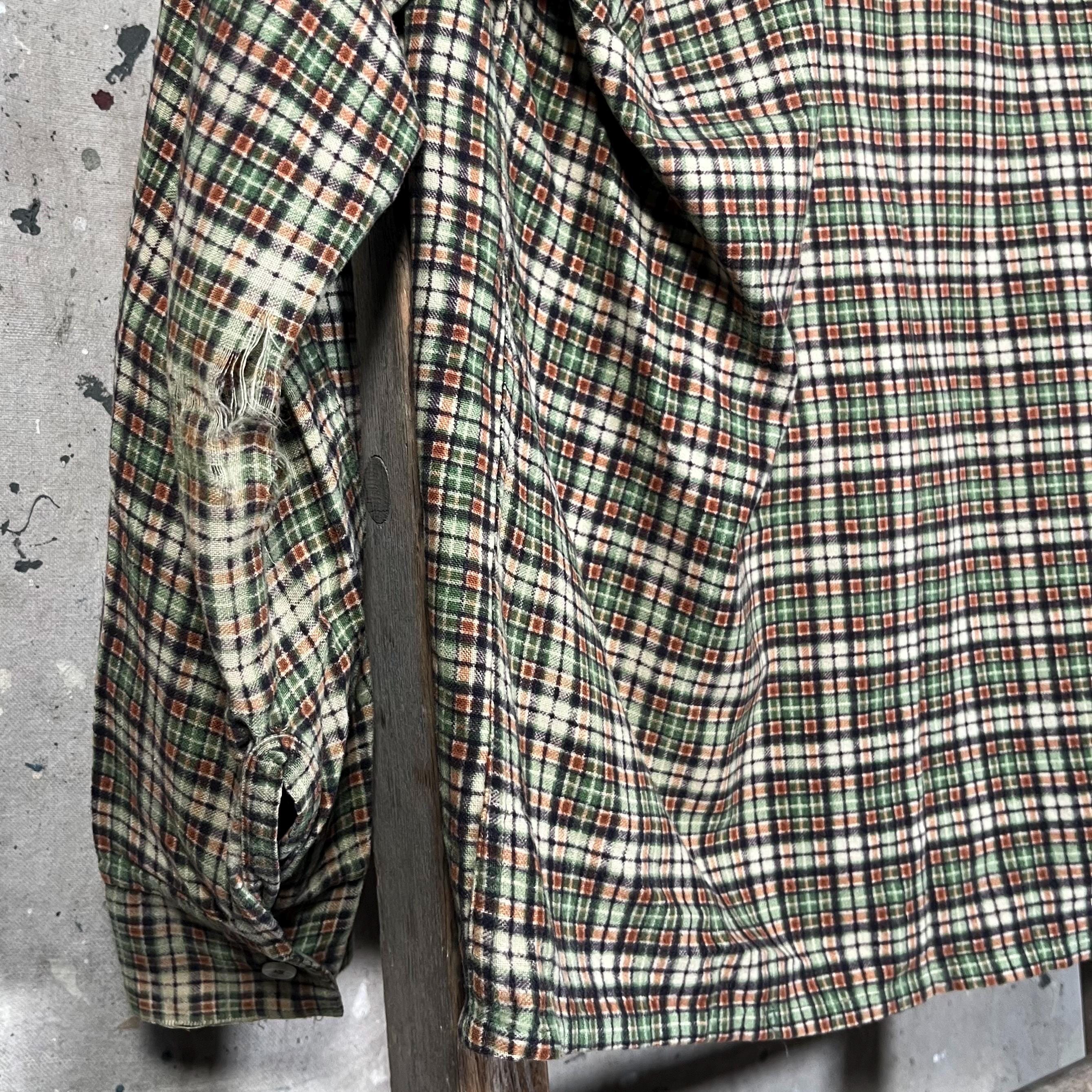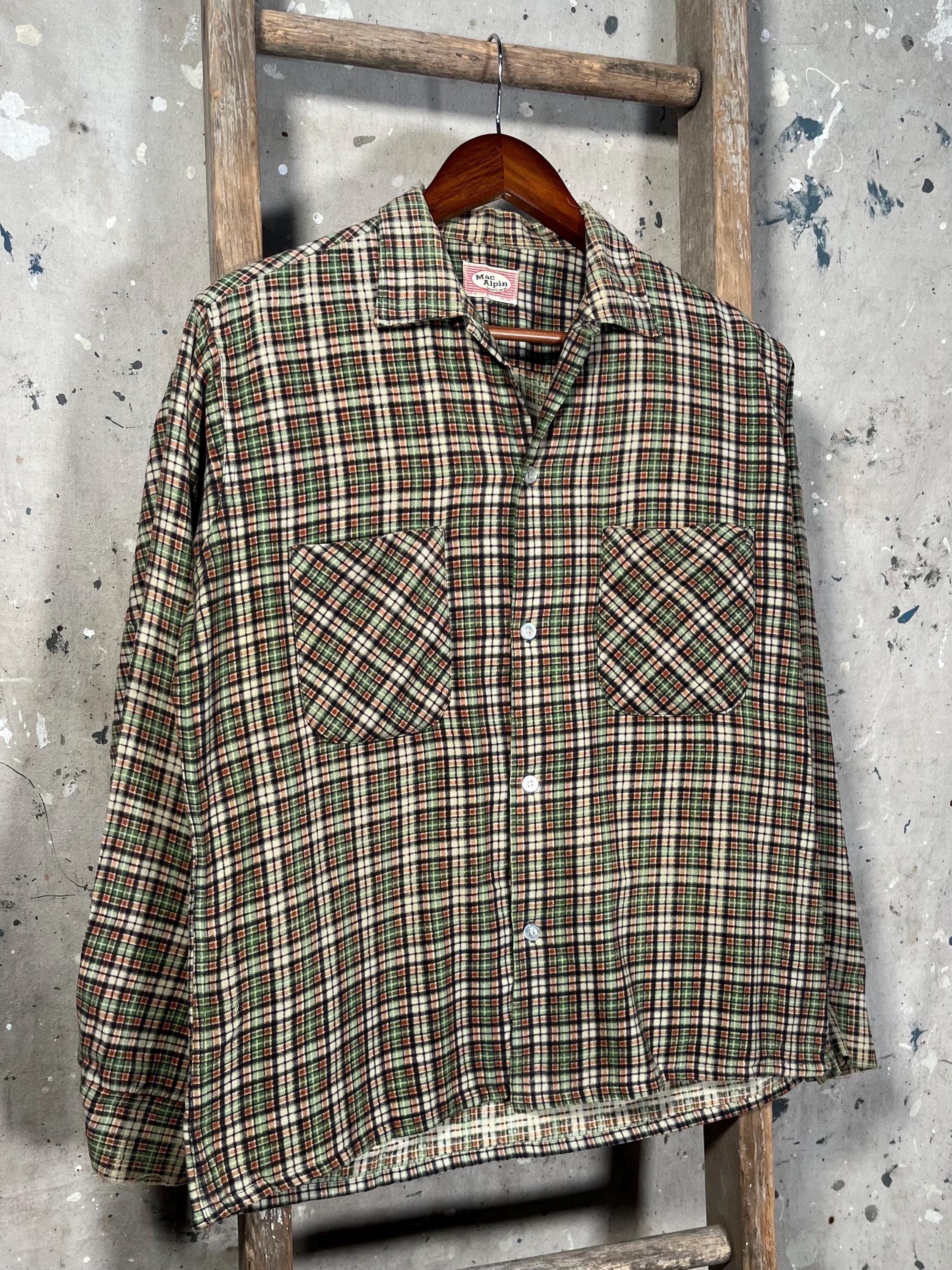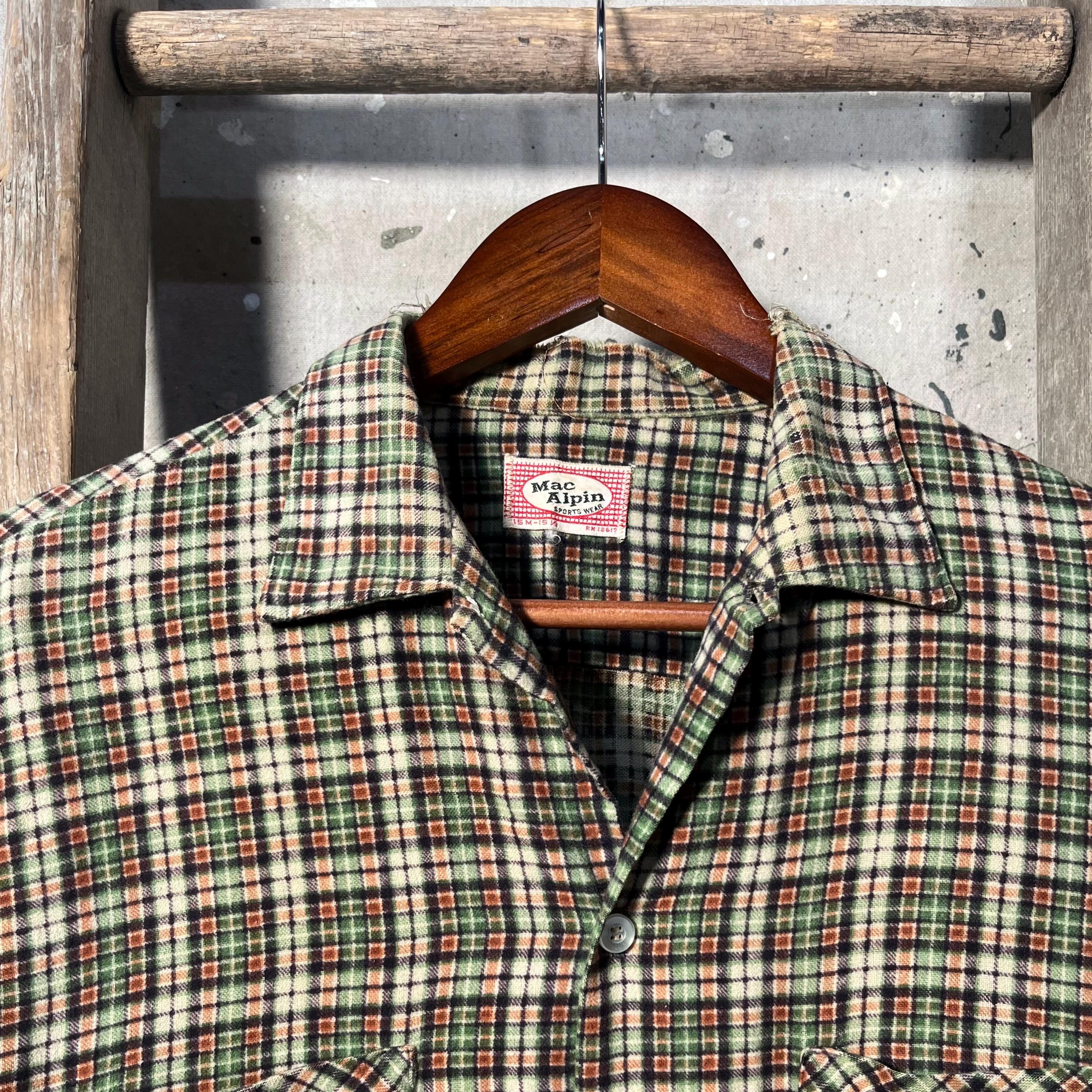 1950s cotton print flannel by Mac Alpin. Super soft , sanforized - 100% Cotton button down. Natural distressing throughout , around collar and elbows - see photos. Good condition.