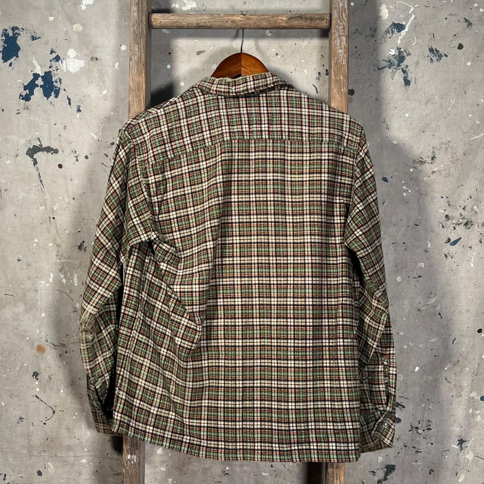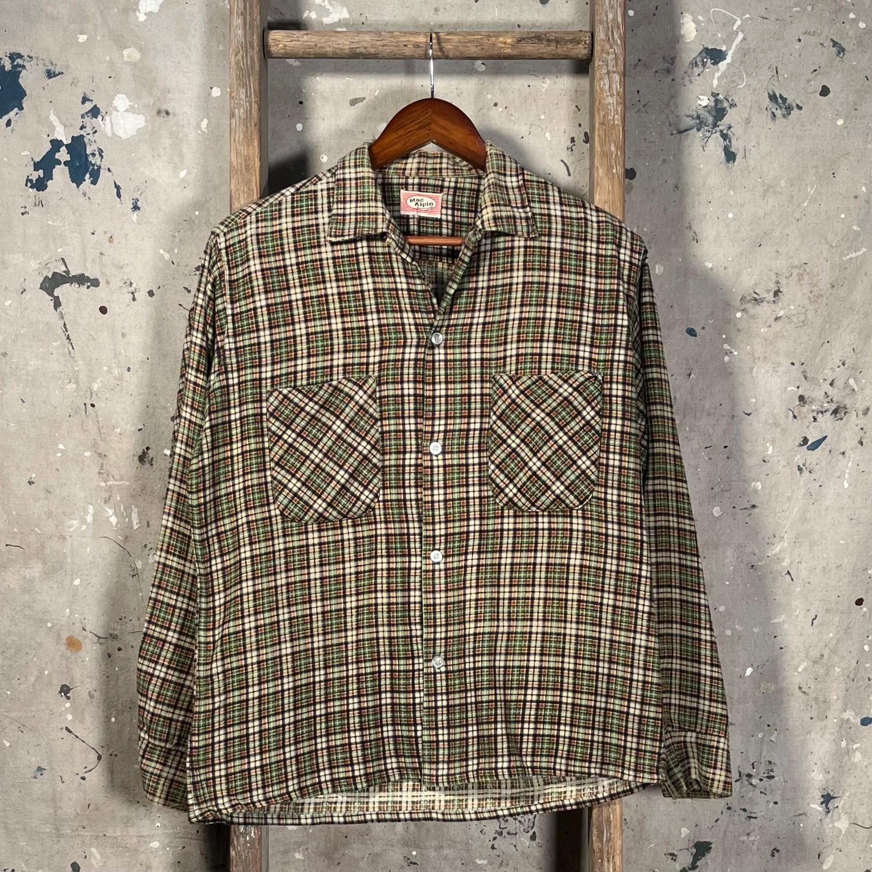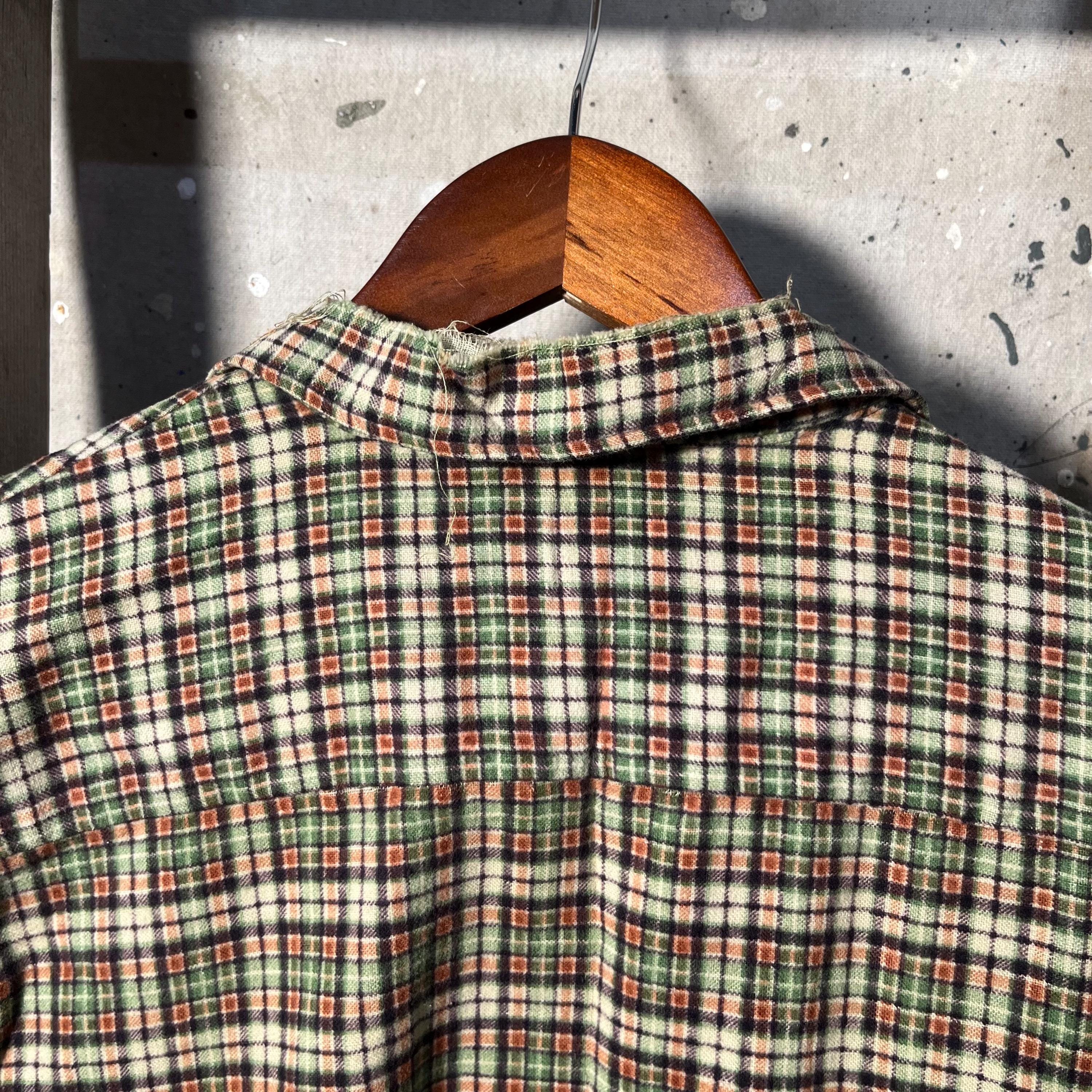 1950s cotton print flannel by Mac Alpin. Super soft , sanforized - 100% Cotton button down. Natural distressing throughout , around collar and elbows - see photos. Good condition.
