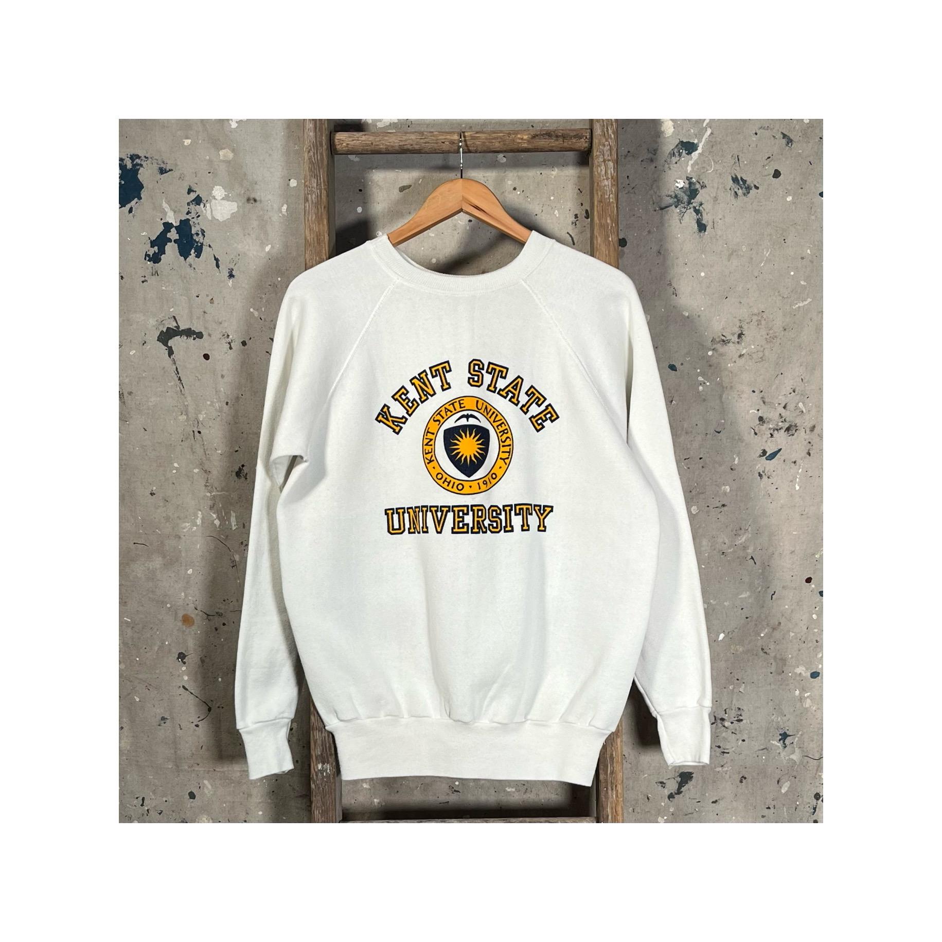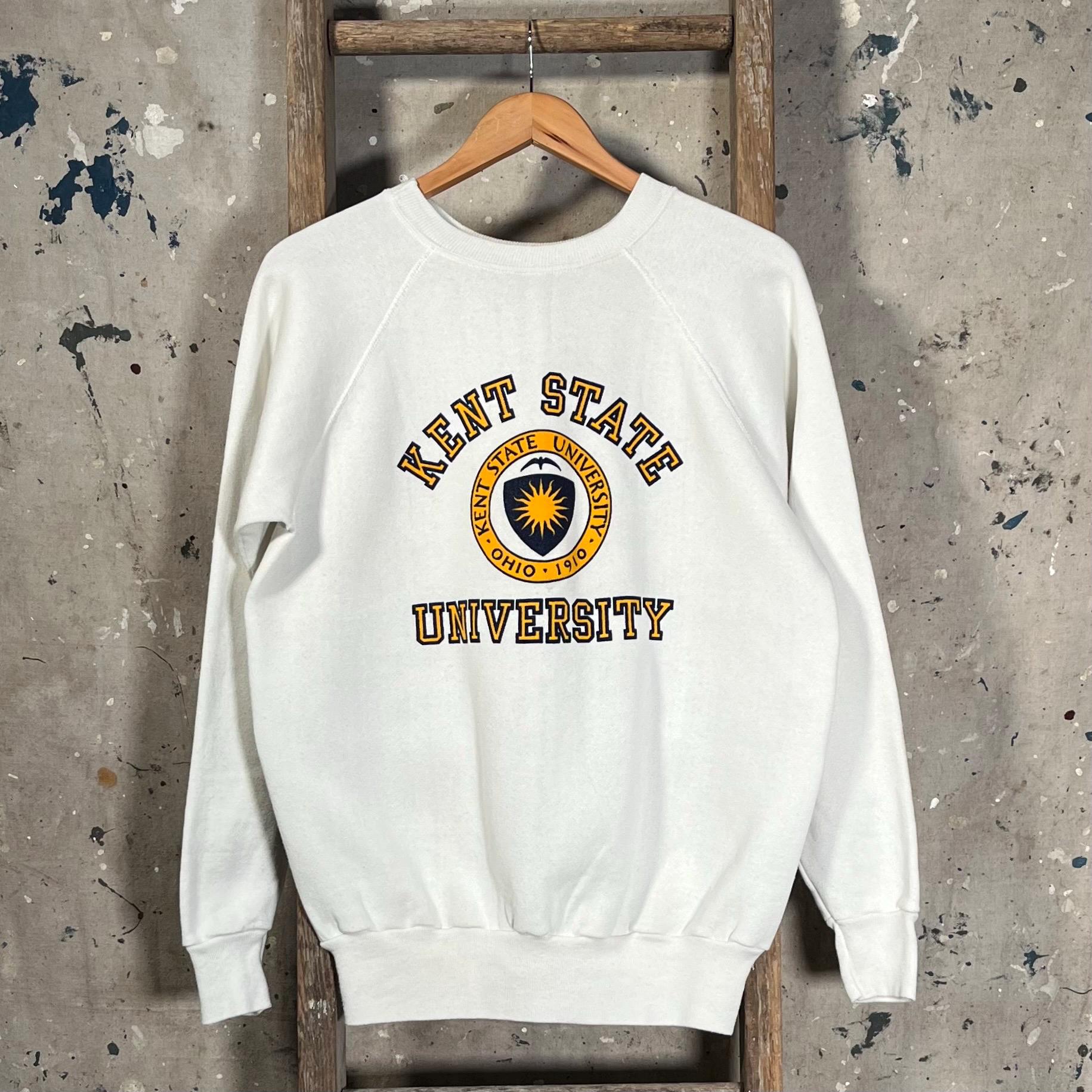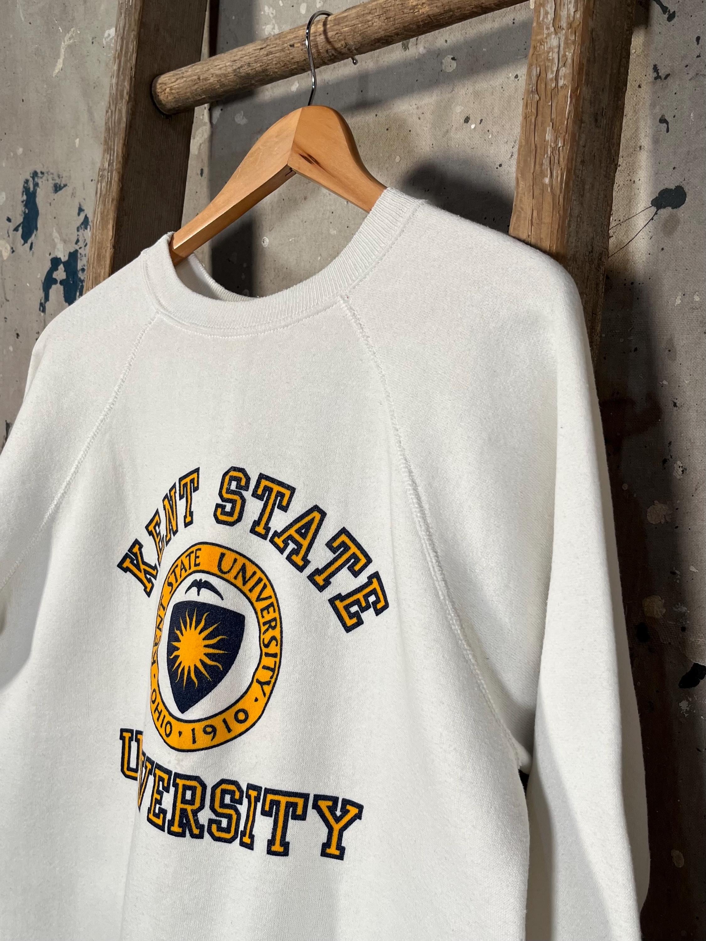 1980s Kent State University Raglan Sweatshirt by Velva Sheen. Features collegiate crest screen printed at chest. Made in USA. Good condition, natural distressing - see photos.