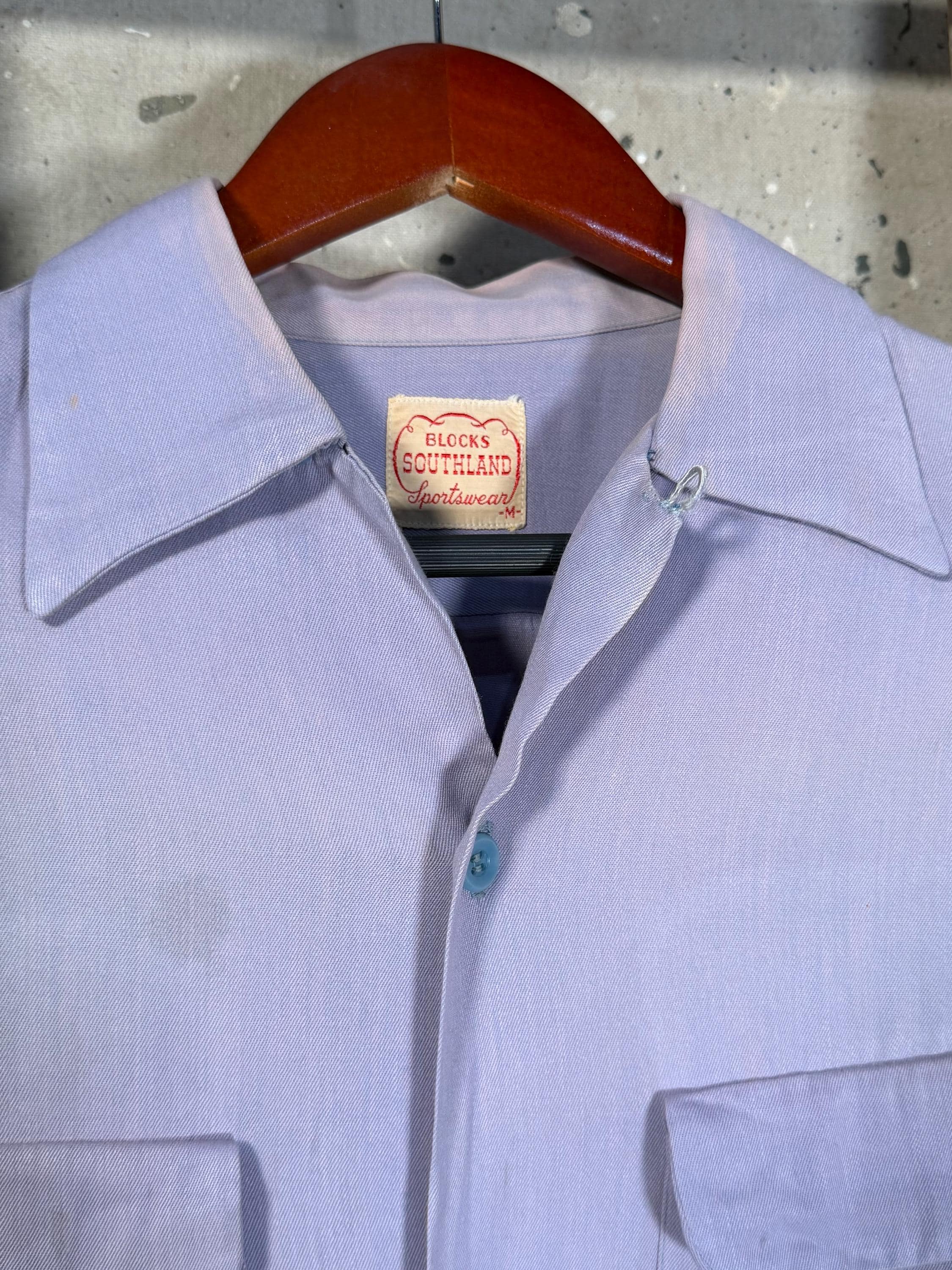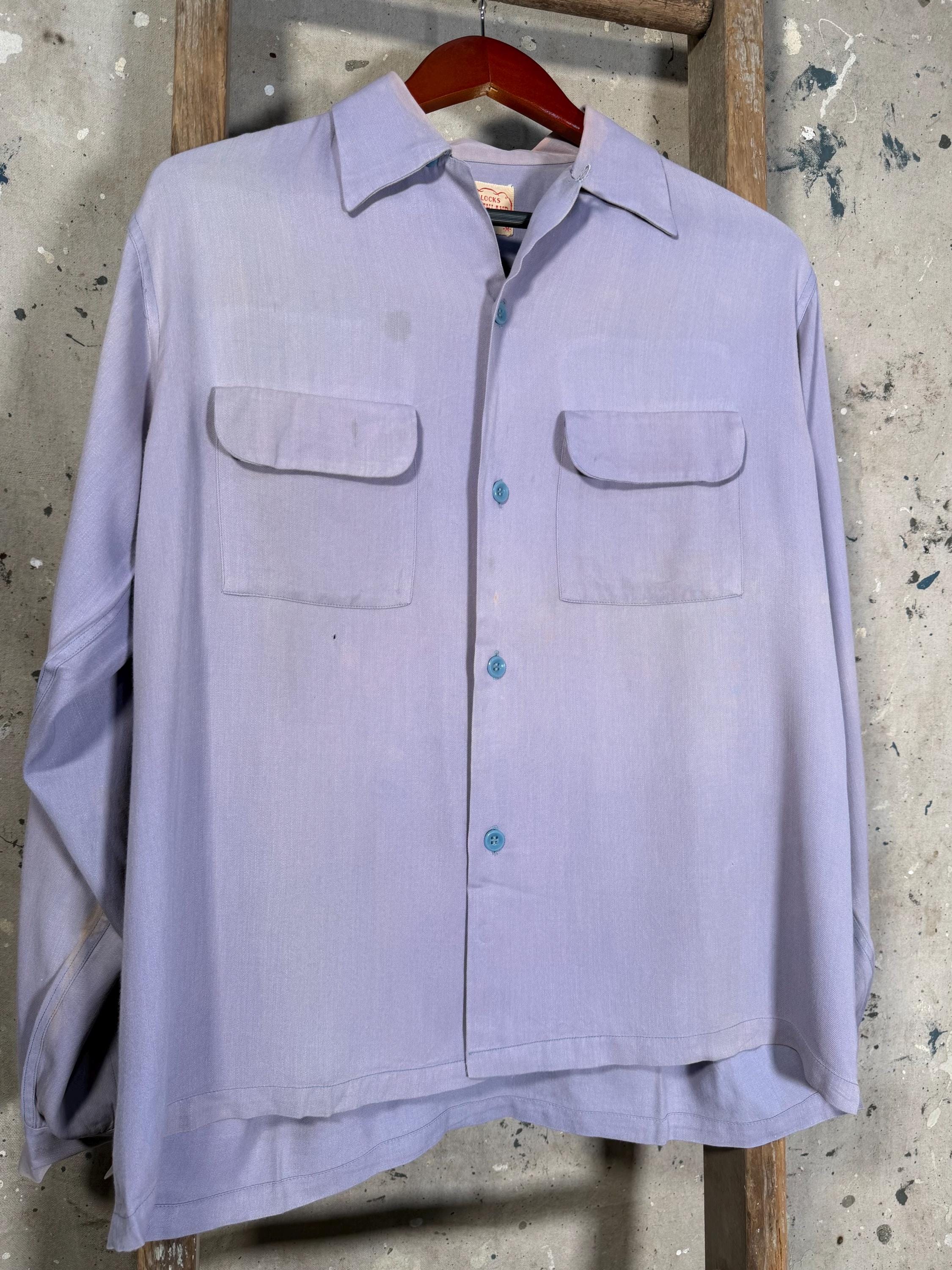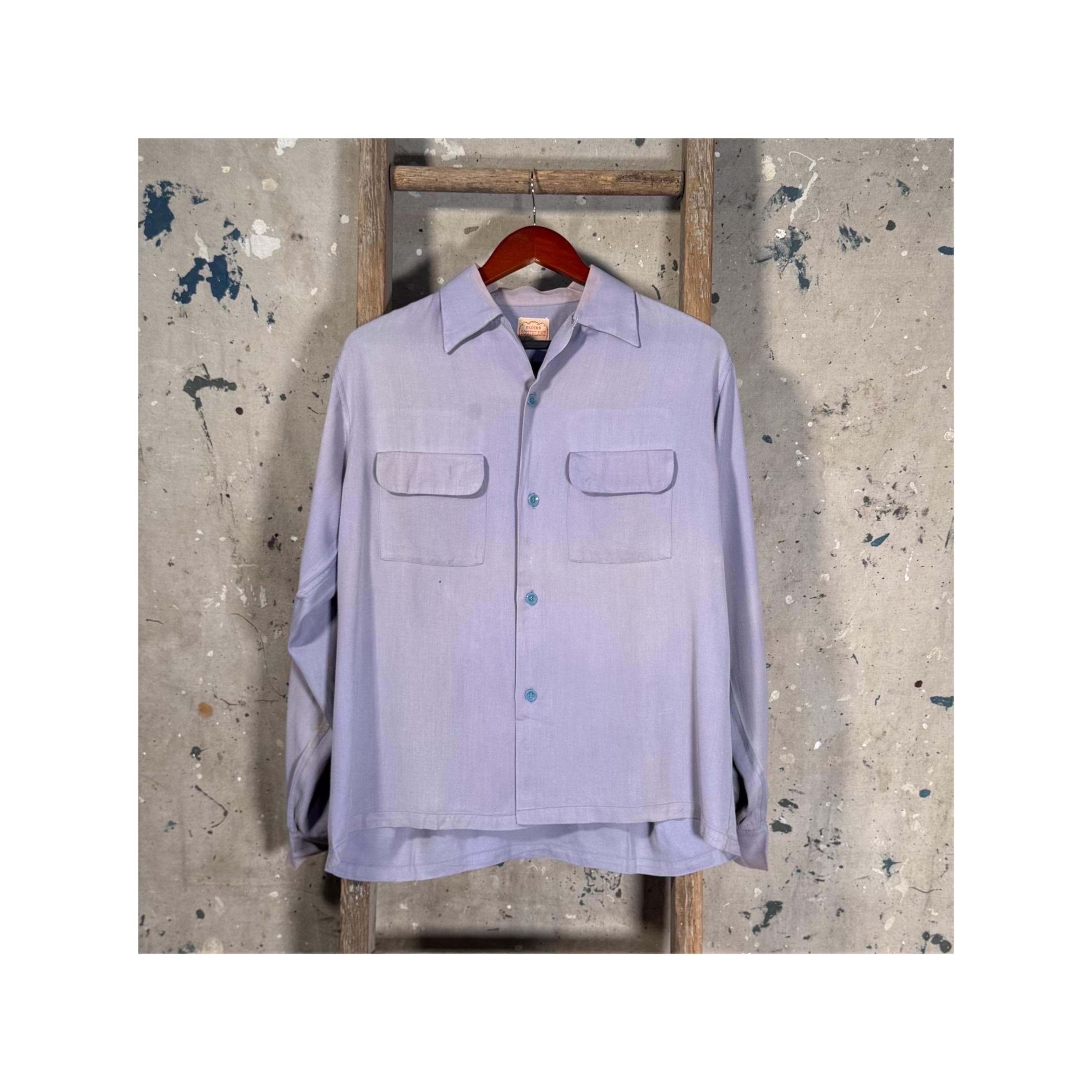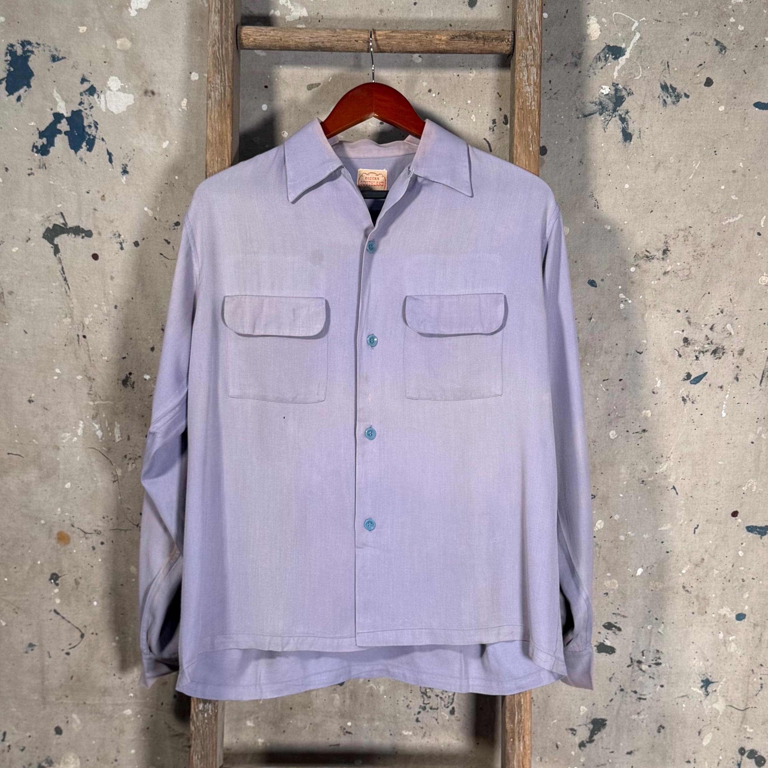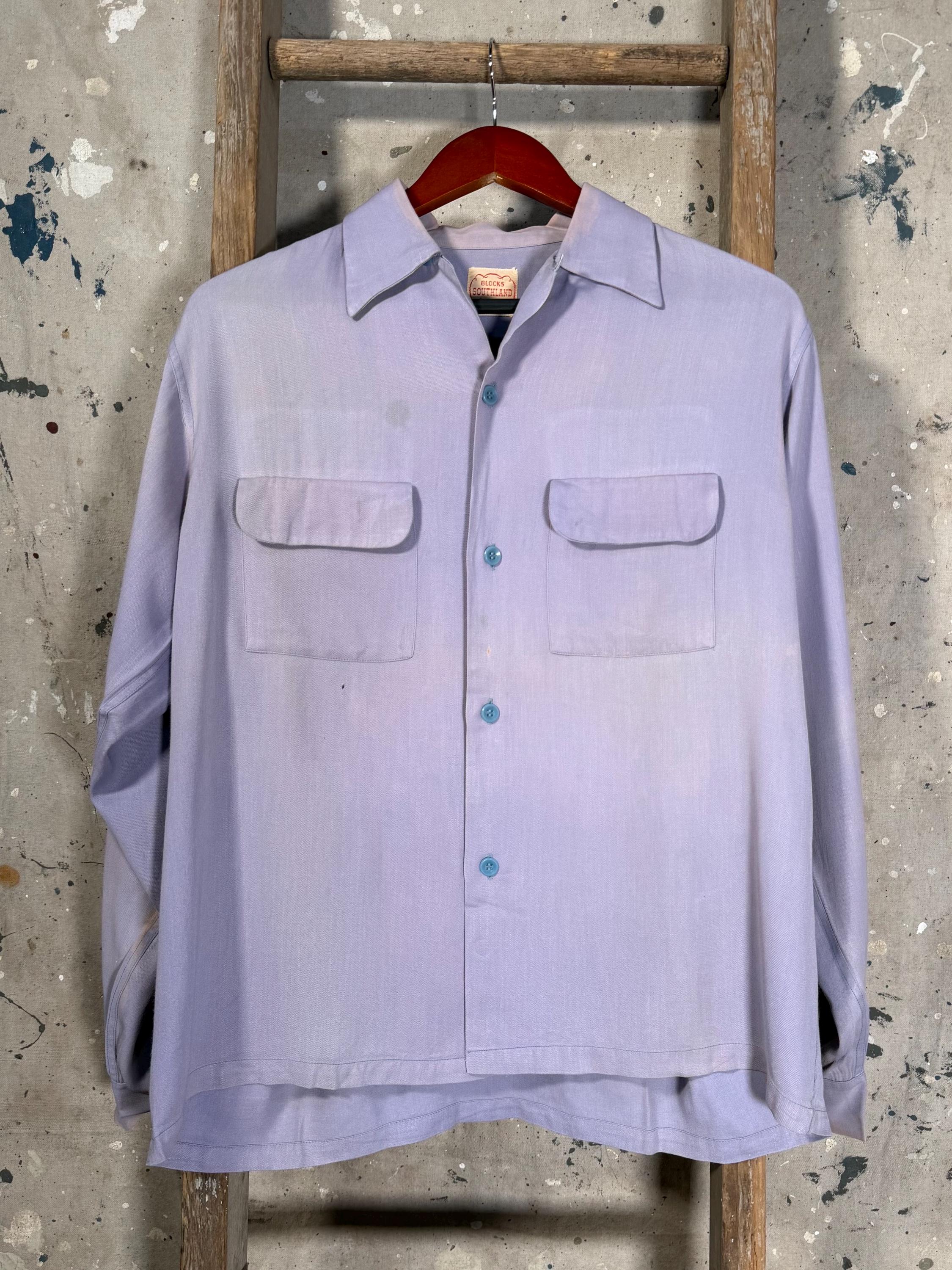 Amazing Color 1950s Loop collar shirt by Blocks Southland. 2 front flap pockets , beautiful purple hues throughout. Great condition , natural distressing , some spots likely to come out with additional care - see photos