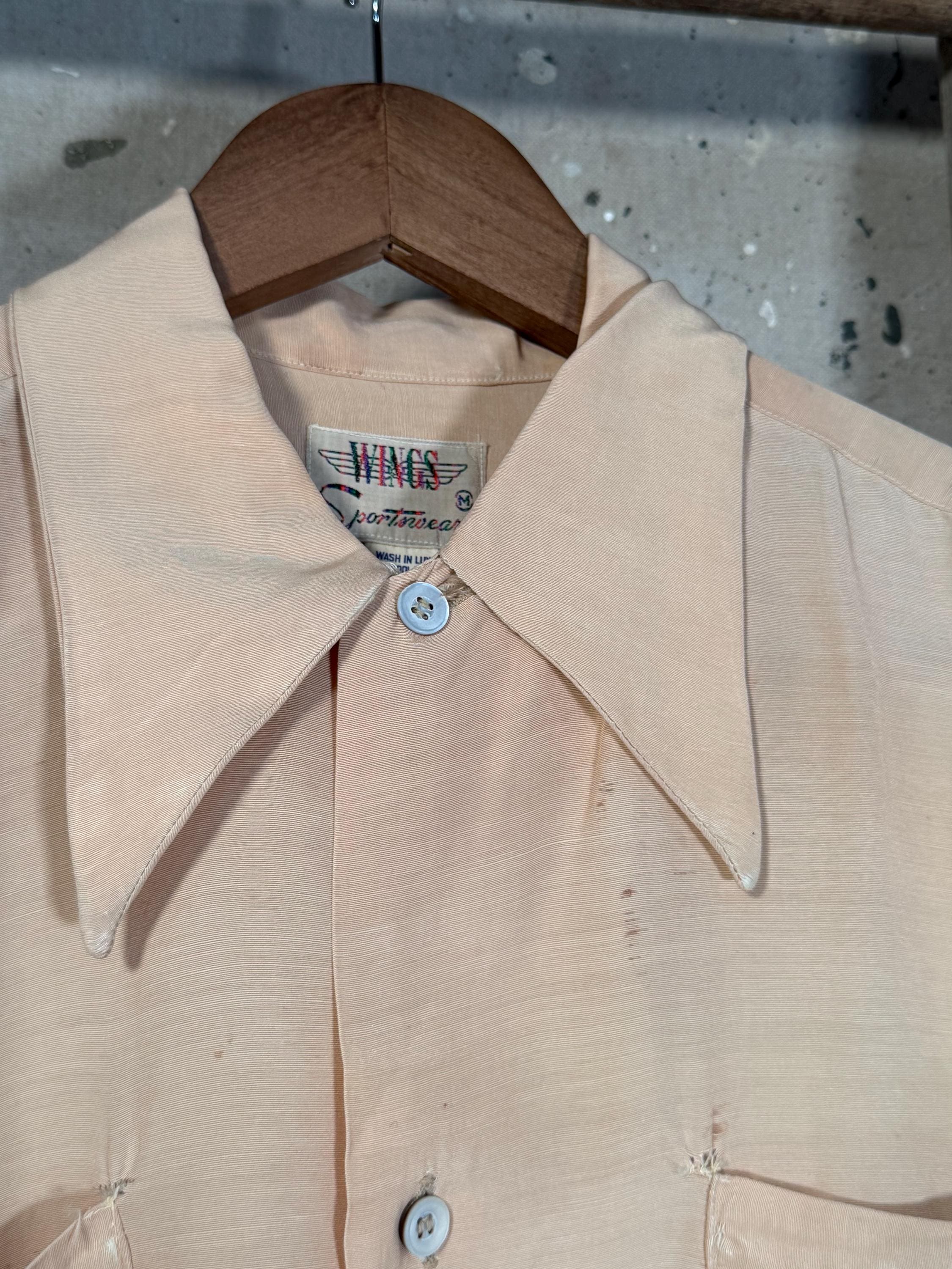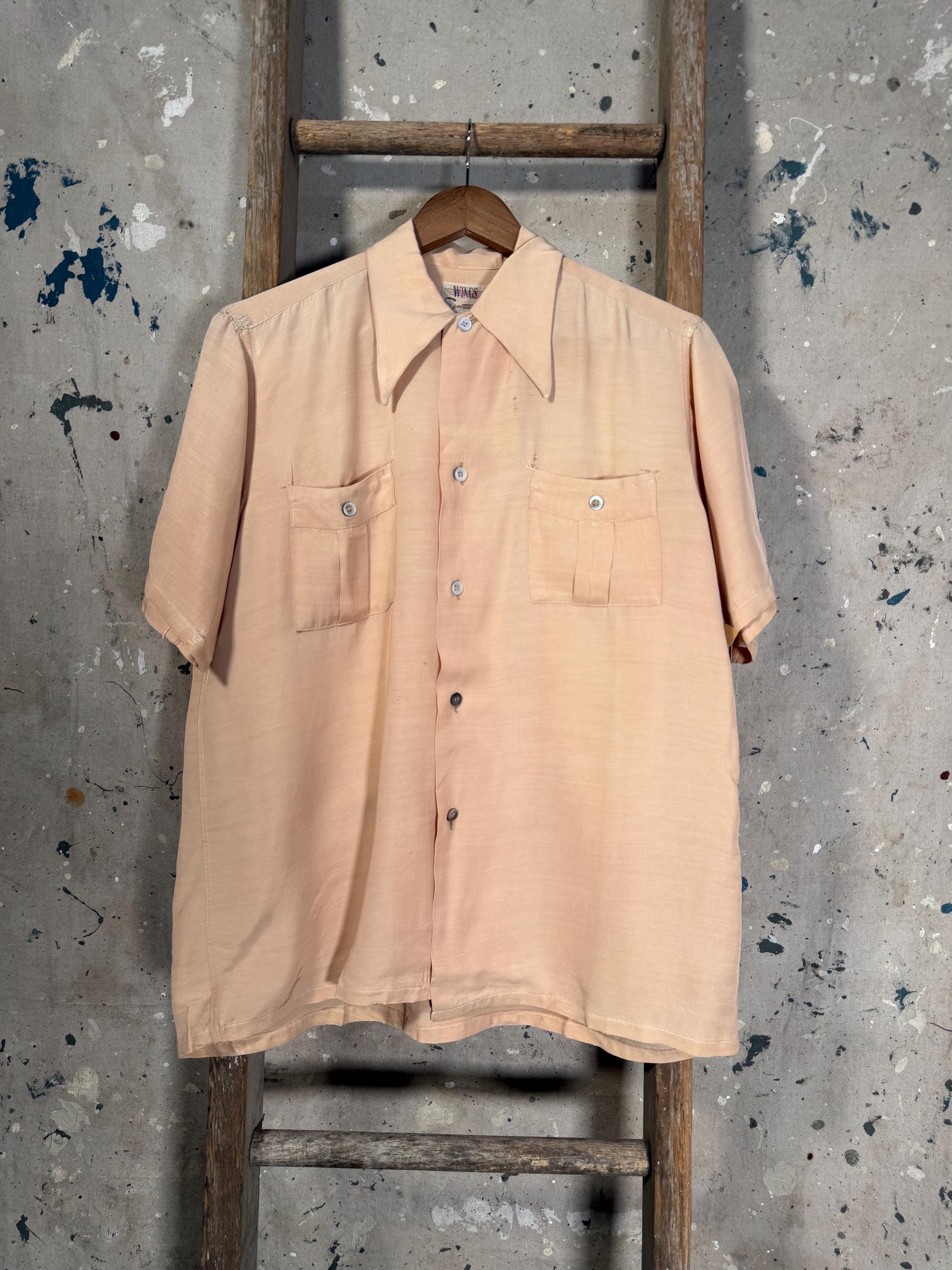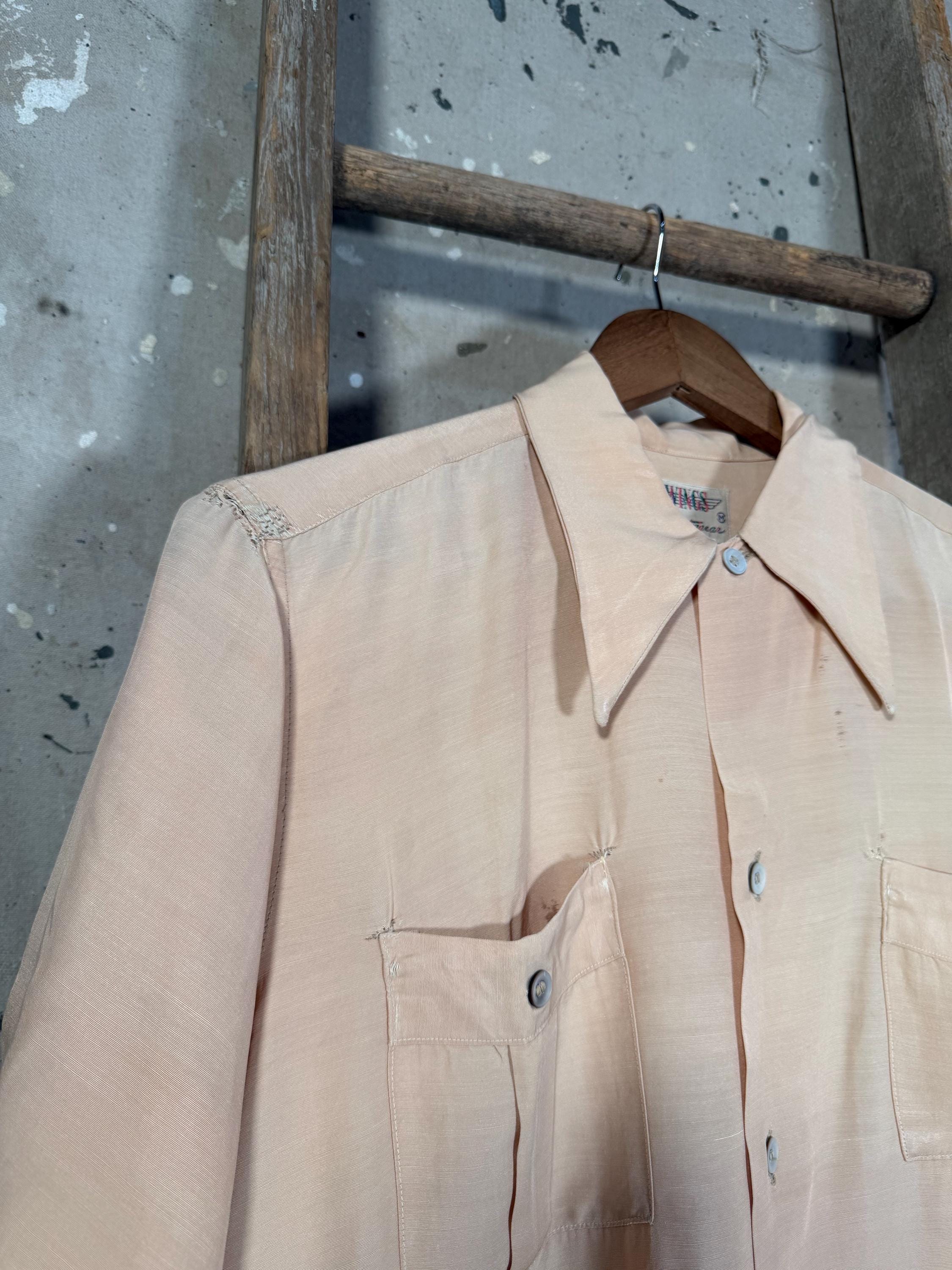 1960s Button down Shirt by Wings Sportswear. Peach color , great ware throughout with a couple small repairs & 2 front pockets. Good vintage condition , natural distressing throughout - see photos