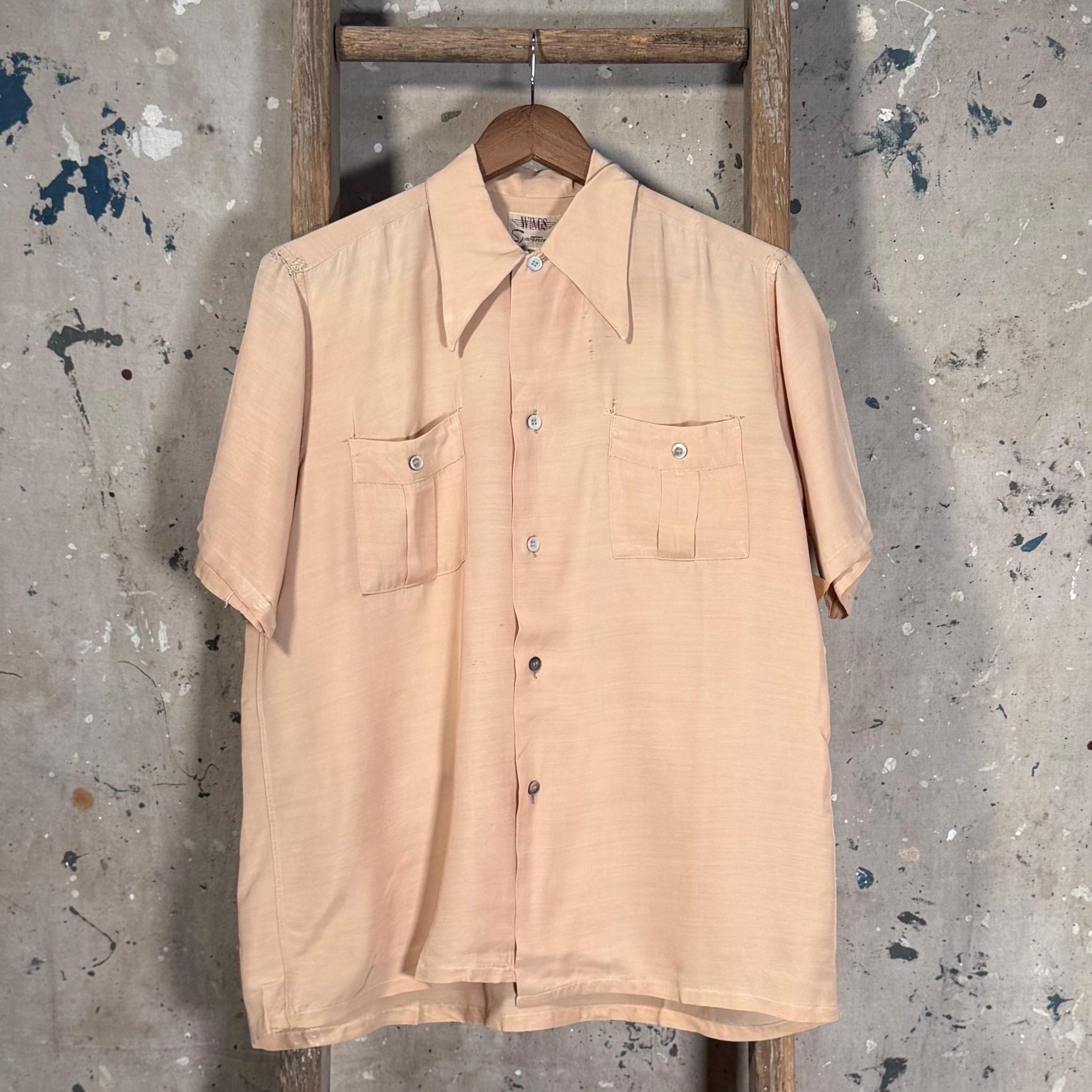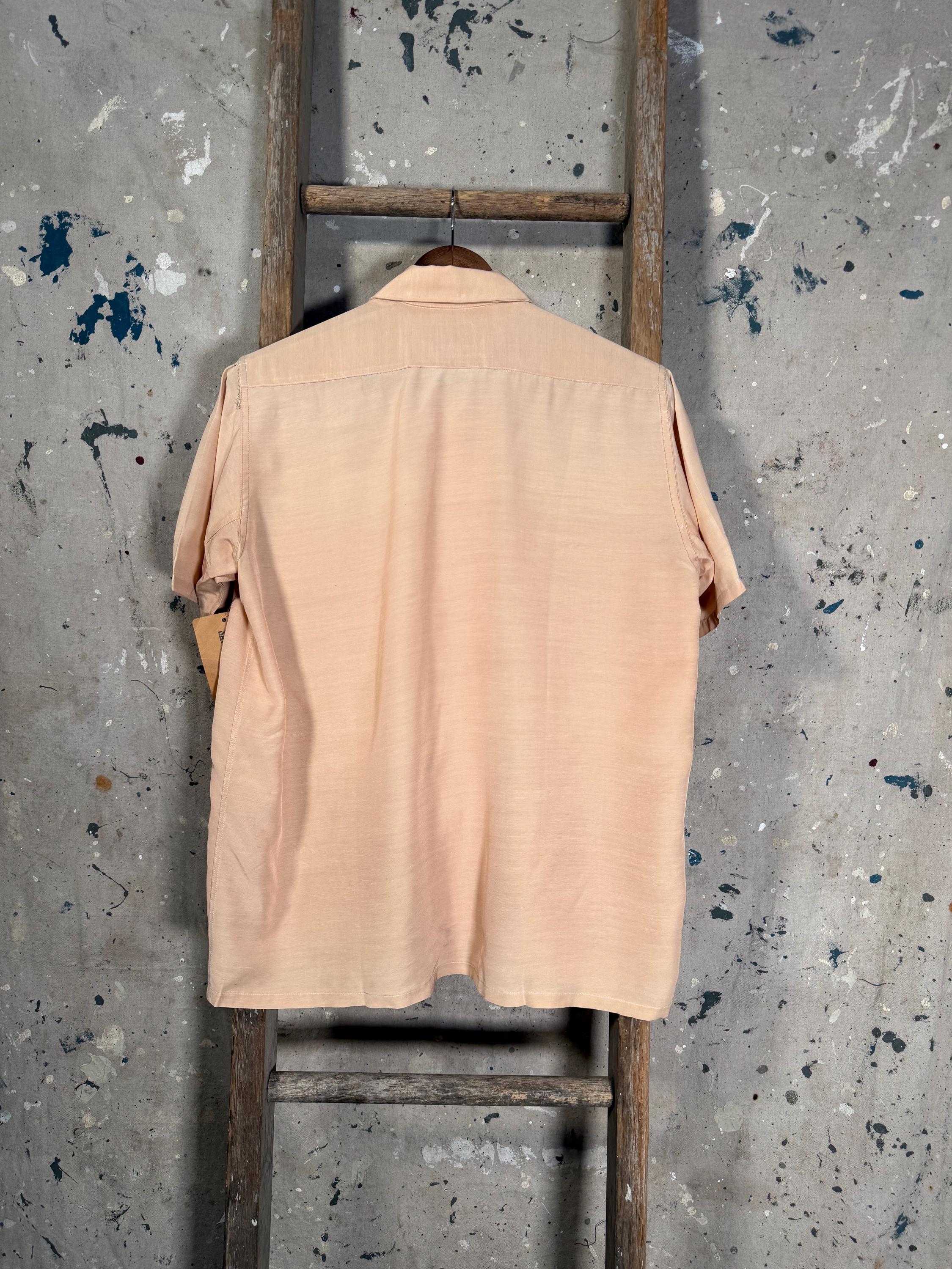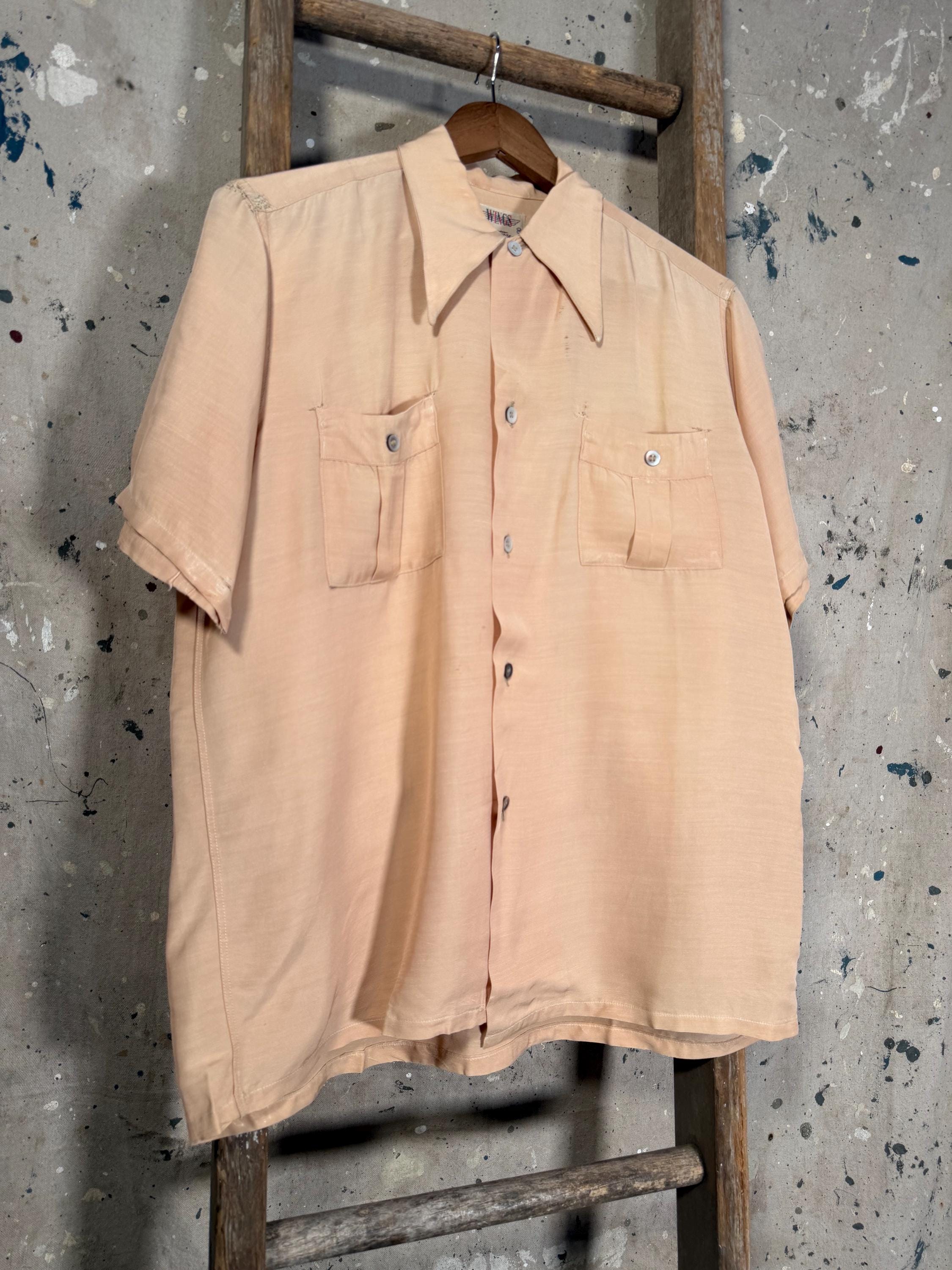 1960s Button down Shirt by Wings Sportswear. Peach color , great ware throughout with a couple small repairs & 2 front pockets. Good vintage condition , natural distressing throughout - see photos