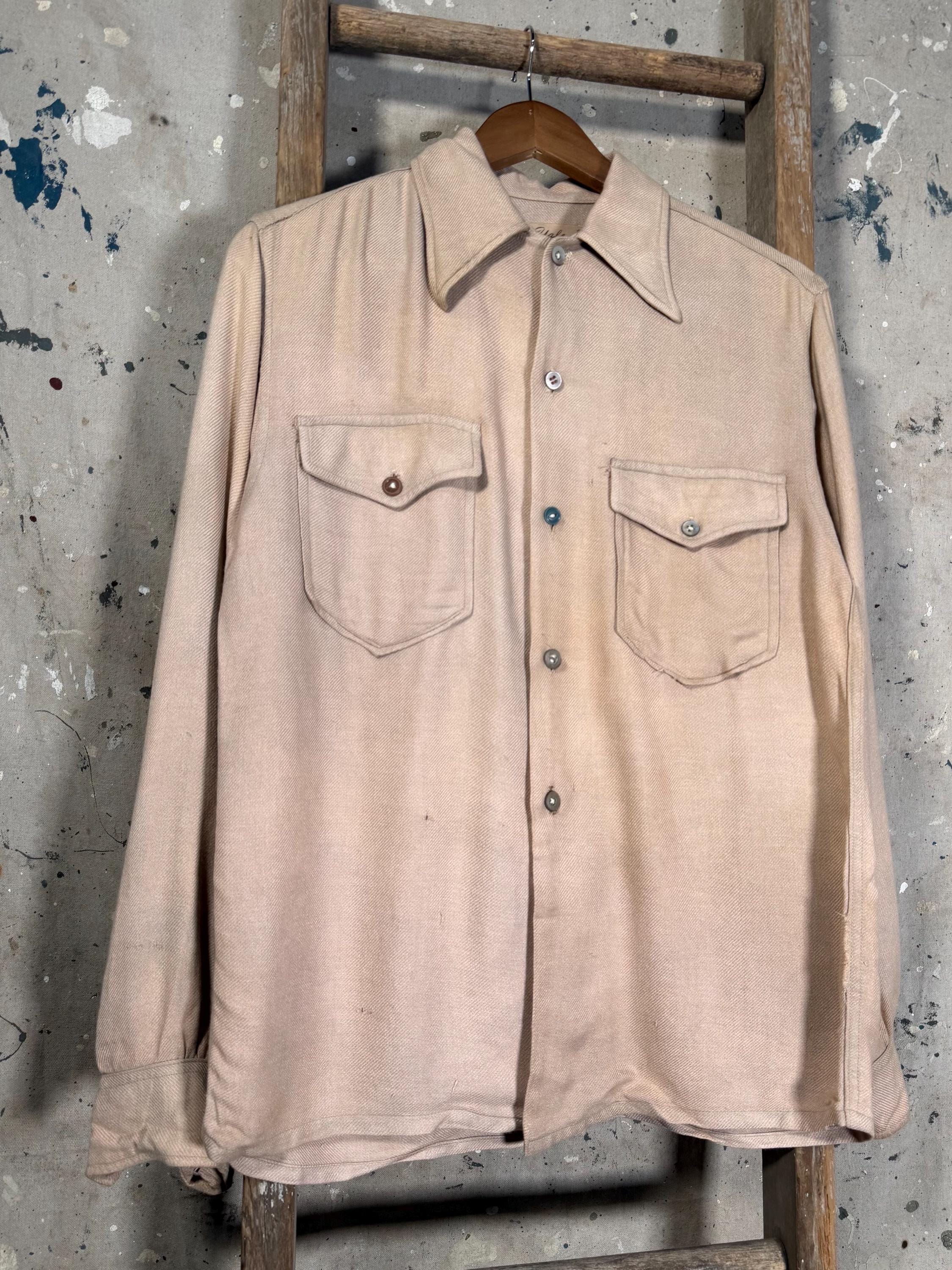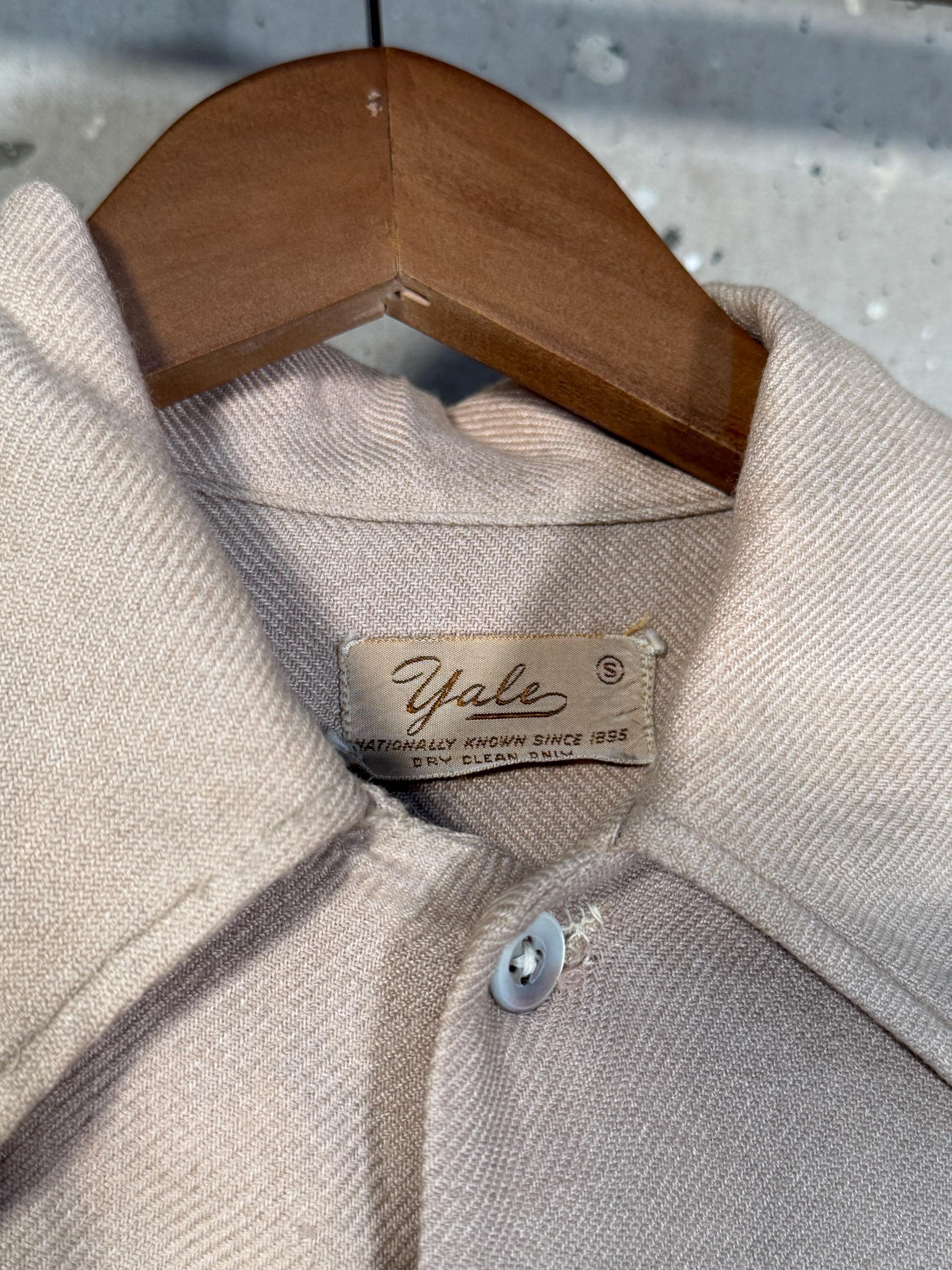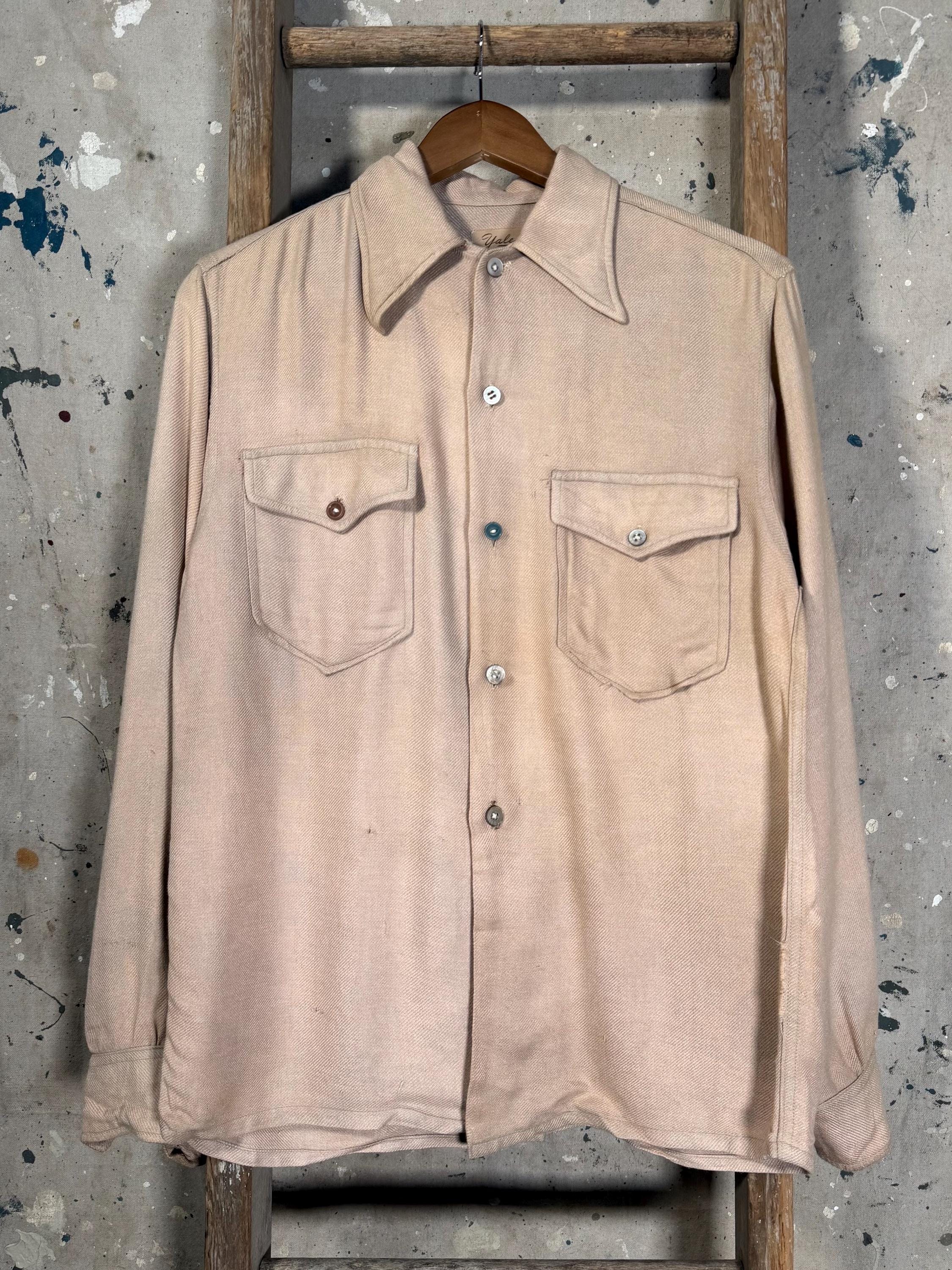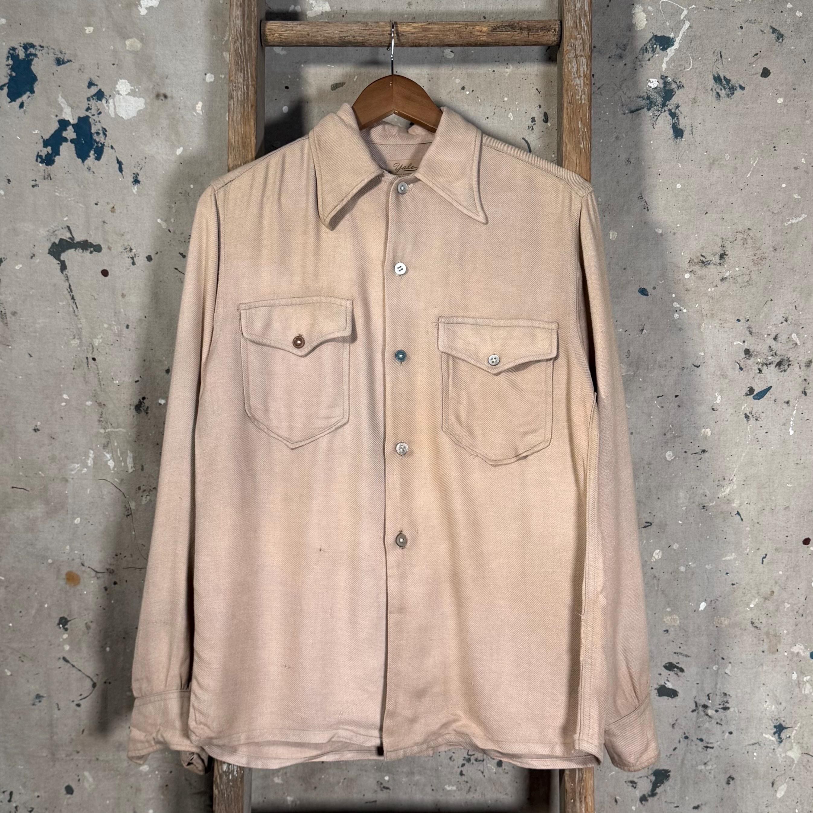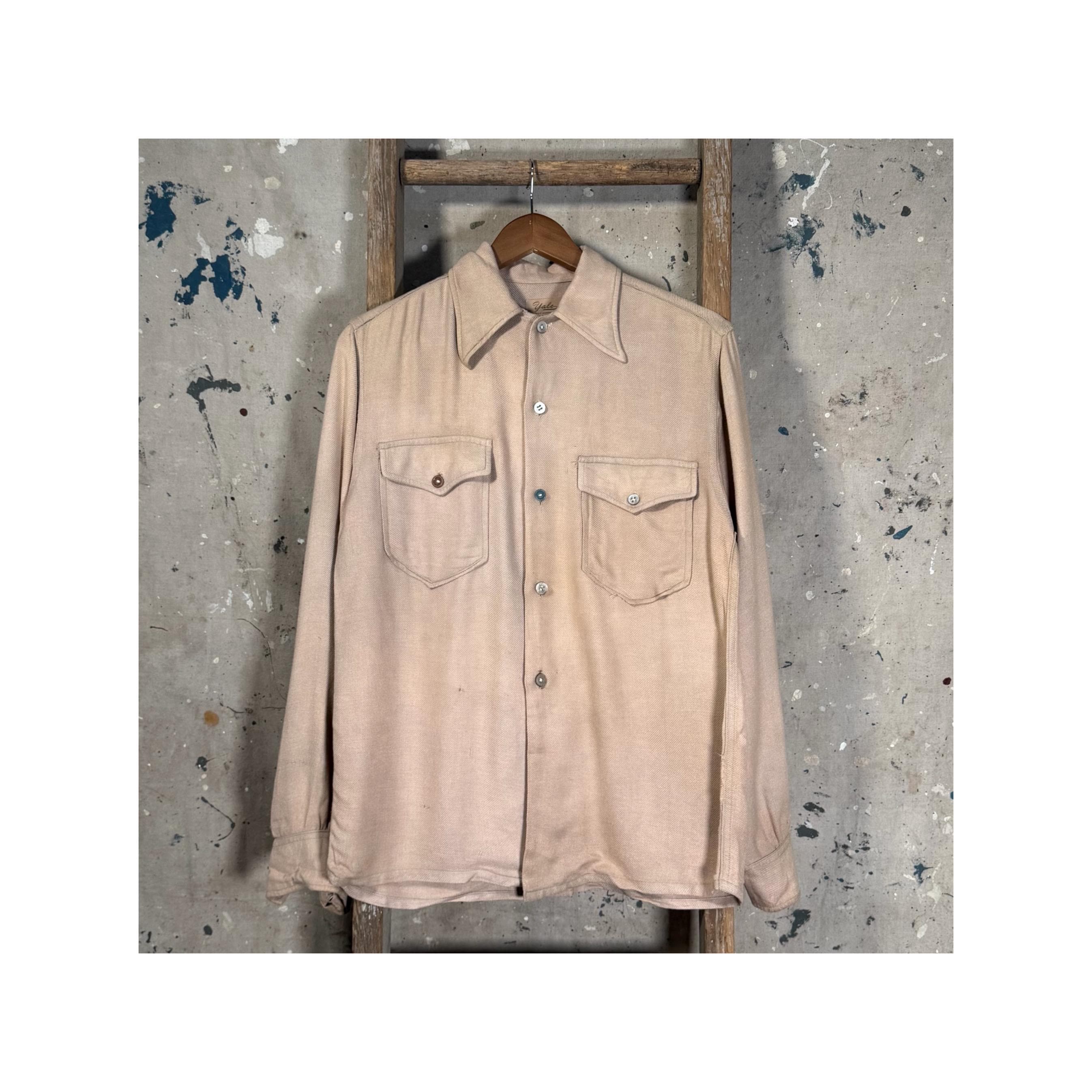 1950s Woven Knit Button down shirt by Yale. 2 front flap pockets , desirable wear and fading throughout. Great worn in look , mismatched buttons with natural distressing - see photos.