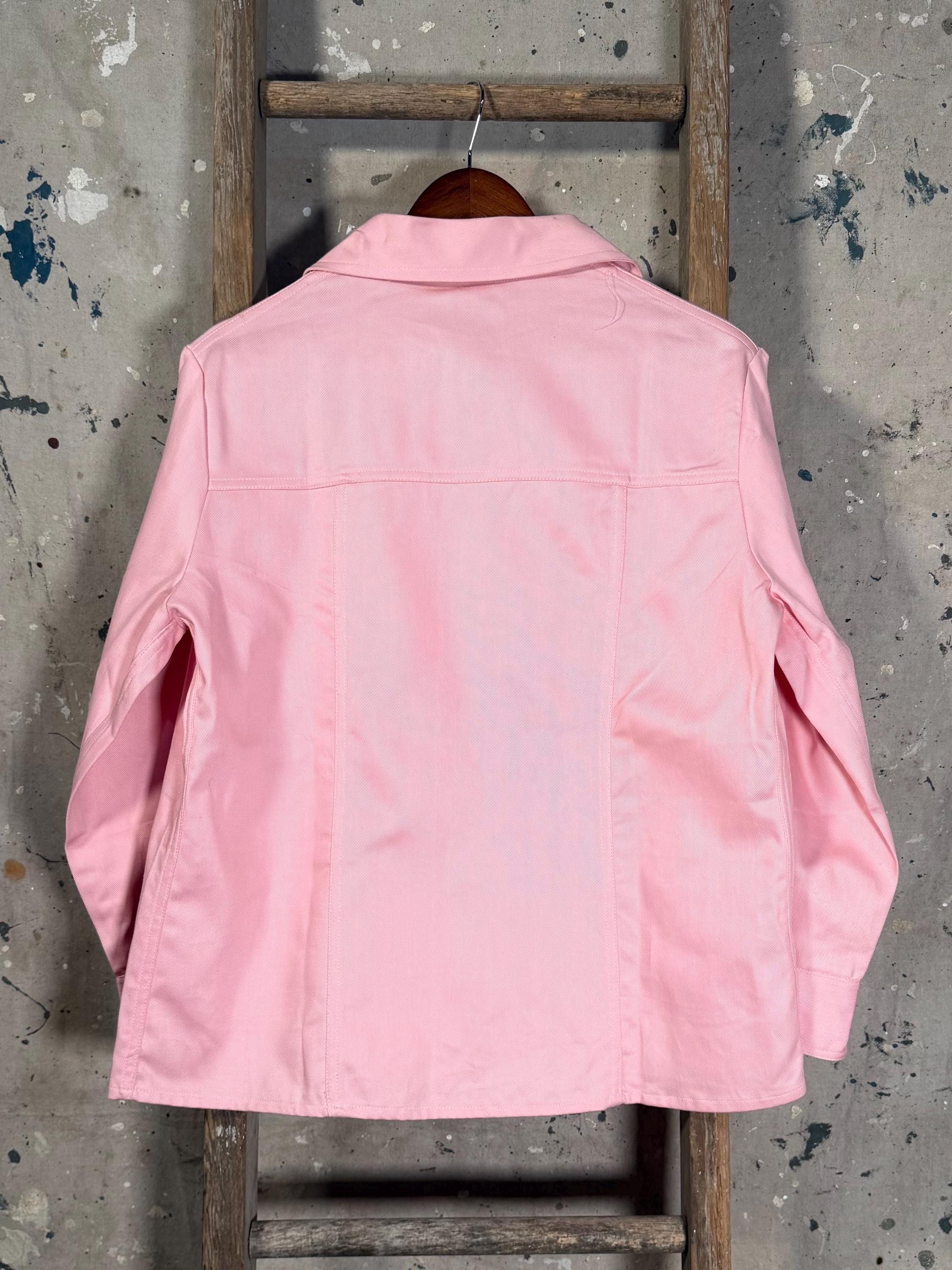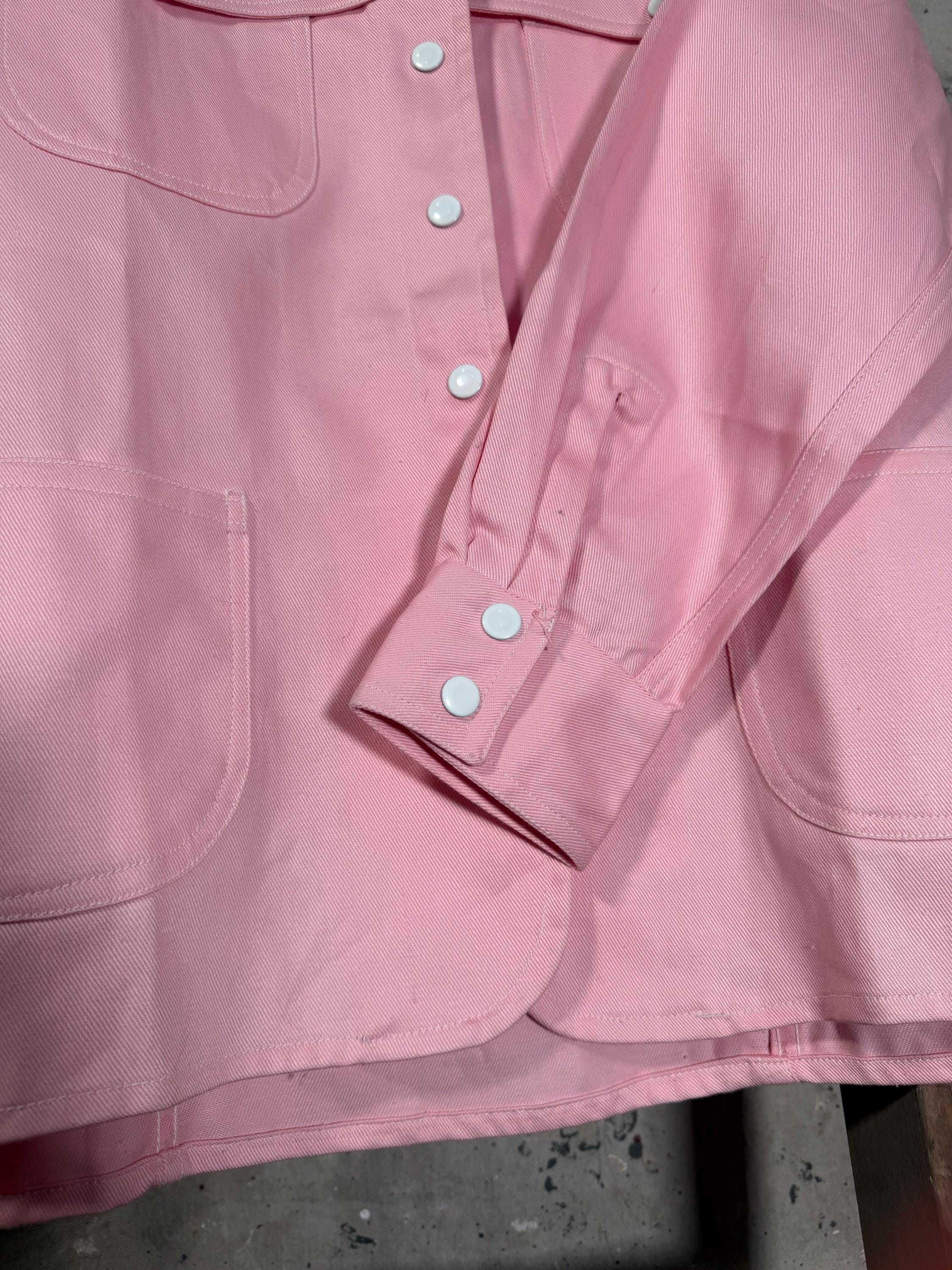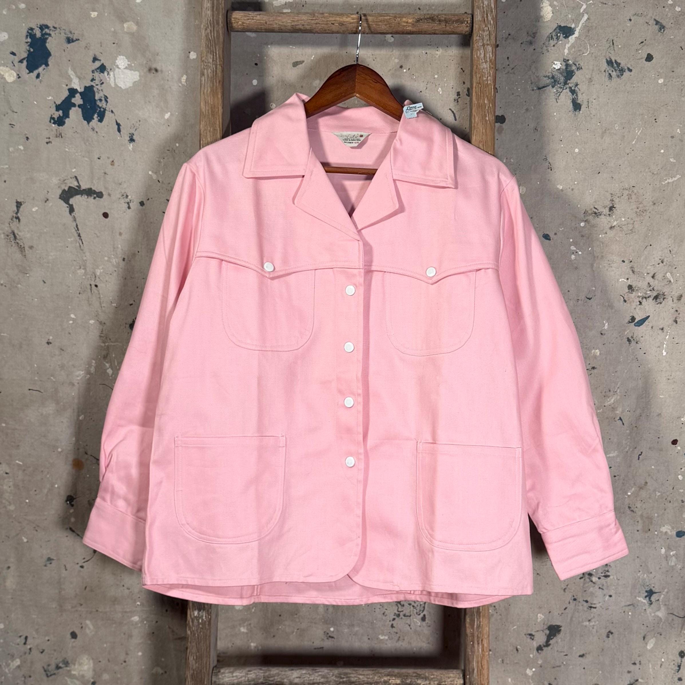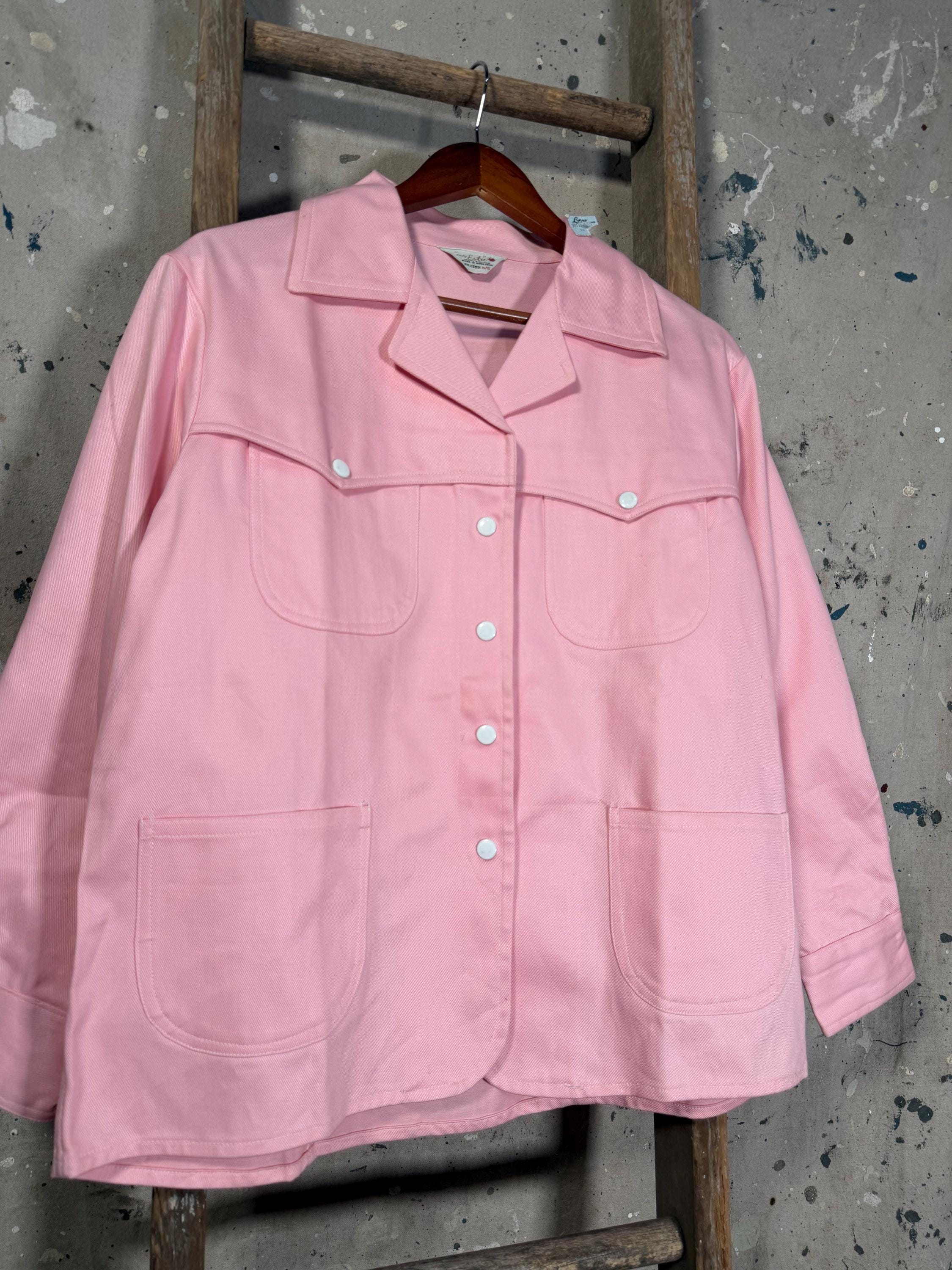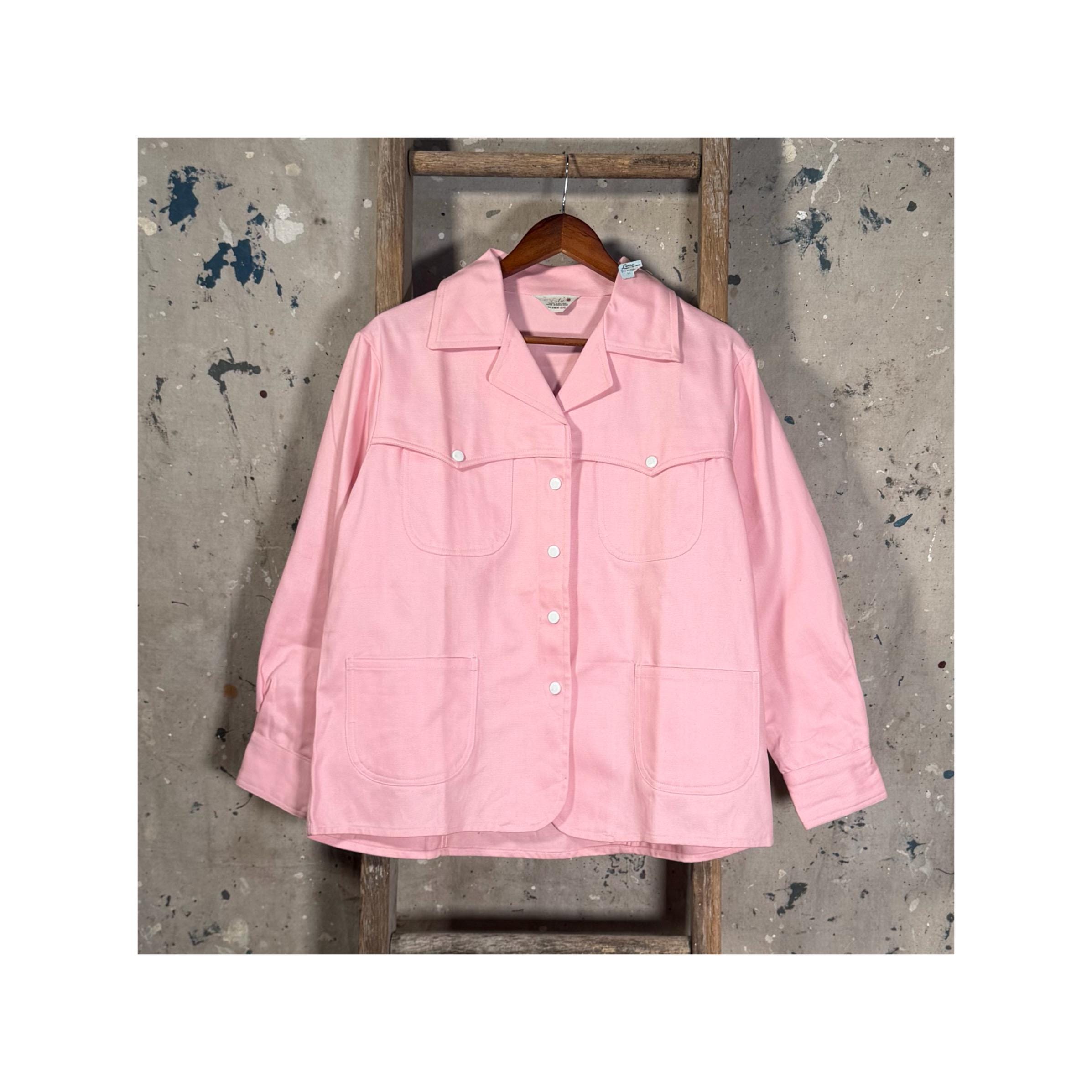 New Old Stock 1970s 4 Pocket Trucker Jacket by Lady Esta. Western style with white snap buttons throughout. Beautiful pink color , with rounded bottom hem. Made in Hong Kong. Like new , never worn condition - See Photos.