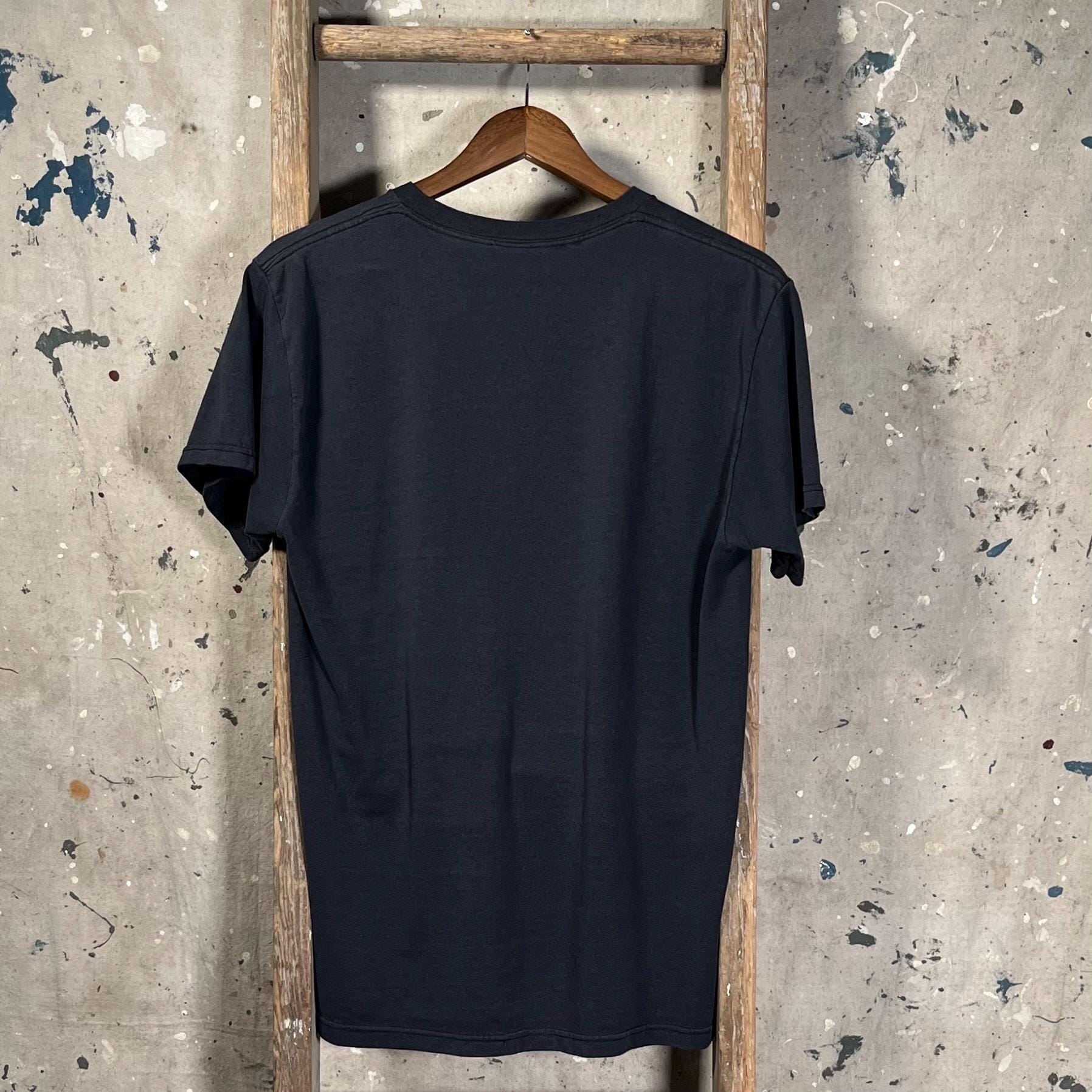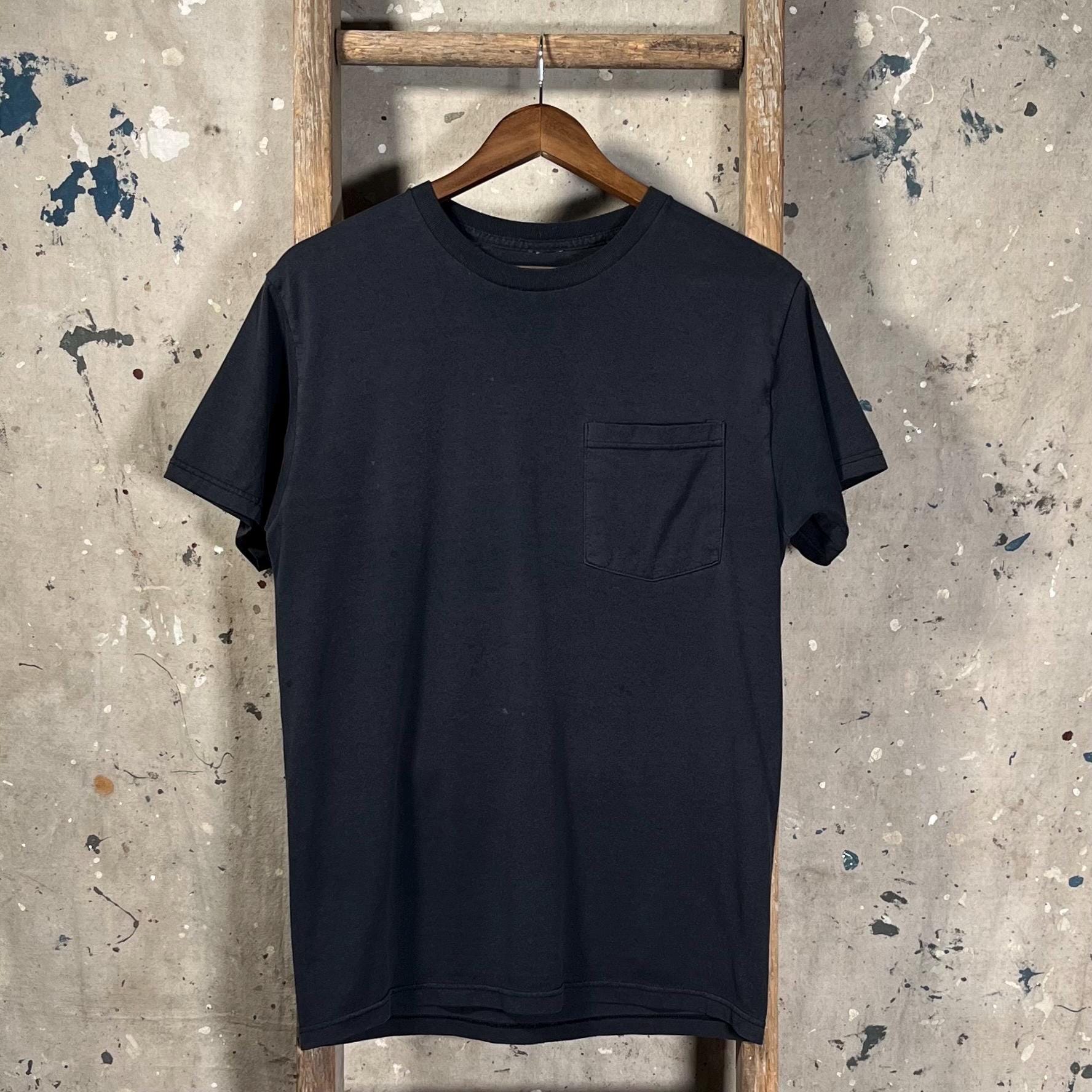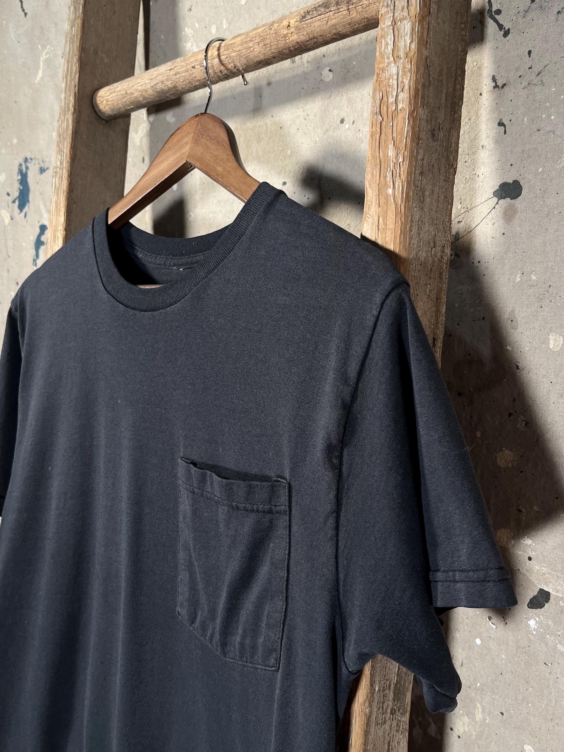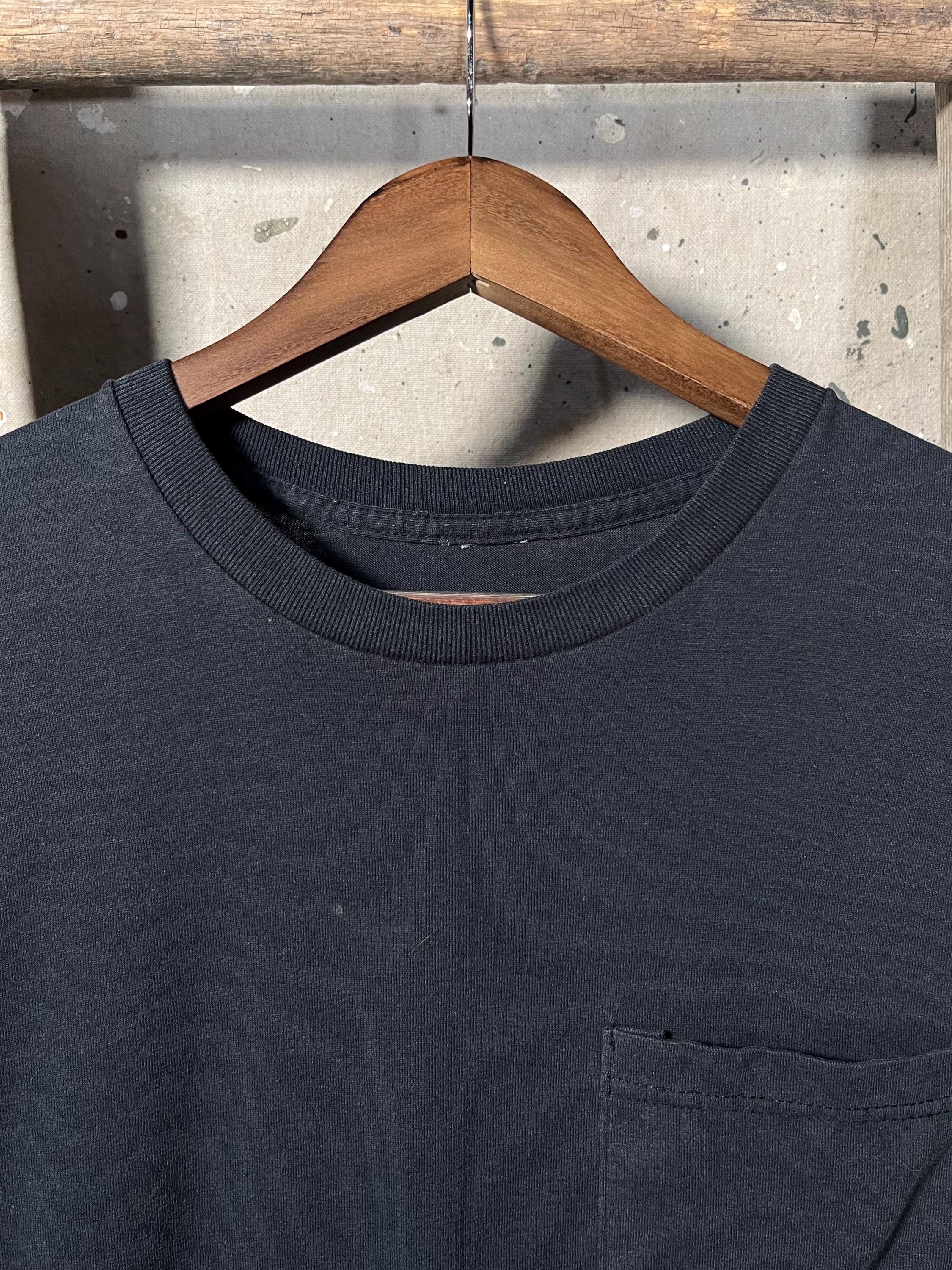 Nicely Faded 90s Black Pocket tee. Threadbare tee with pin holes and great distressing throughout- see photos.