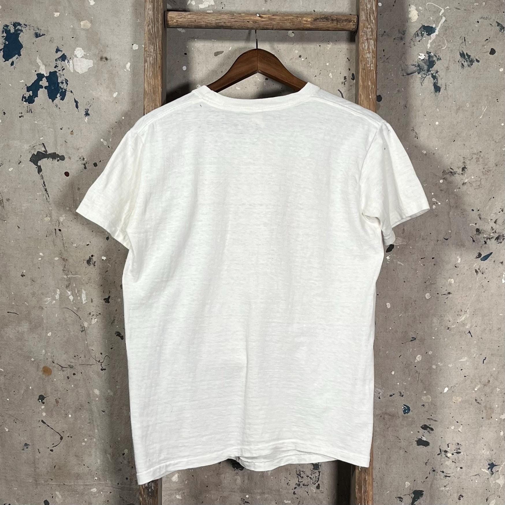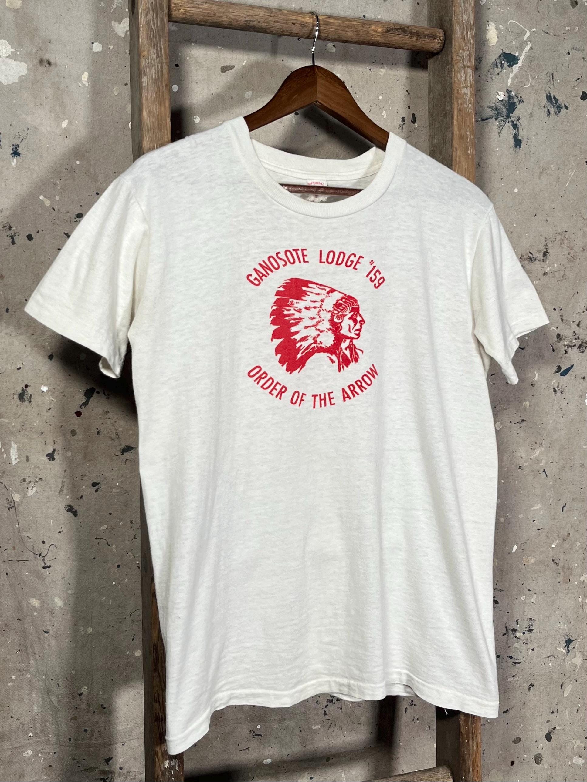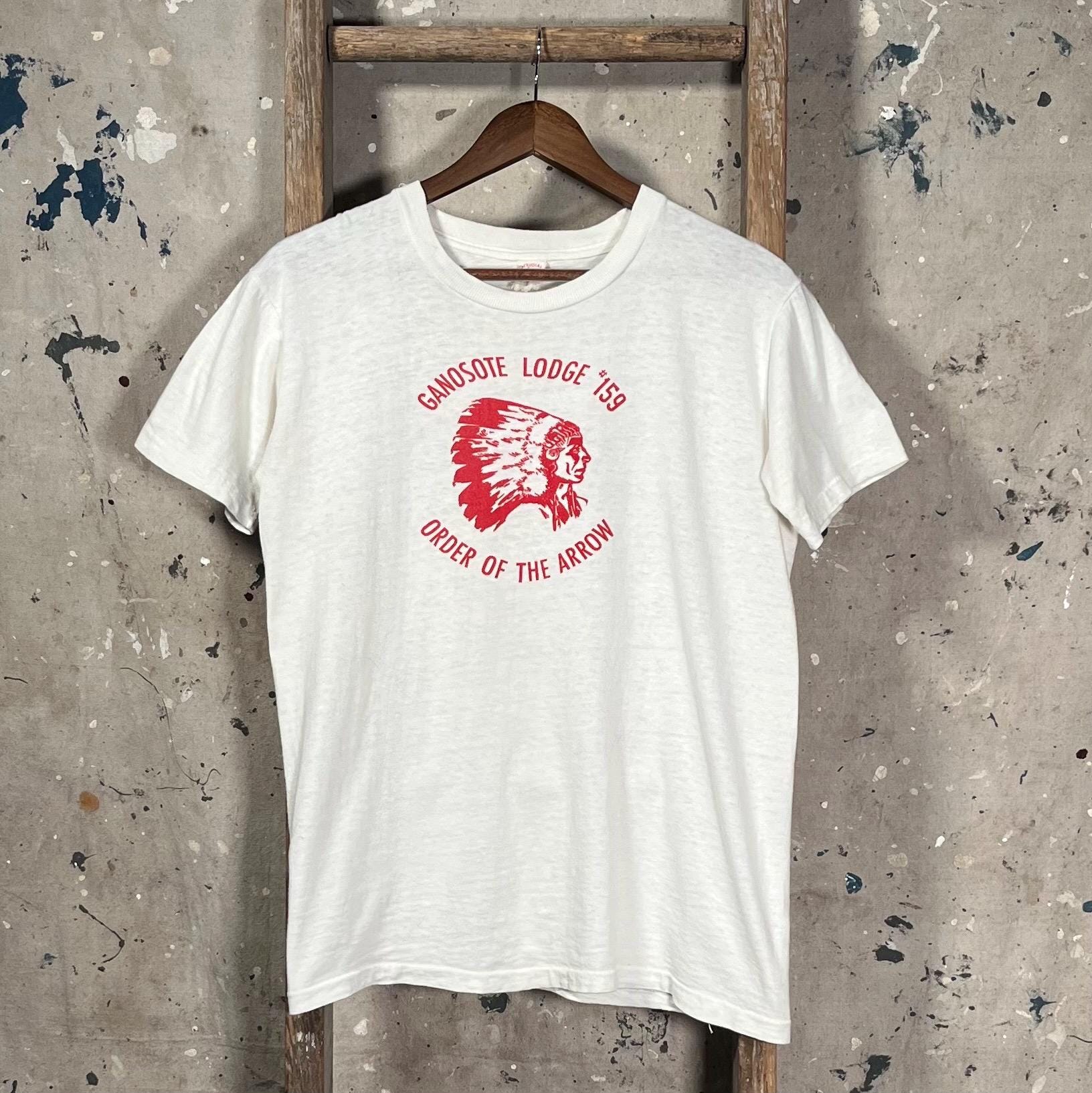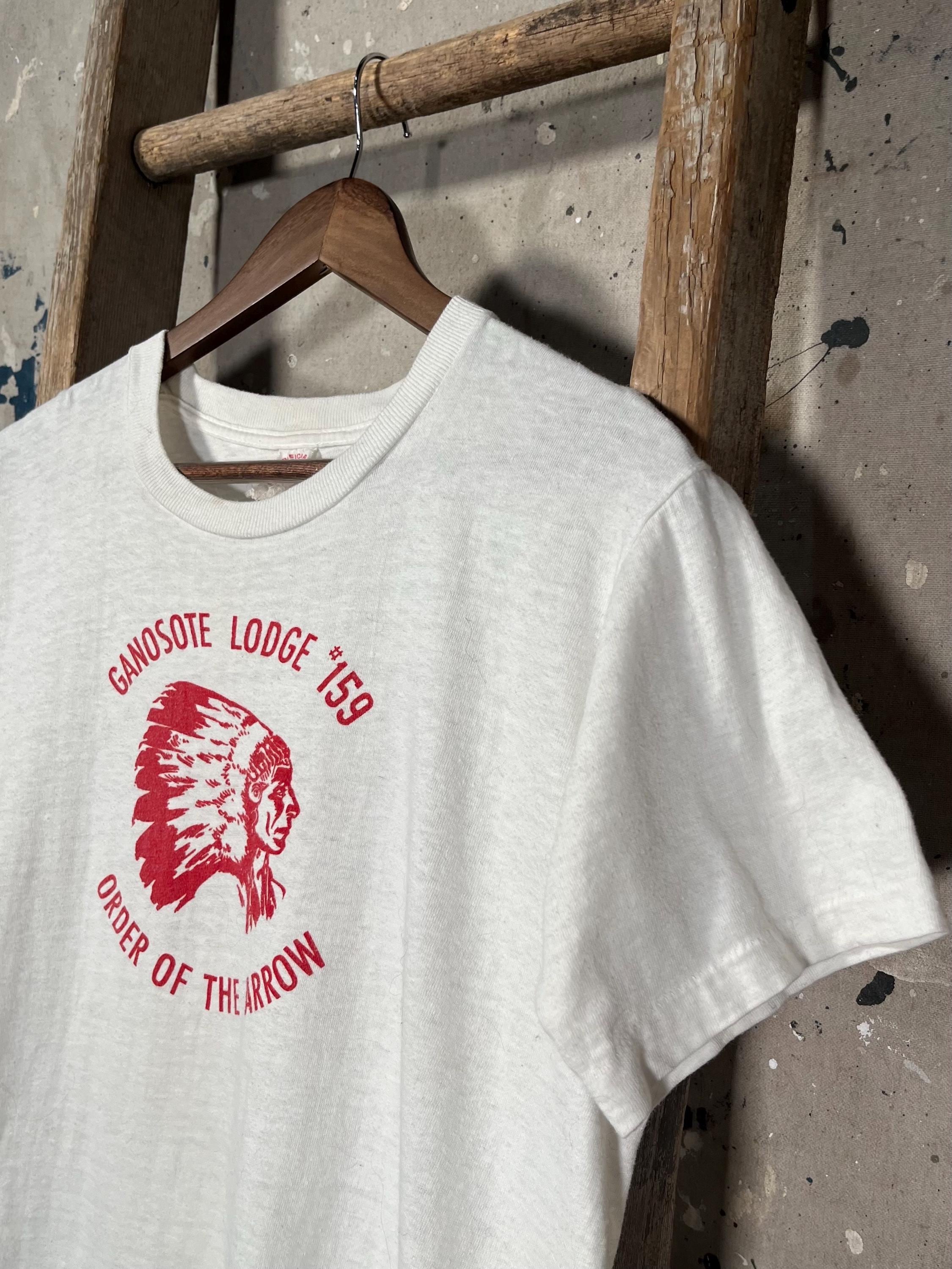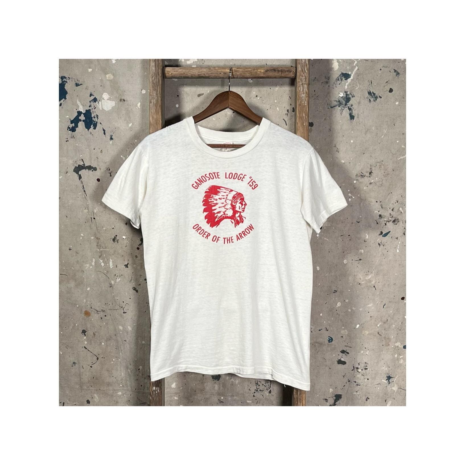 Chicago Boy Scout Canoe Club t-shirt . Flocked print, two sided , scene on chest and back . Well worn , see photos . Good condition.