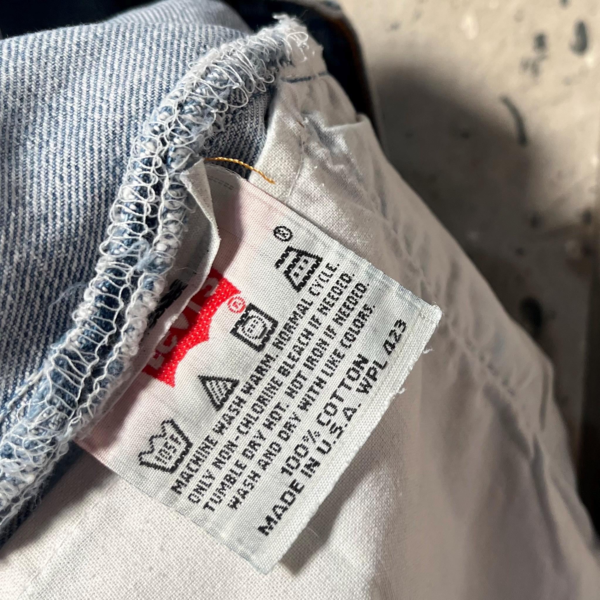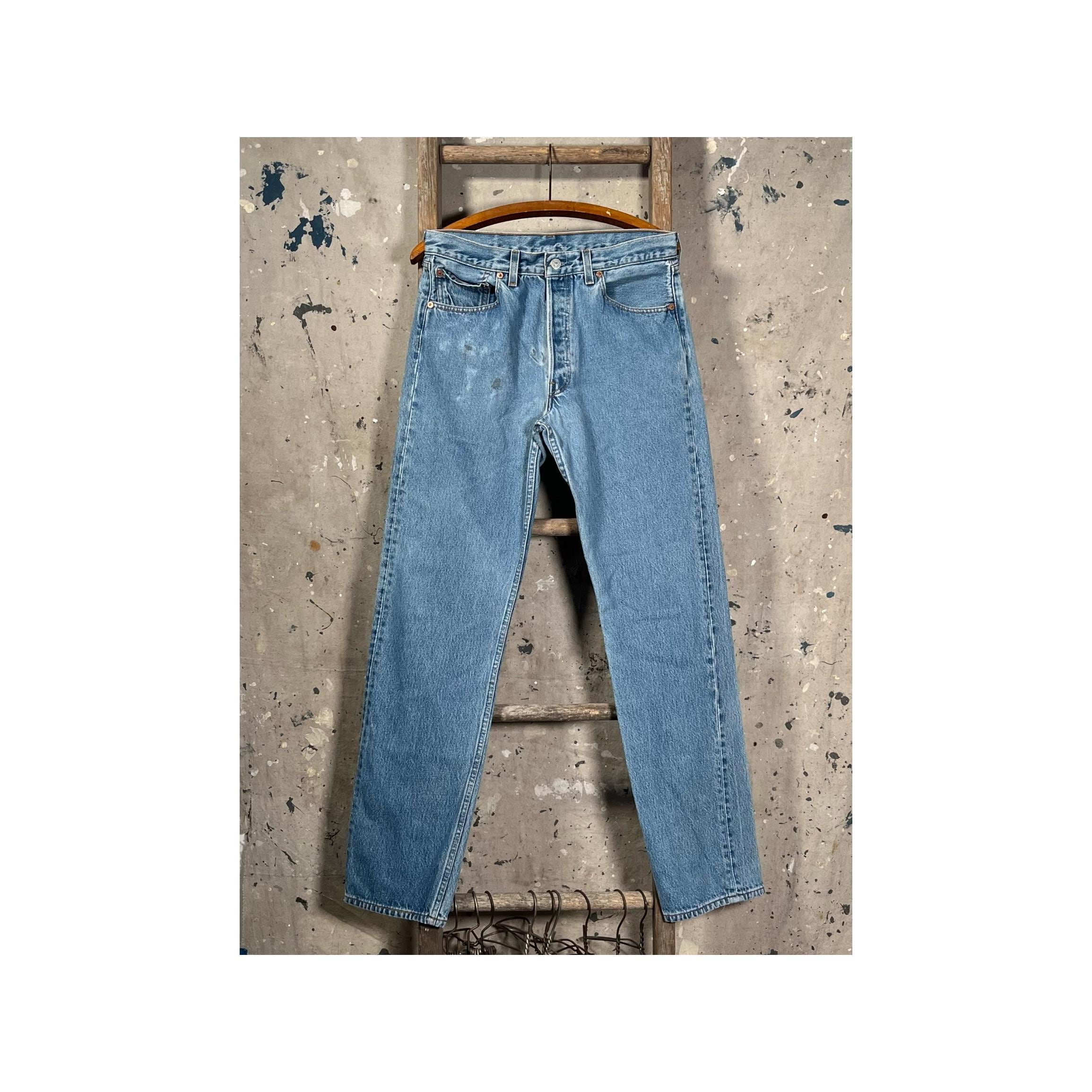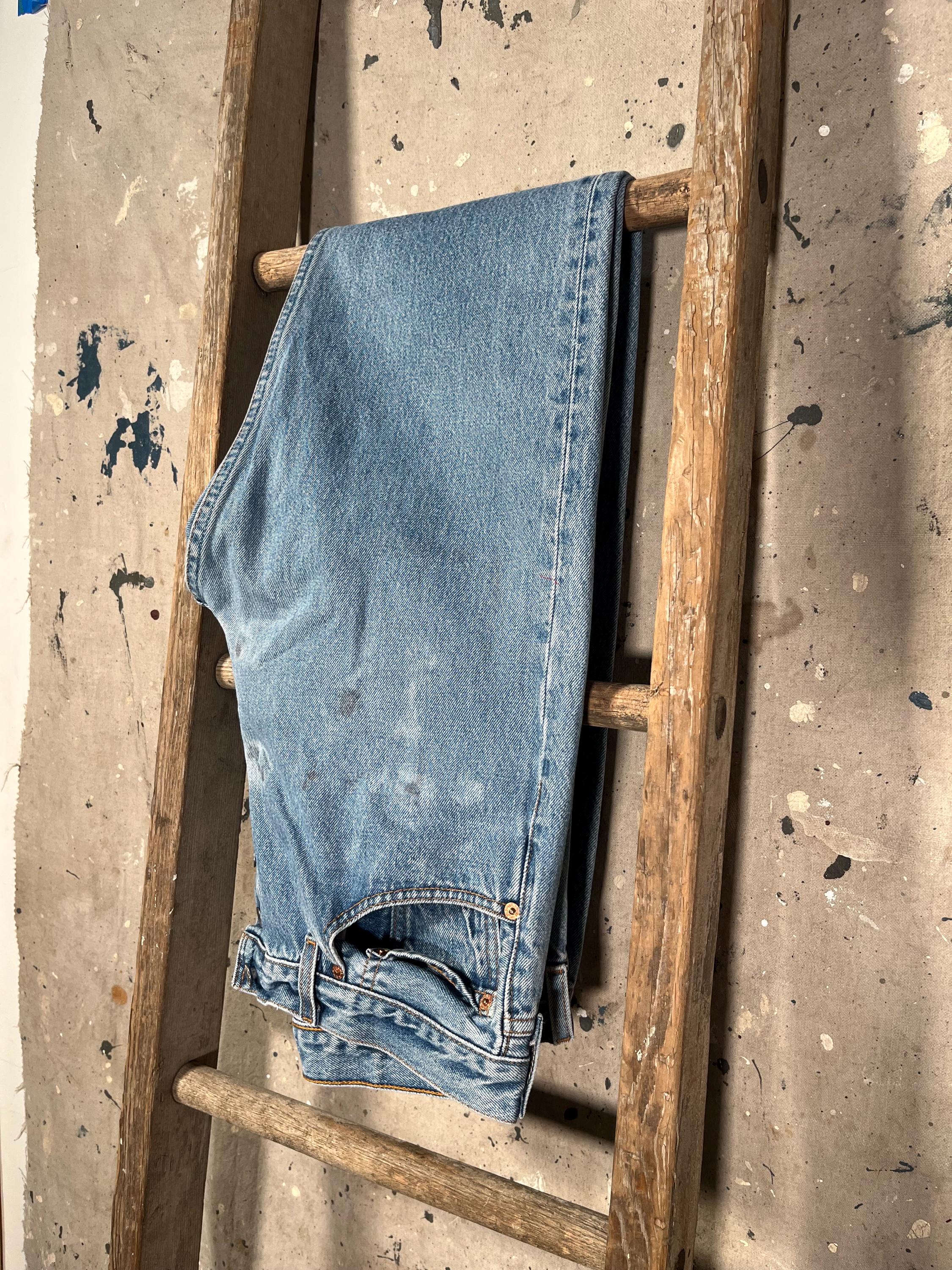 1980s Levi's 501 denim jeans. 34 waist , button fly. Great distressing throughout , some discoloring. Good condition - see photos.
