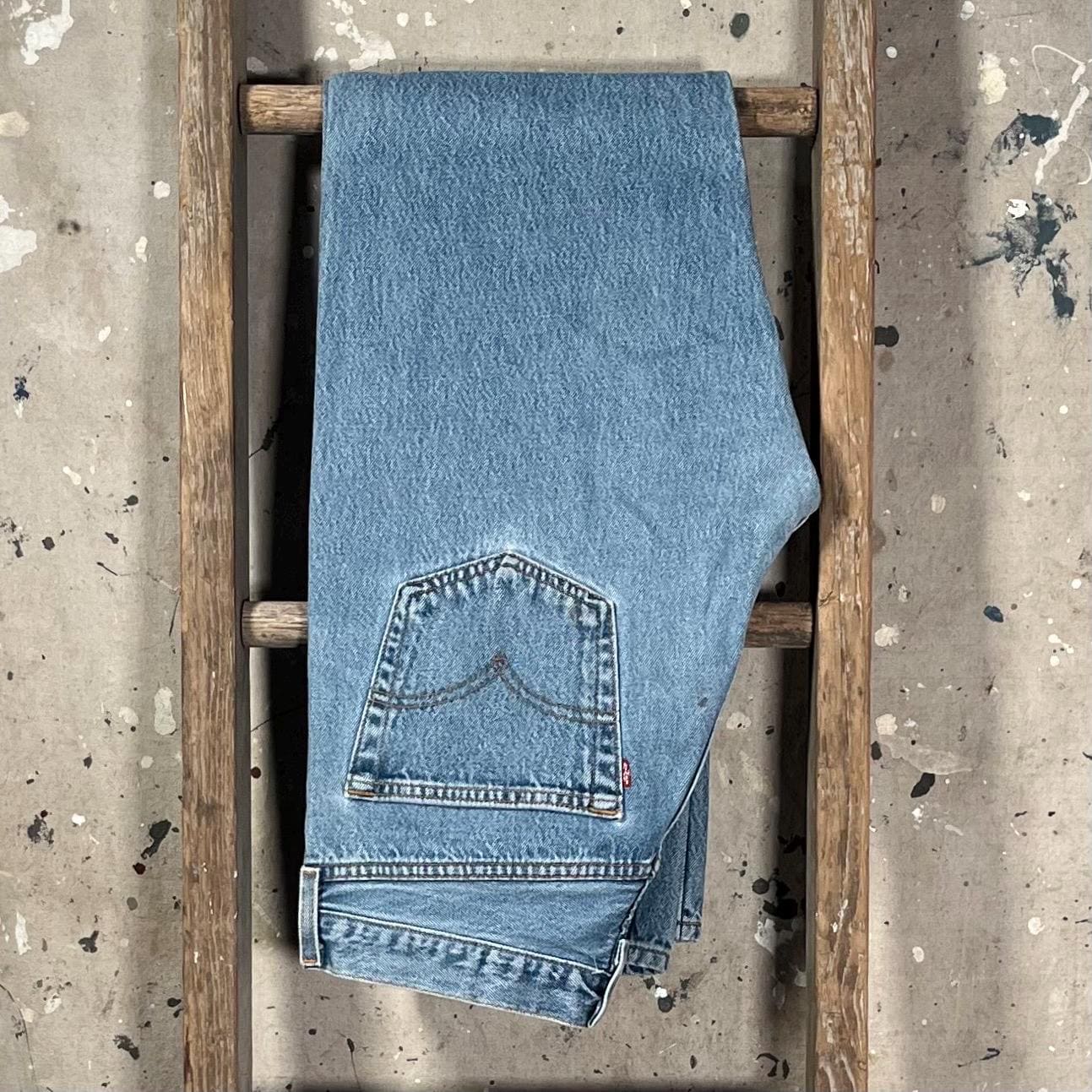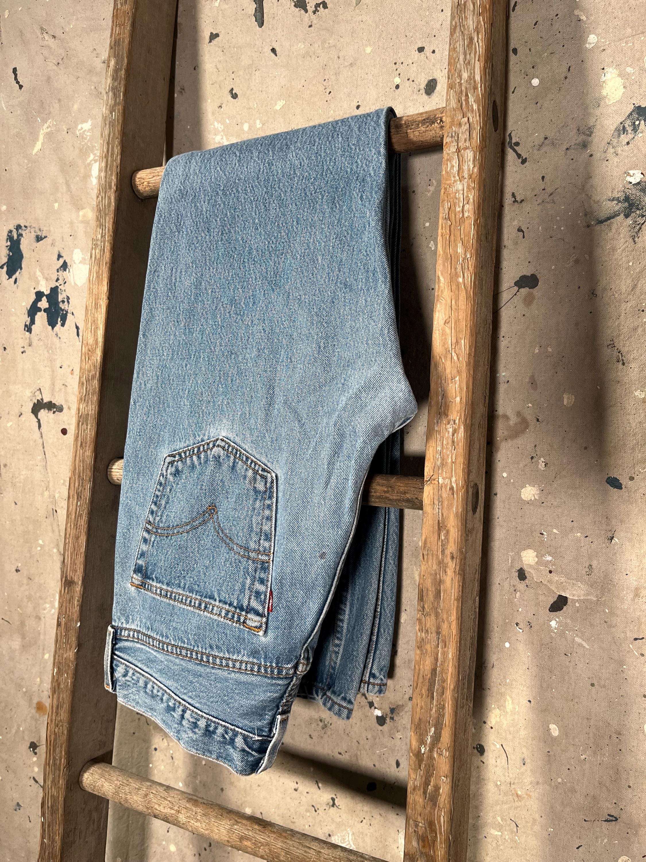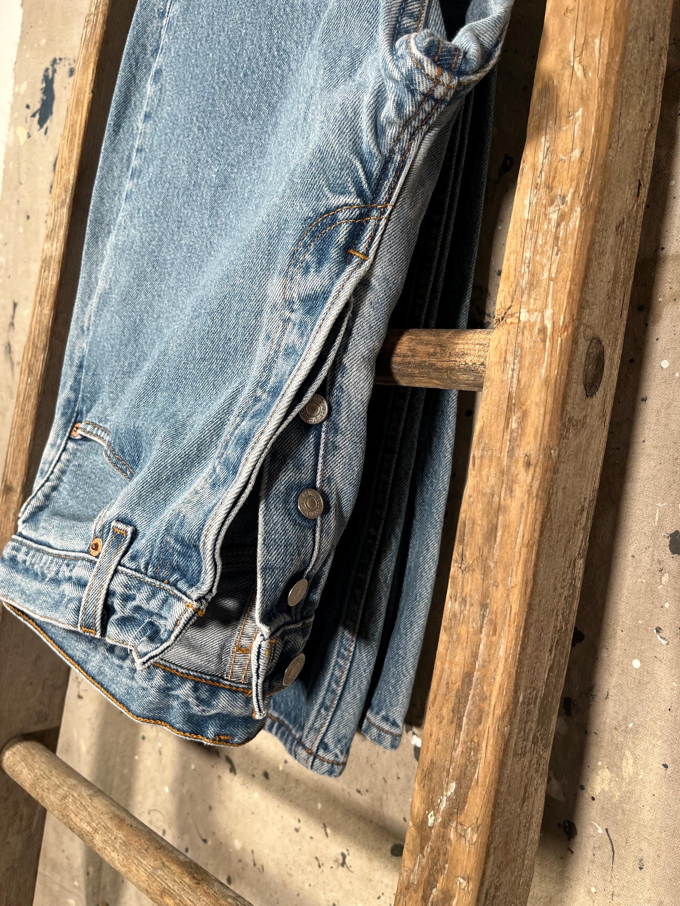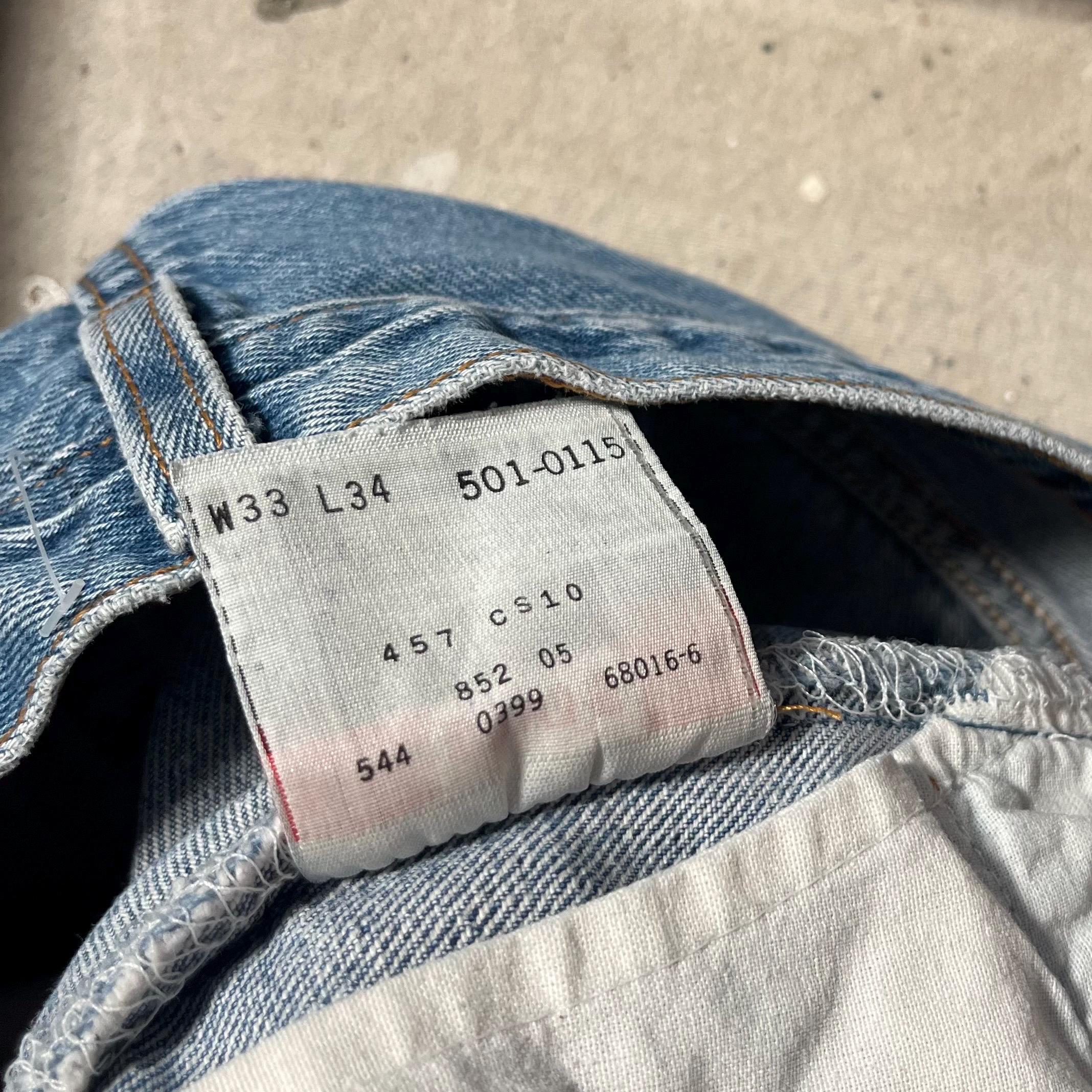 1980s Levi's 501 denim jeans. 34 waist , button fly. Great distressing throughout , some discoloring. Good condition - see photos.
