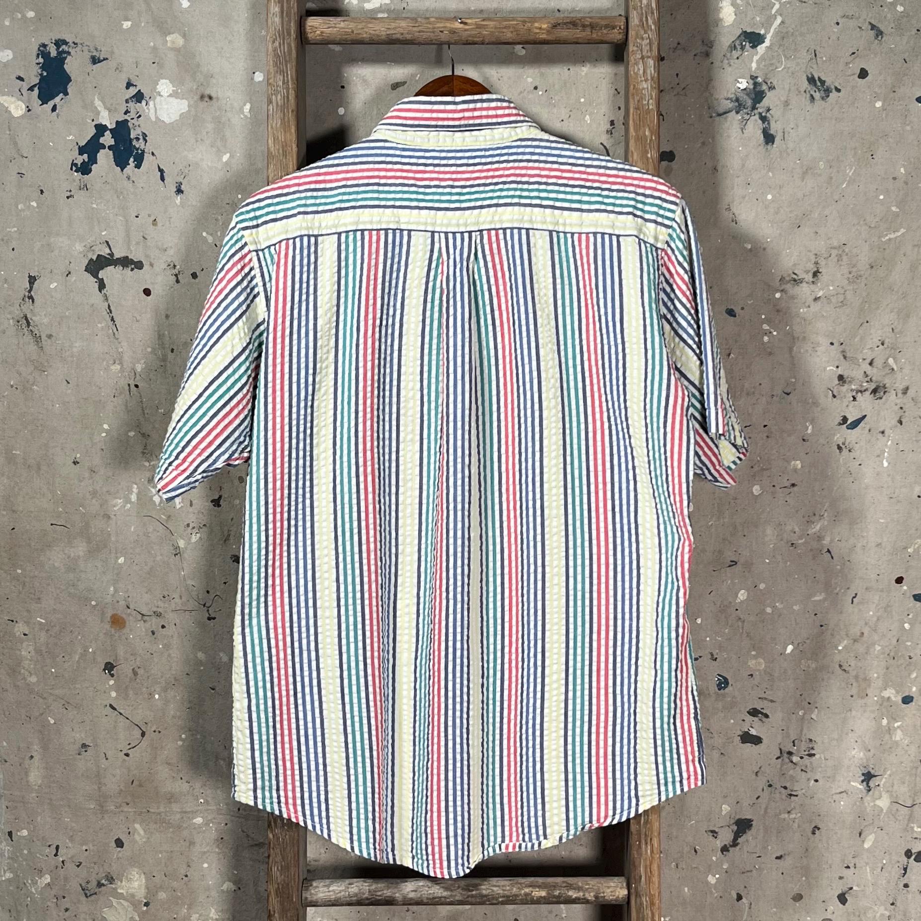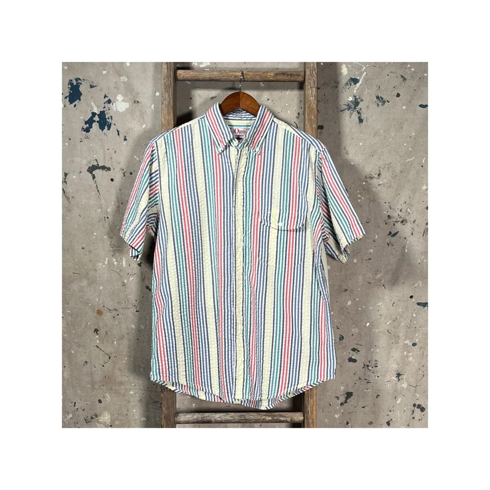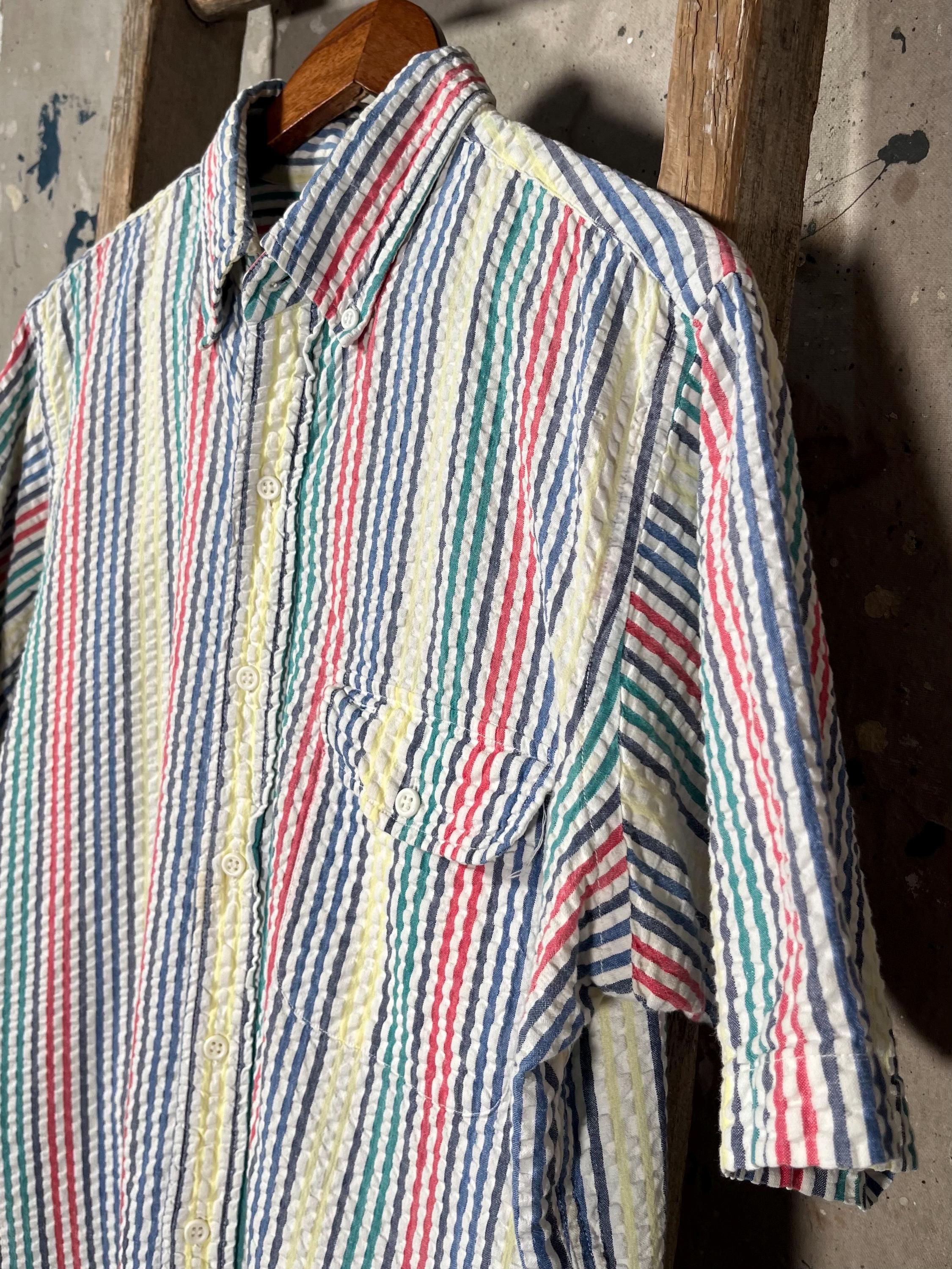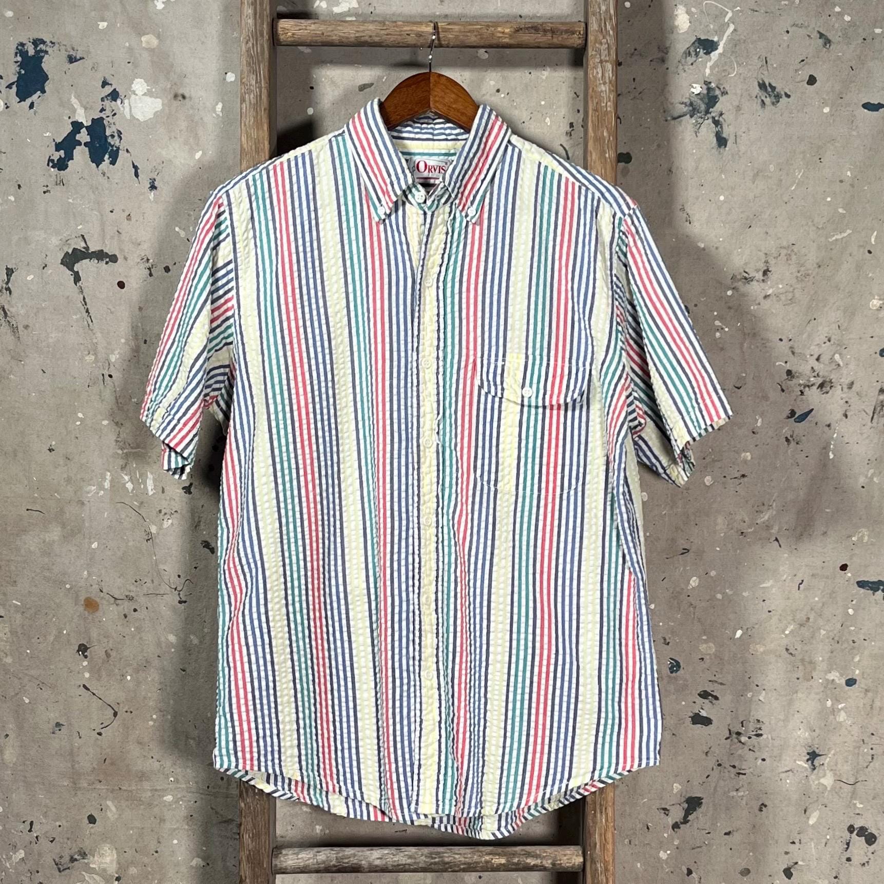 1990s Vertical Striped seersucker button down by Orvis. Features multicolor vertical stripe with one chest pocket. All cotton , super soft and perfect for summer. Good condition , little to no wear - see photos.