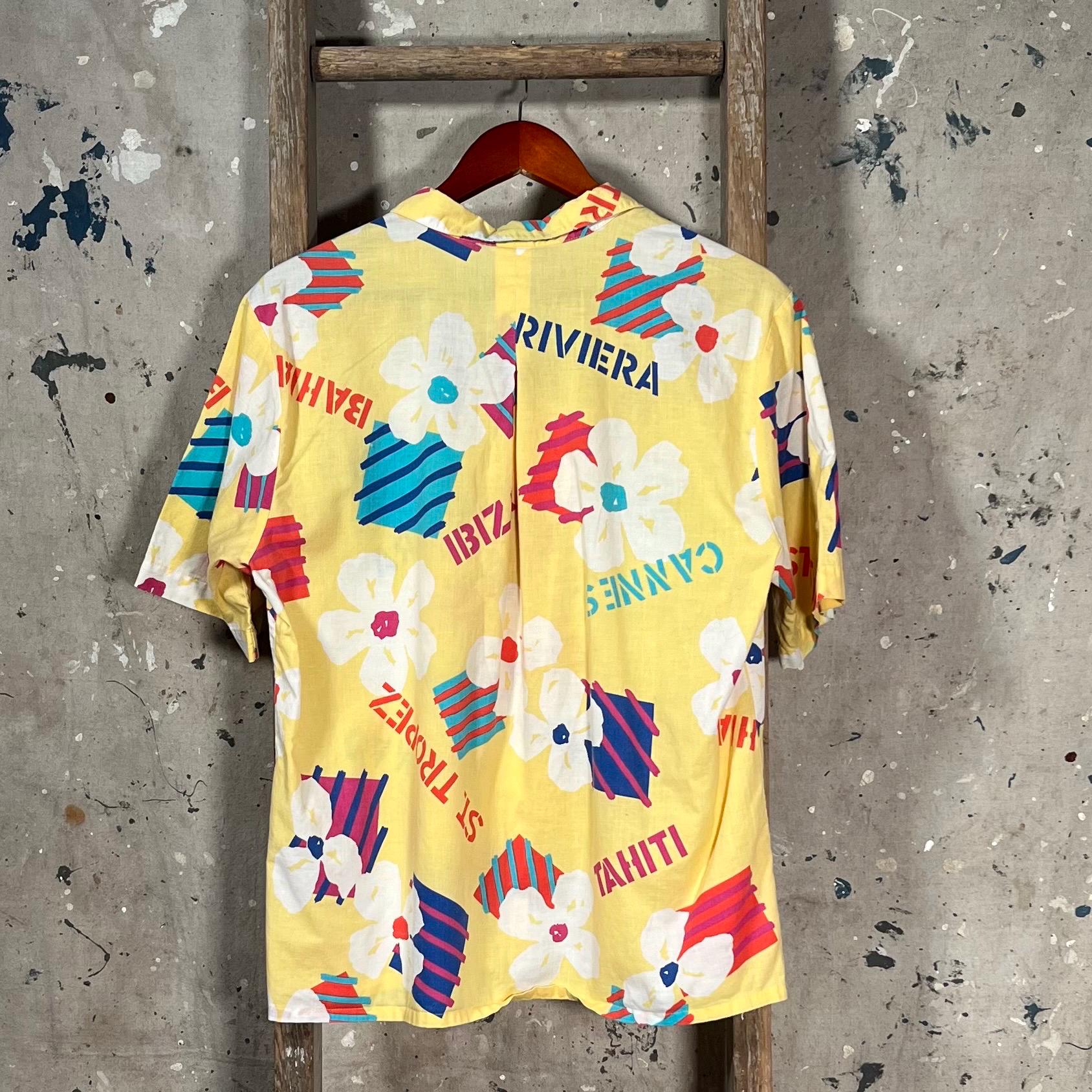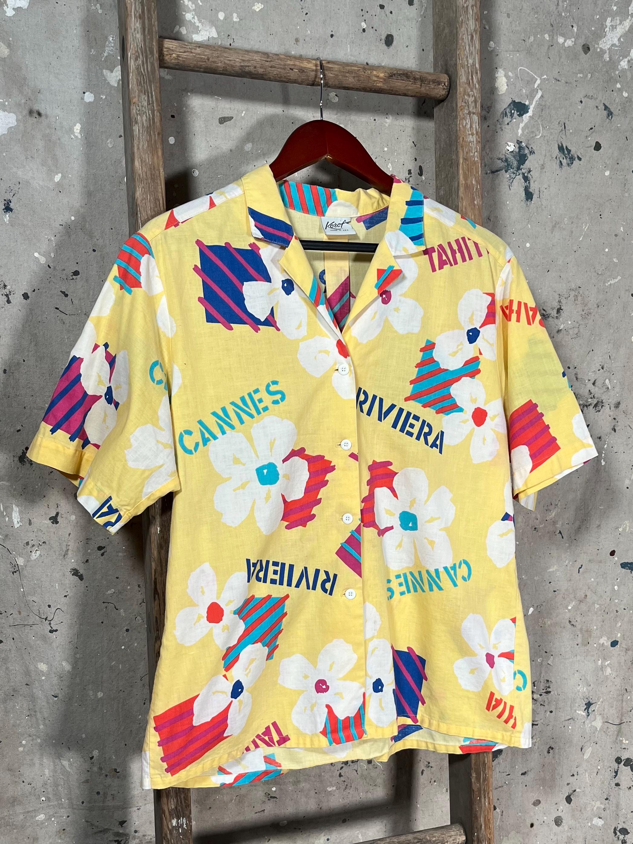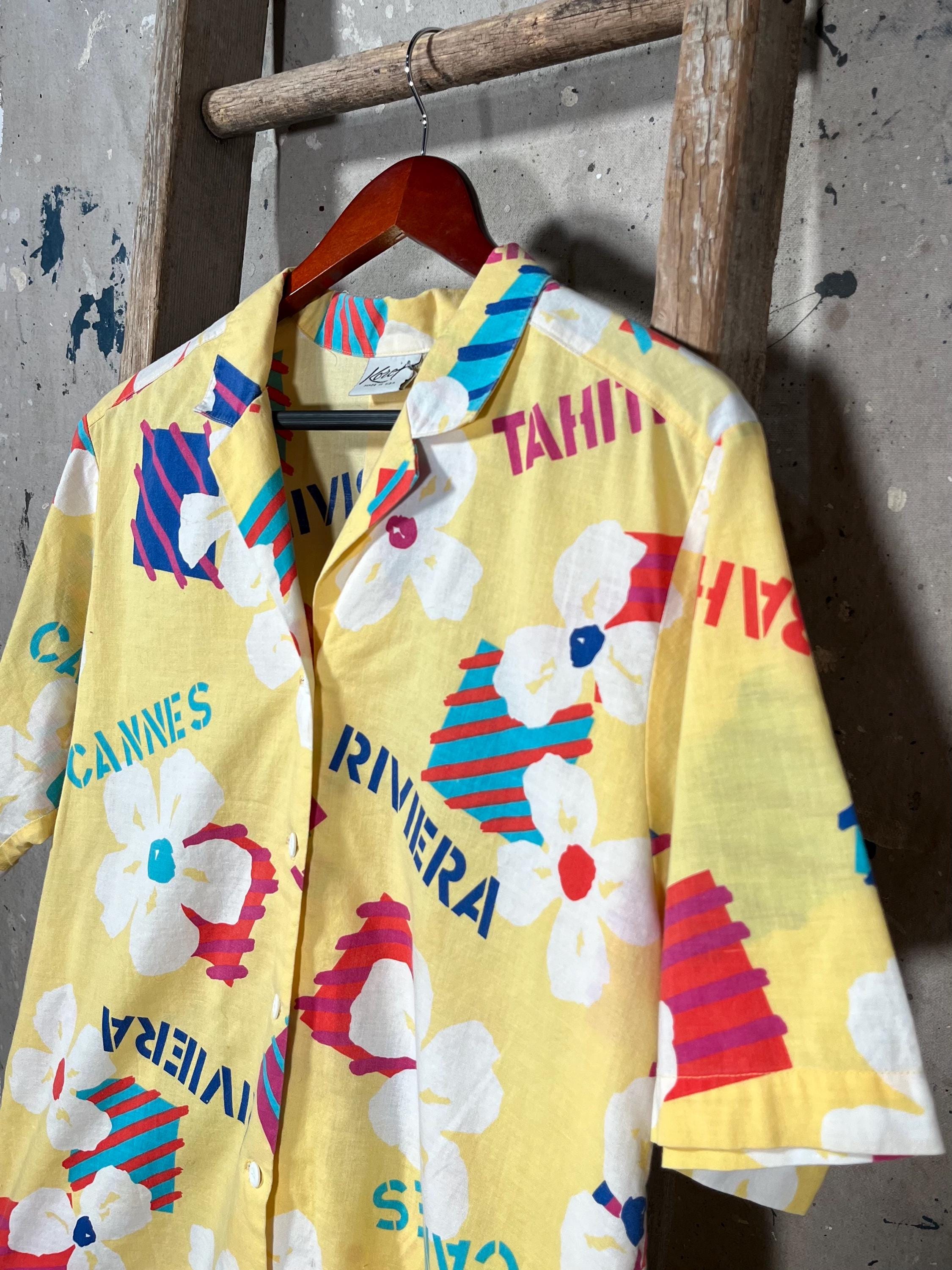 All Cotton 1990s Hawaiian Shirt by Koret. Features funky pattern with frequently visited islands such as Riviera, Cannes, Ibiza & St. Tropez. Standout colors , good vintage condition, no damage or discoloration - see photos.