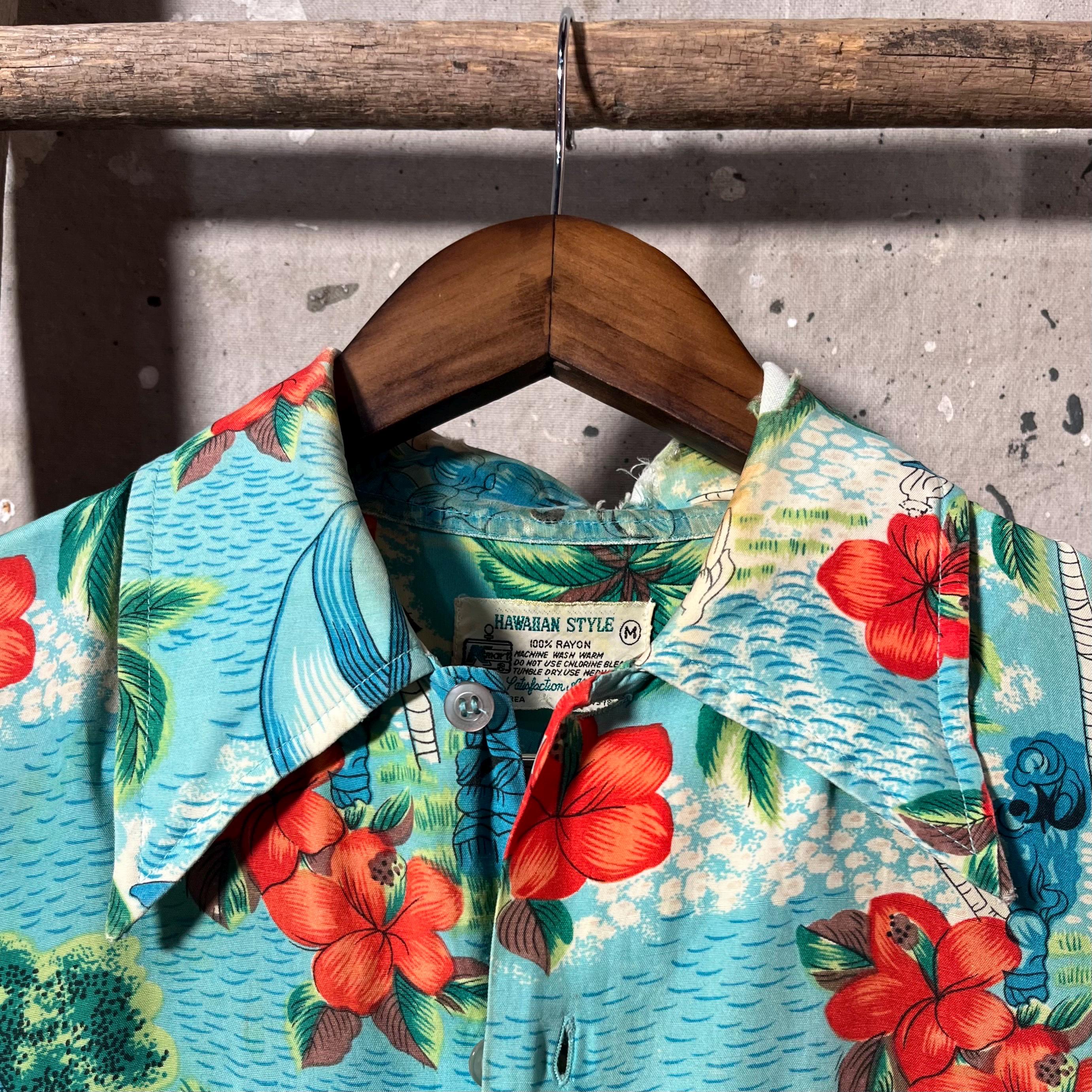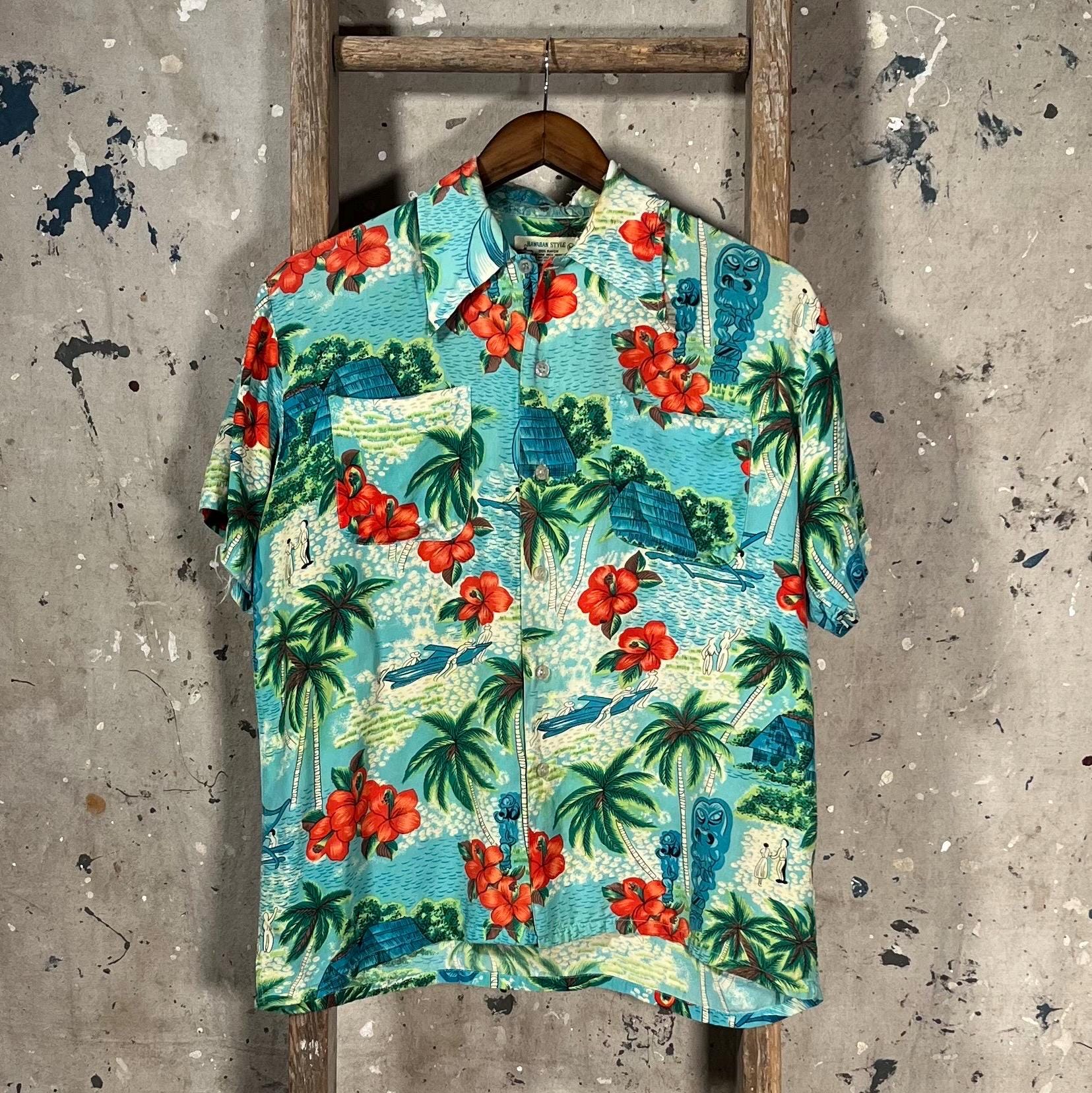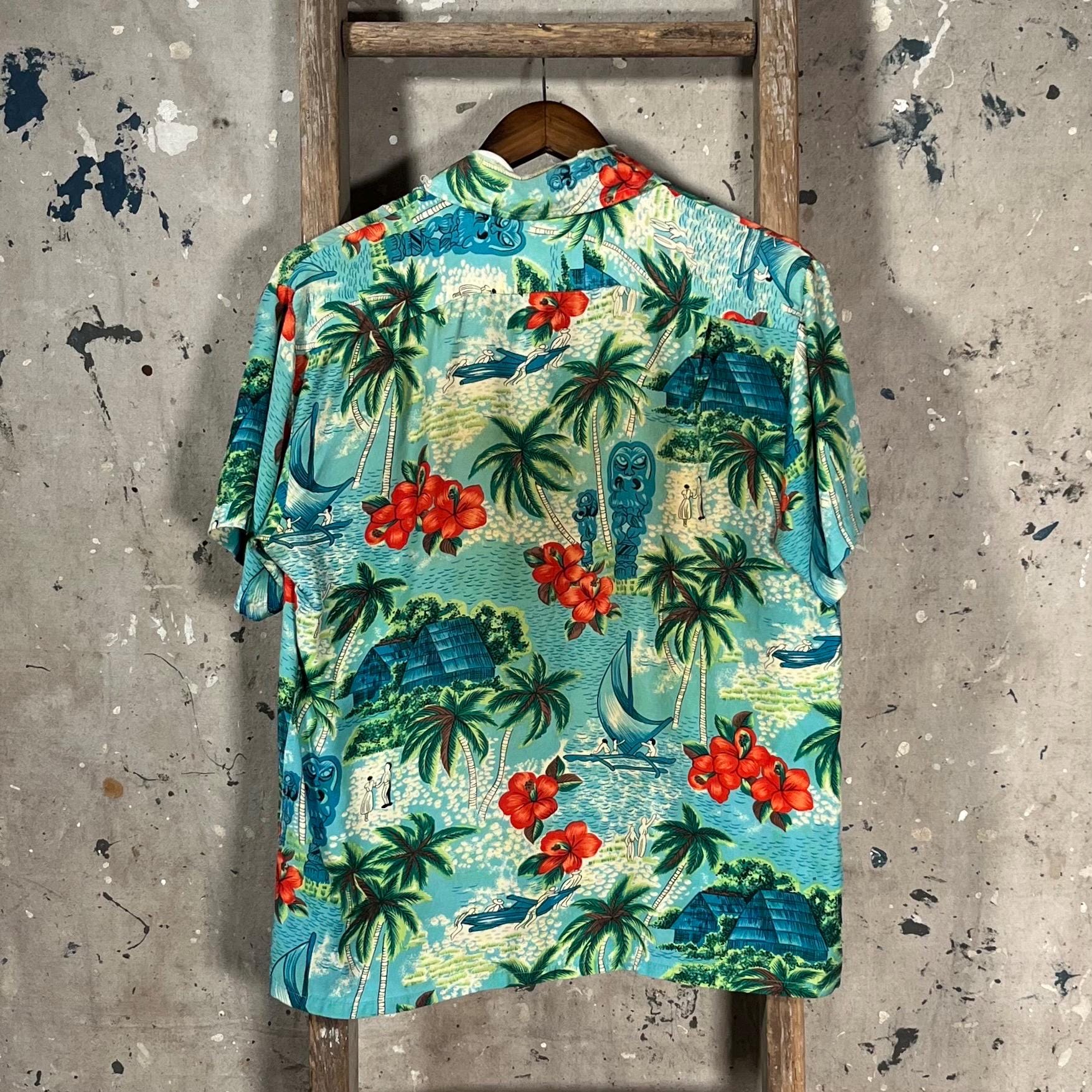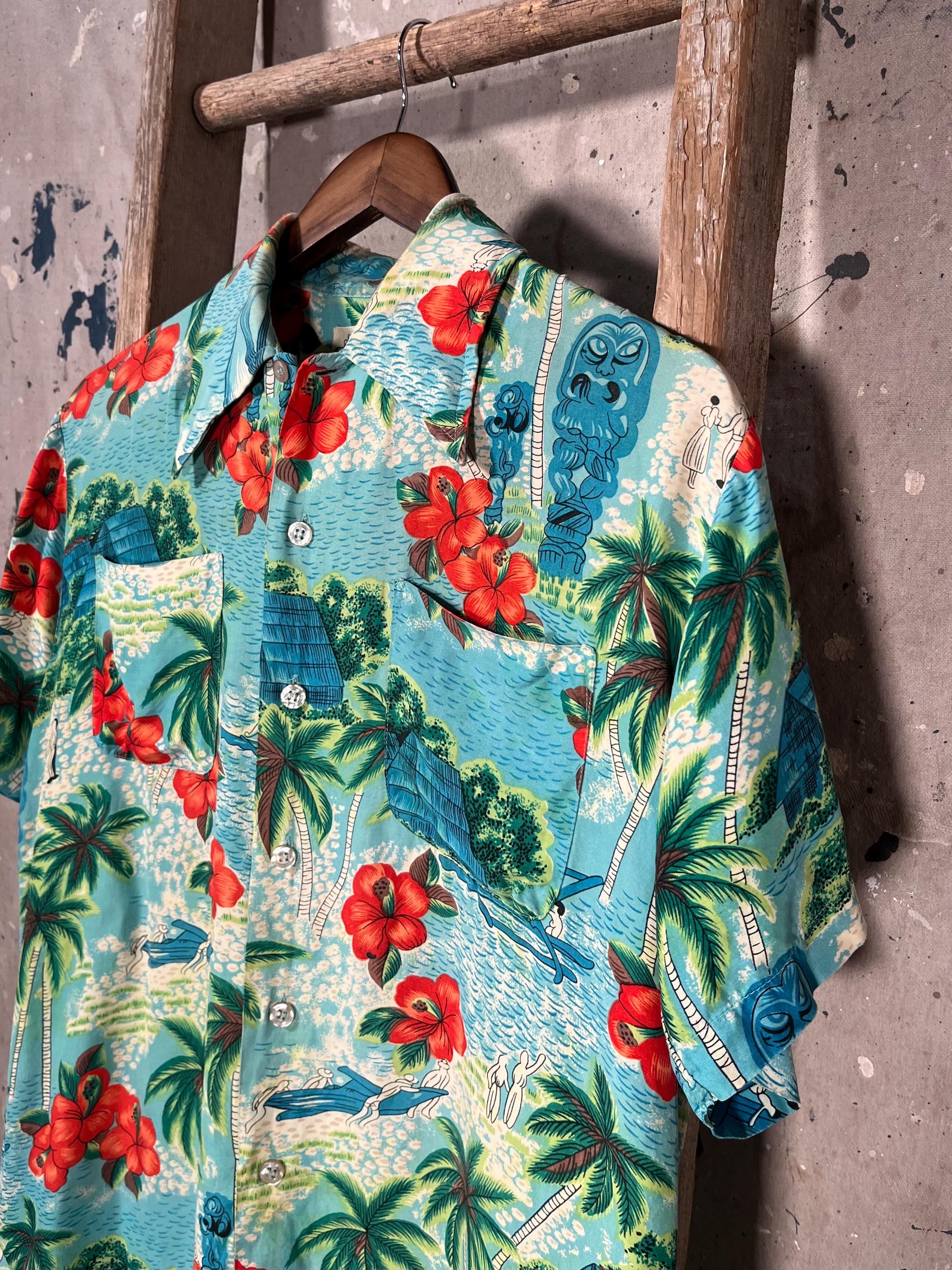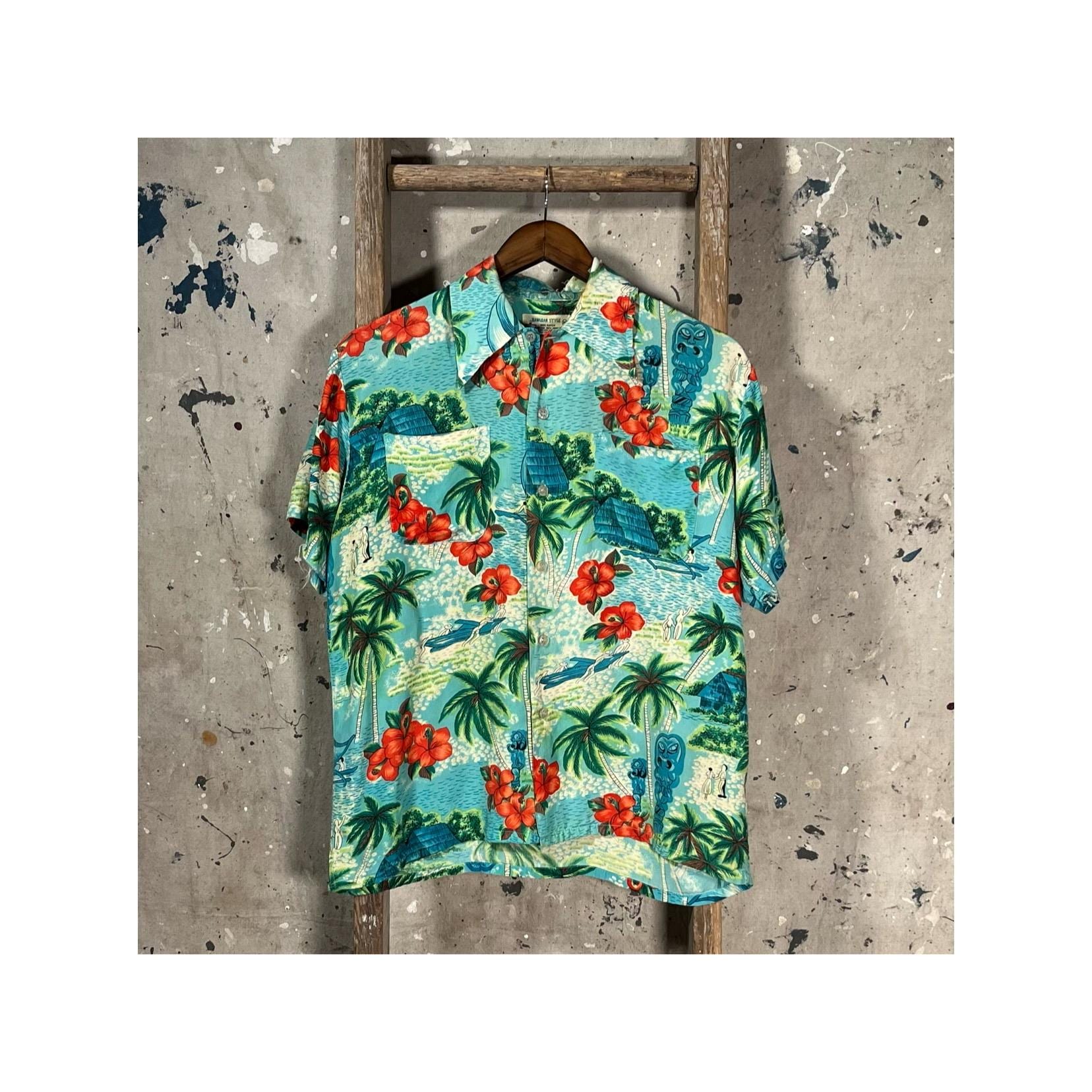 All Rayon 1960s Hawaiian Shirt. Vibrant color print , features palms , totems & hibiscus flowers throughout. Good vintage condition, natural distressing throughout , distressing around collar - See photos .