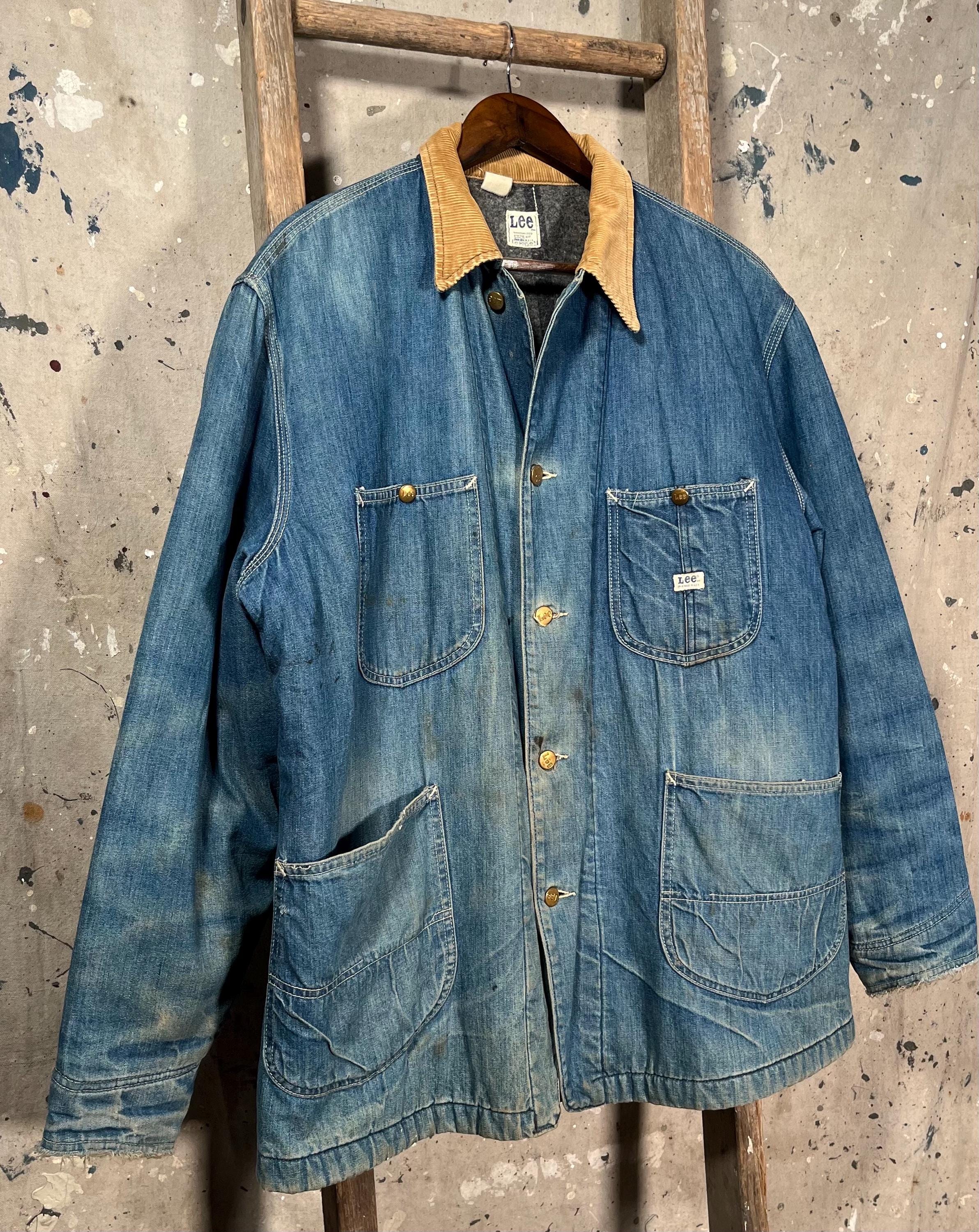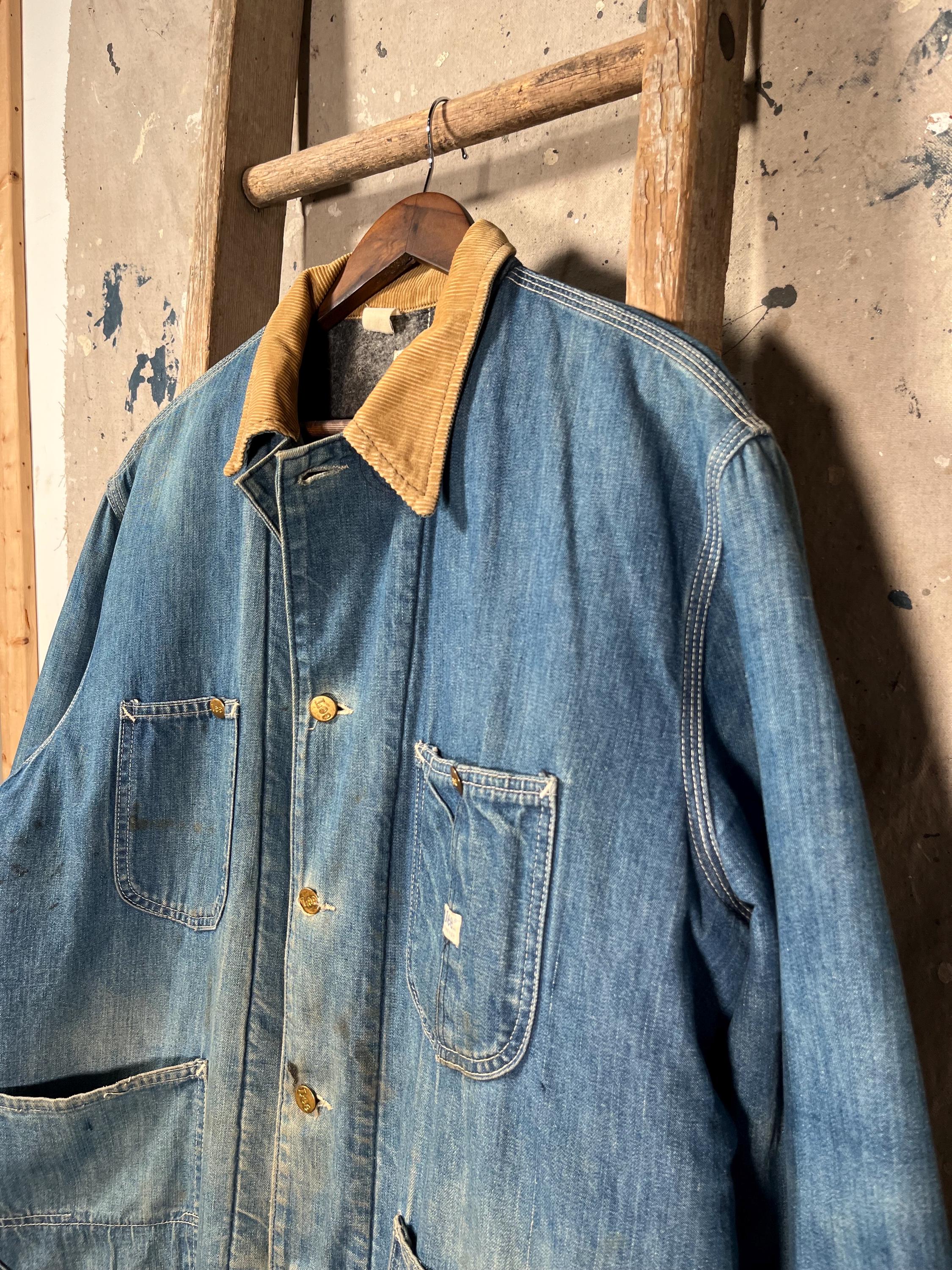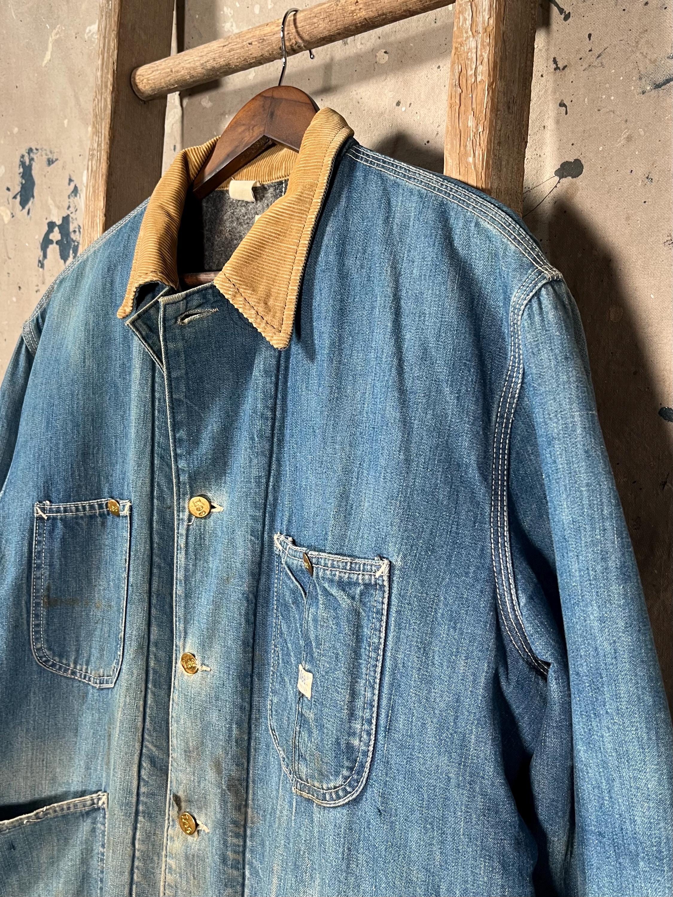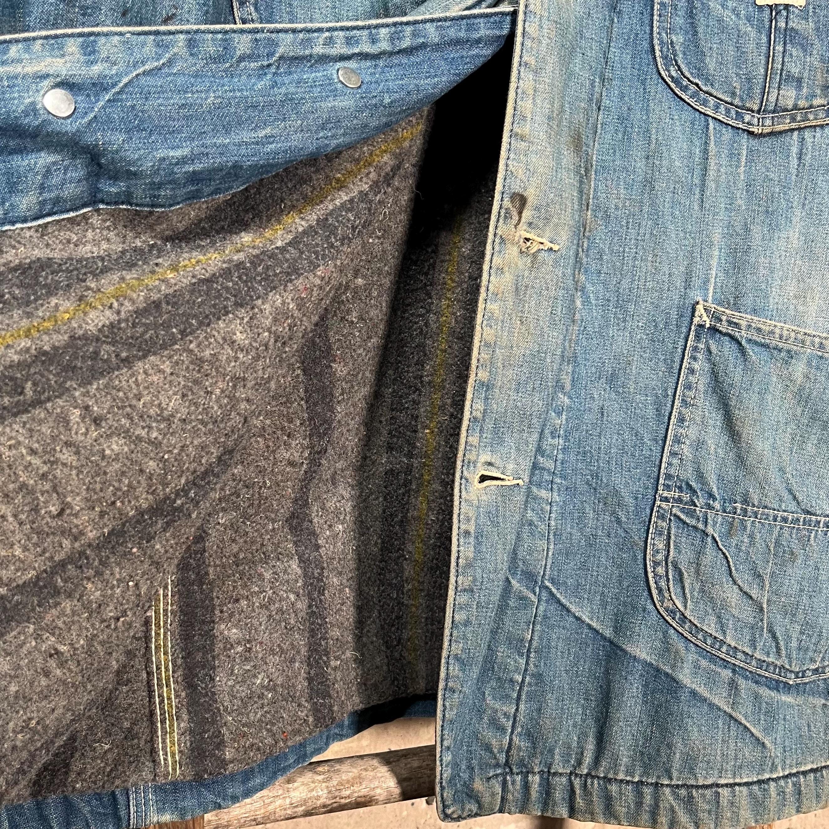 1970s Blanket Lined Lee chore Jacket. Sanforized denim, 4 pocket , full button closure. True large , big size. Natural distressing throughout, see photos. Good condition.