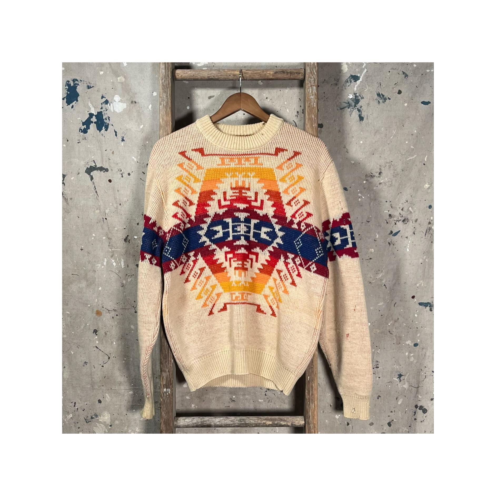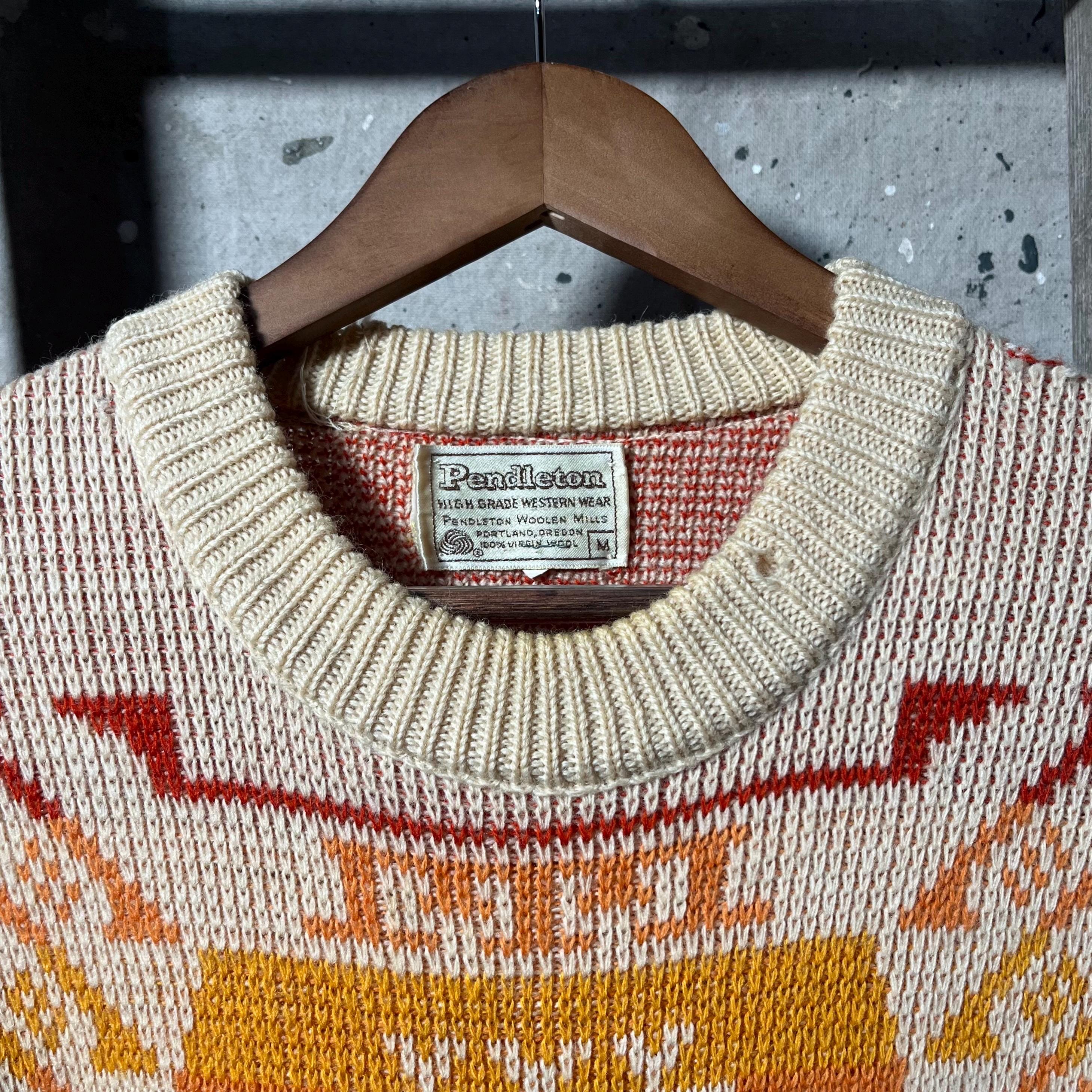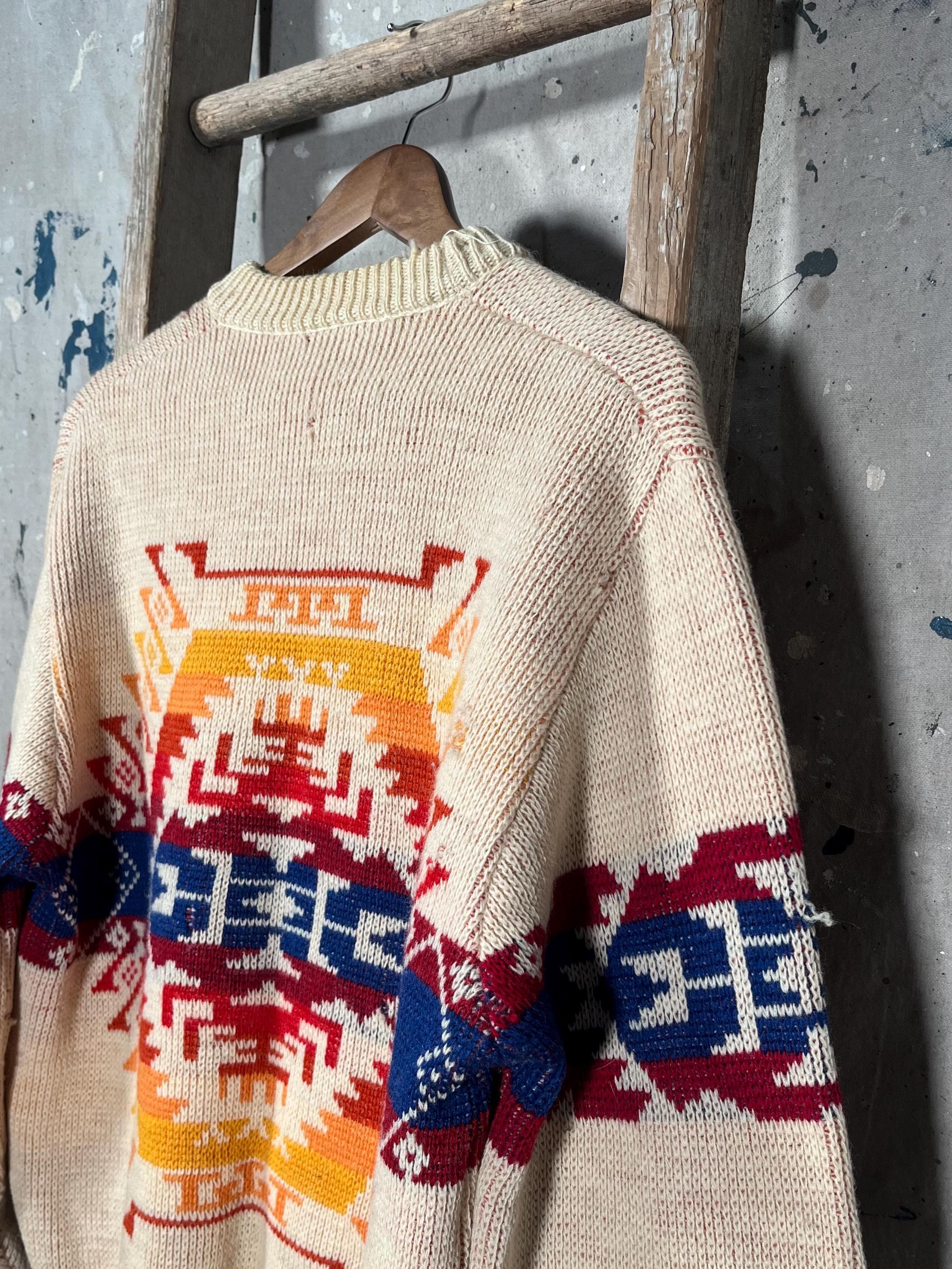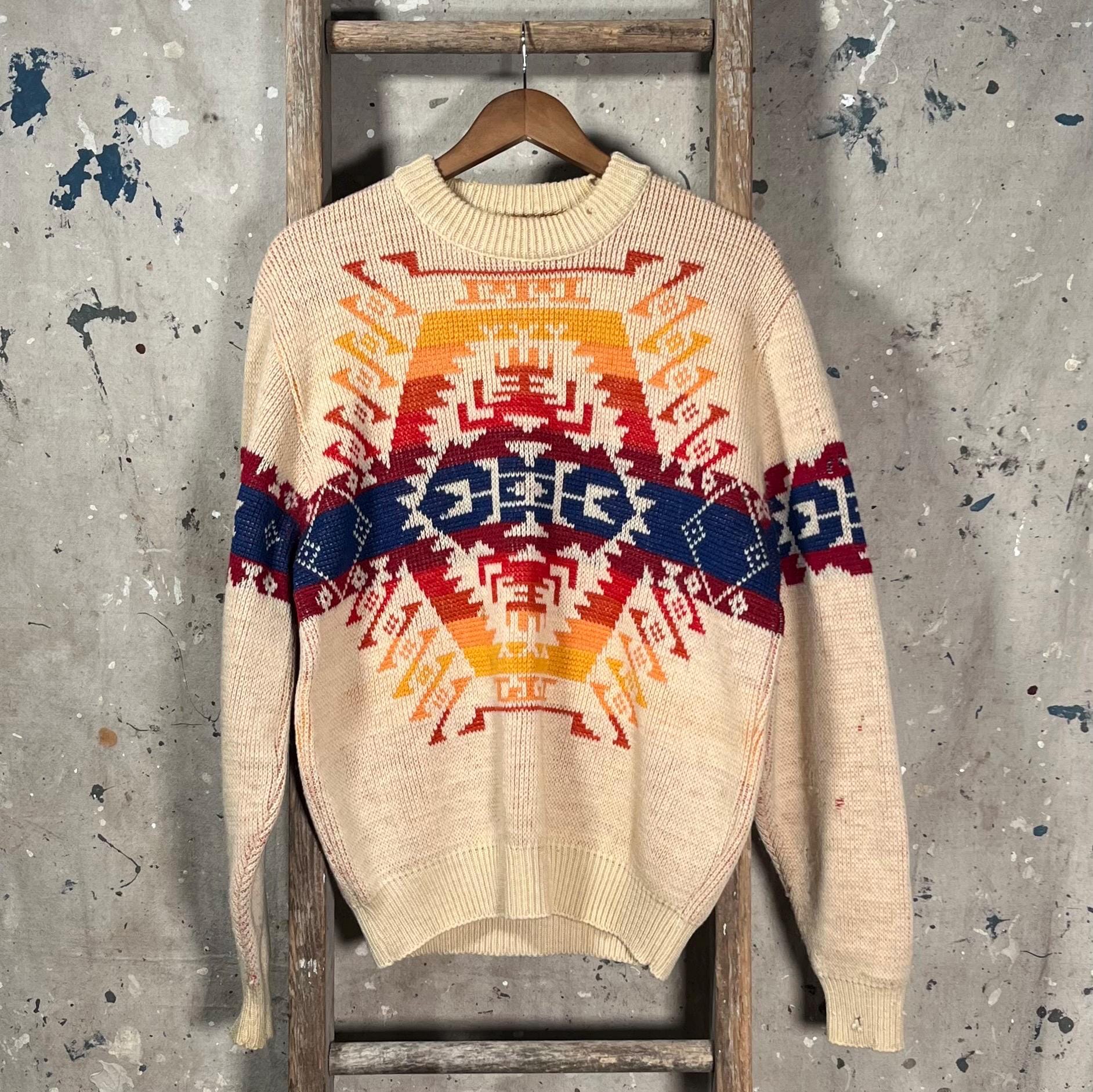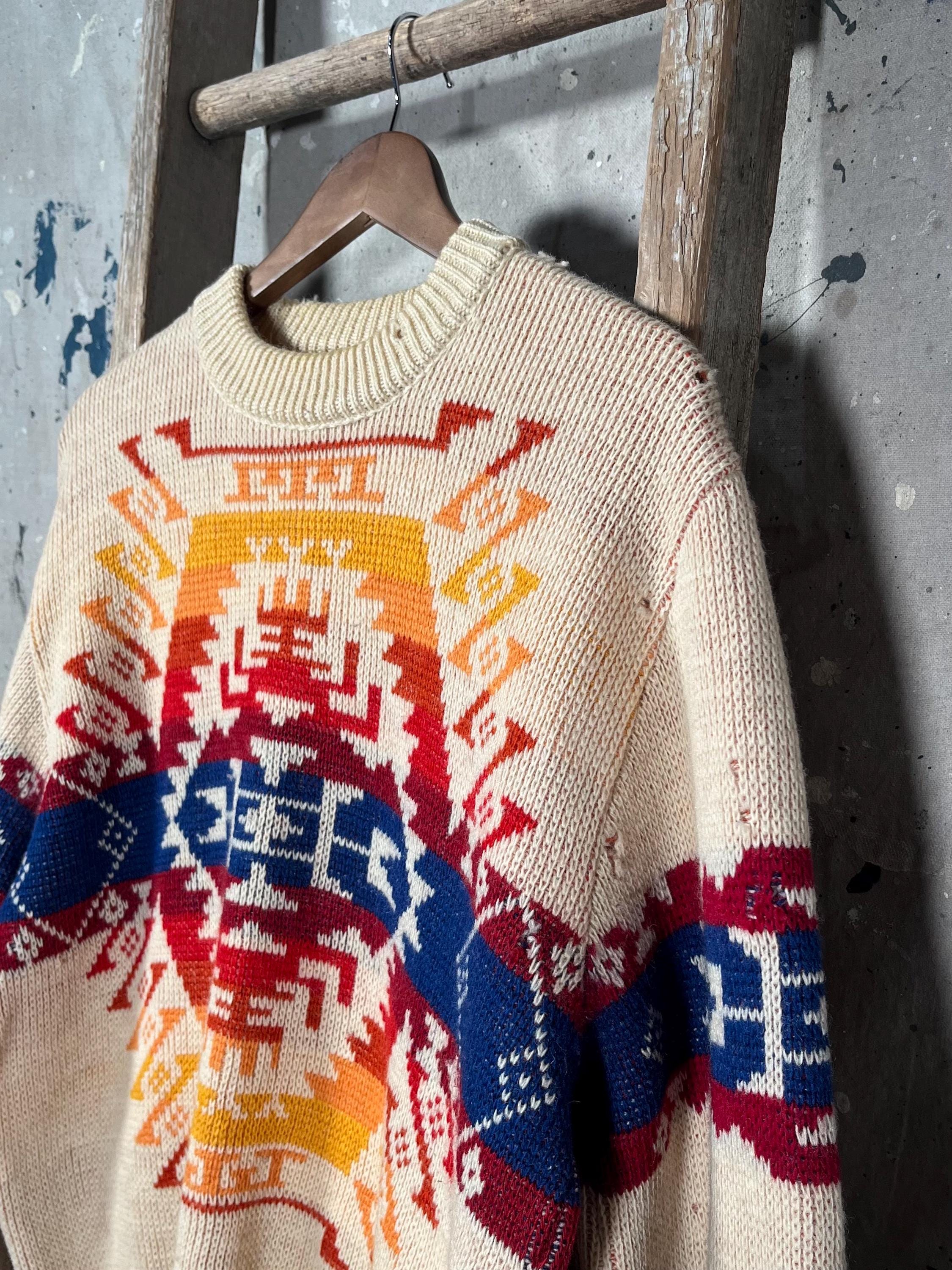 1970s Pendleton woolen mills "High grade Western wear " sweater. Vibrant , all wool western inspired crewneck . Natural distressing from storage , moth holes throughout - see photos. Good condition .