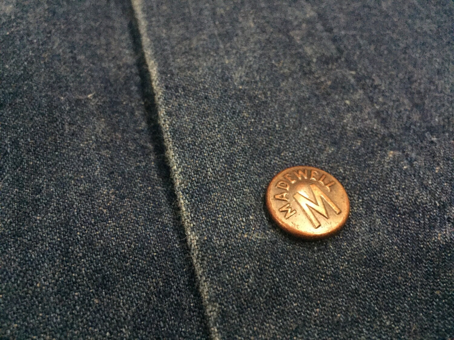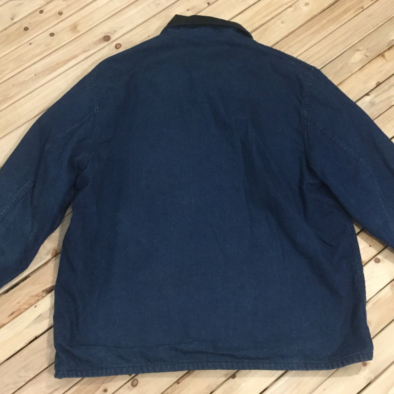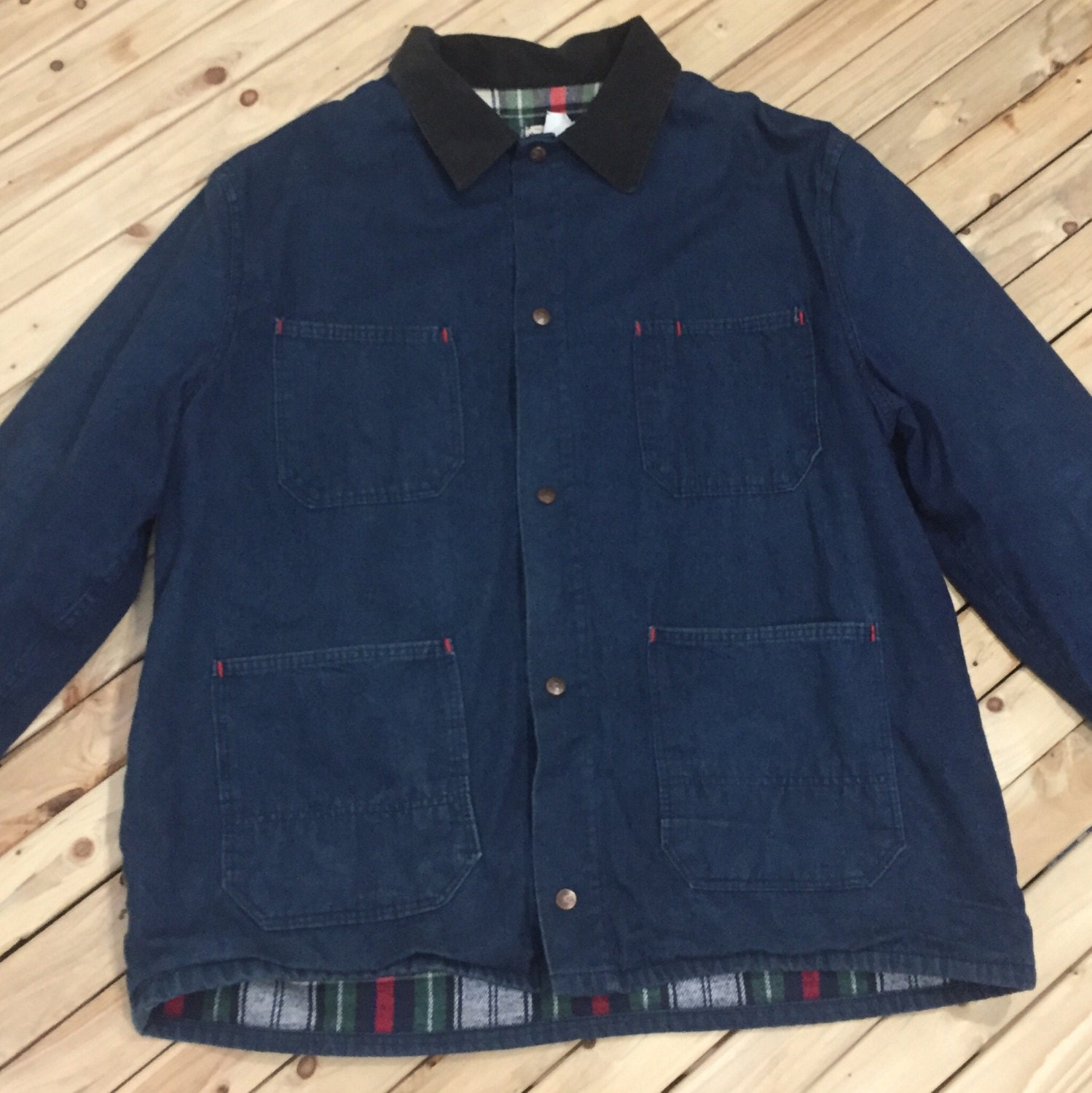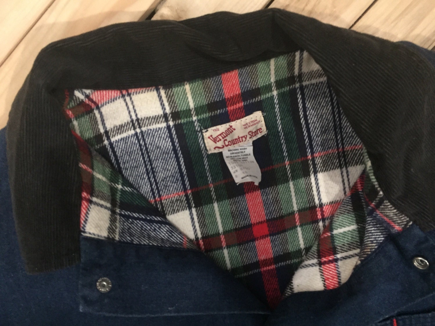 Vermont Country Store Barn Coat . Made of heavyweight cotton blue denim. Features plaid lining, and four patch pockets. They feature polished nickel buttons down the front and on sleeve cuffs.