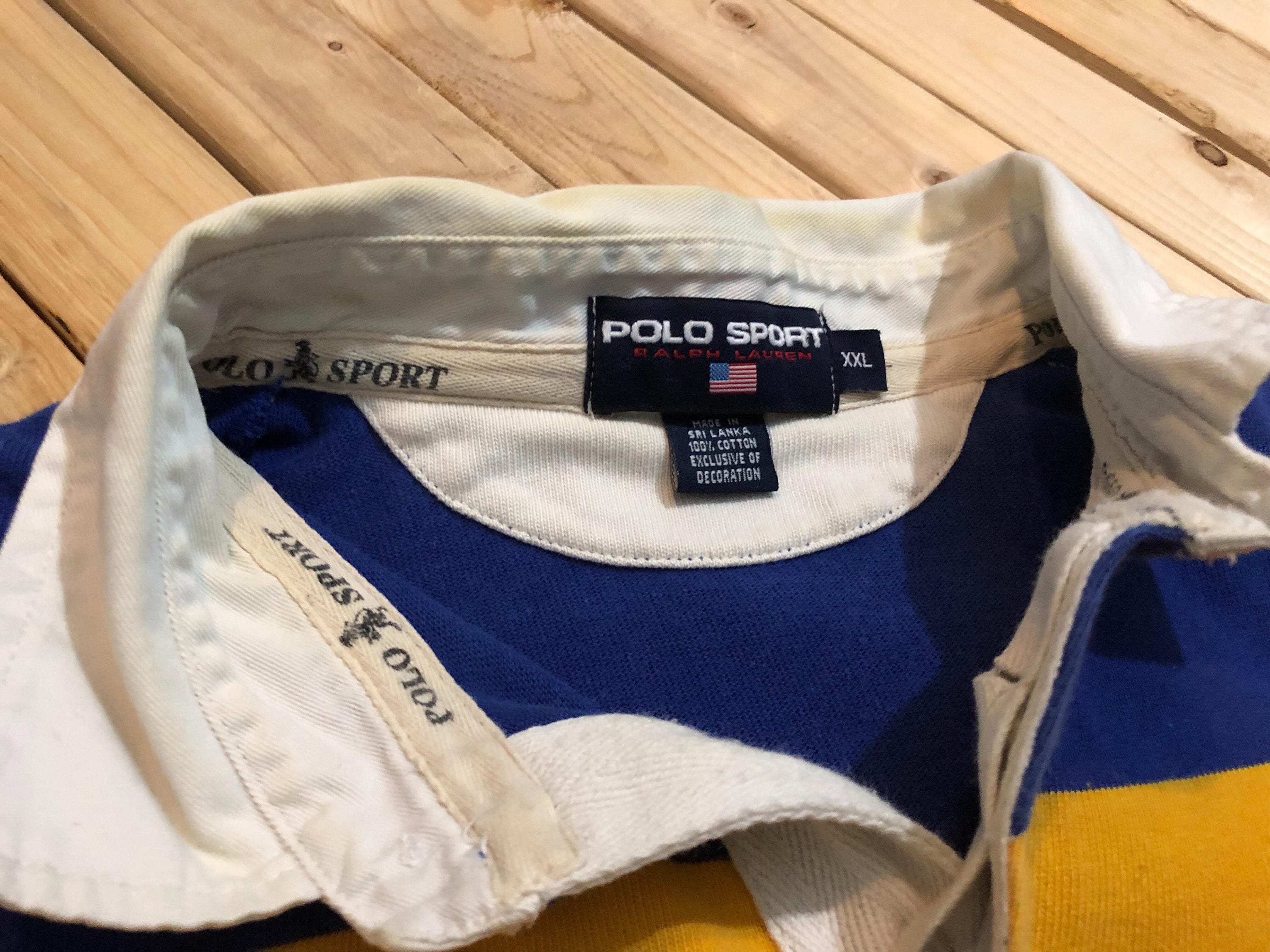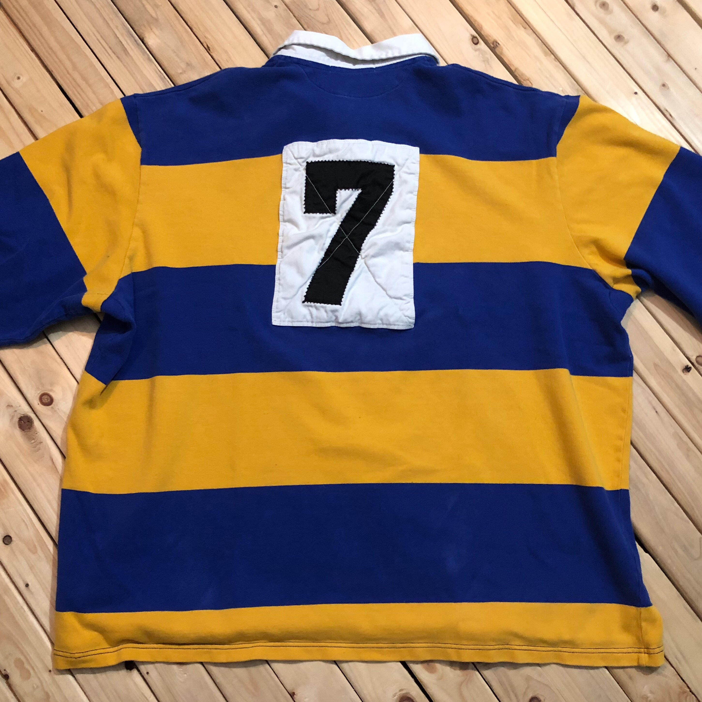 Ralph Lauren Polo Sport Rugby shirt with number stitched on back. The Rugby is a heavy cotton featuring blue and yellow stripe. Good condition. Little yellowing on inside of collar.