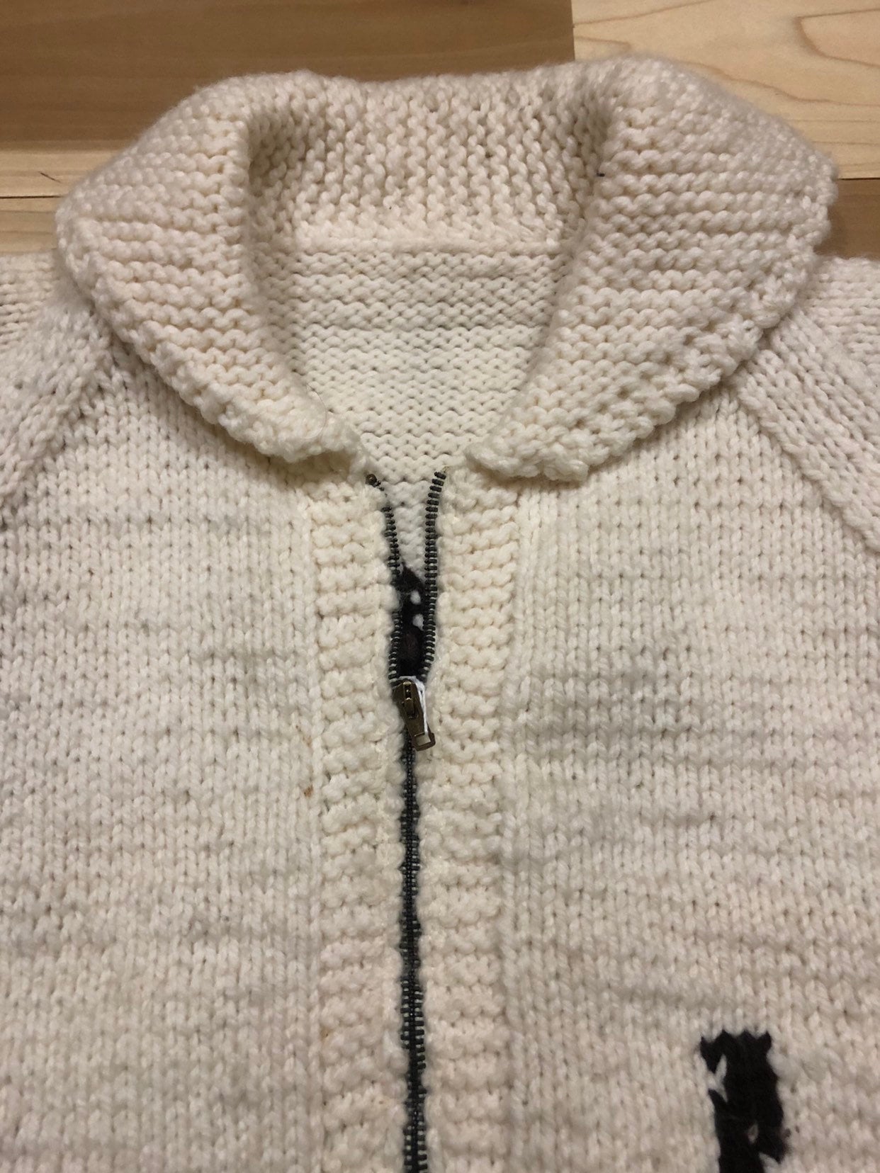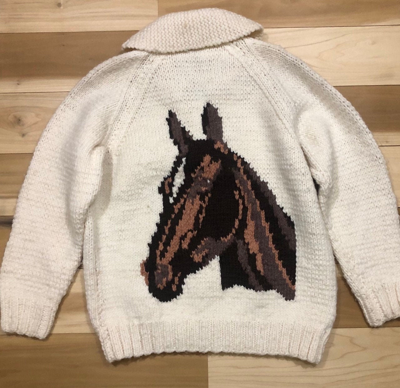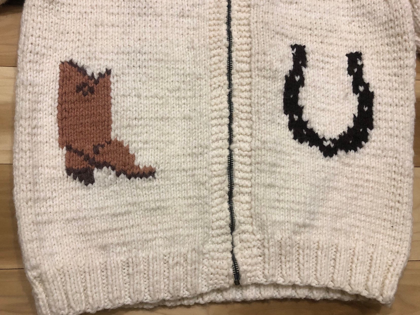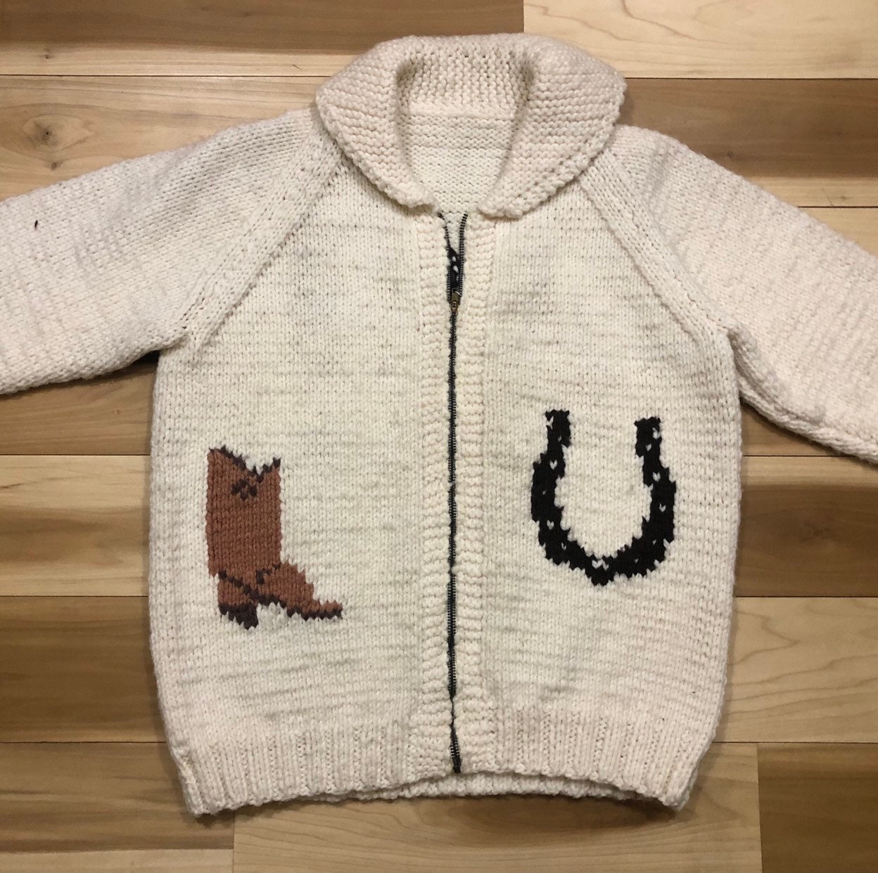 Beautiful 1960s Cowichan Wool Sweater. Horse western theme, hand Knit with cc Zipper. Great condition. No discoloration, no damage.