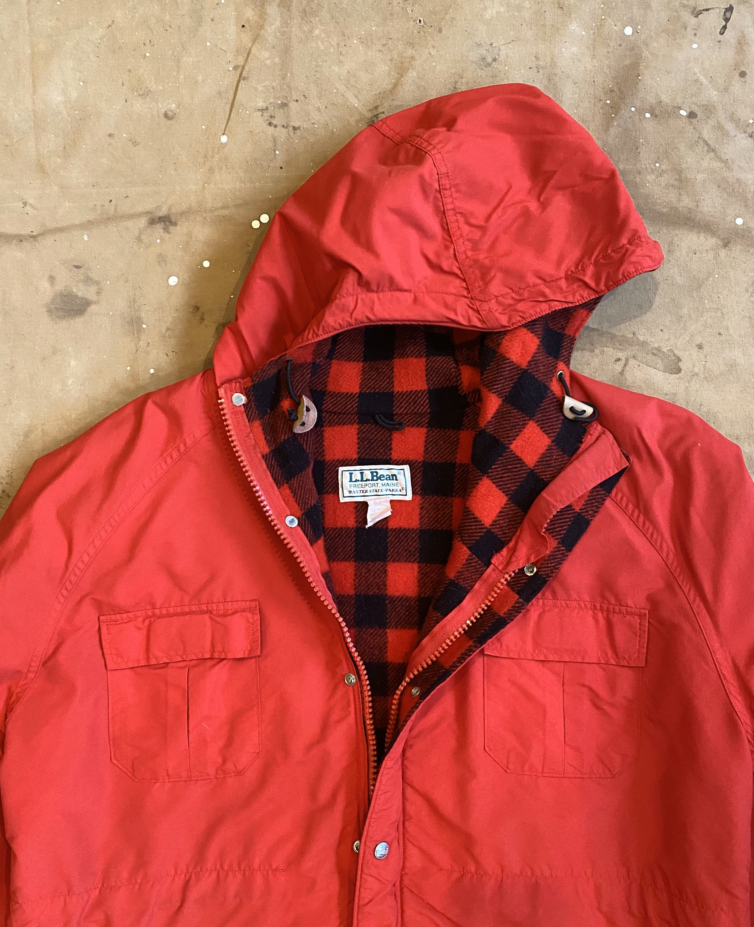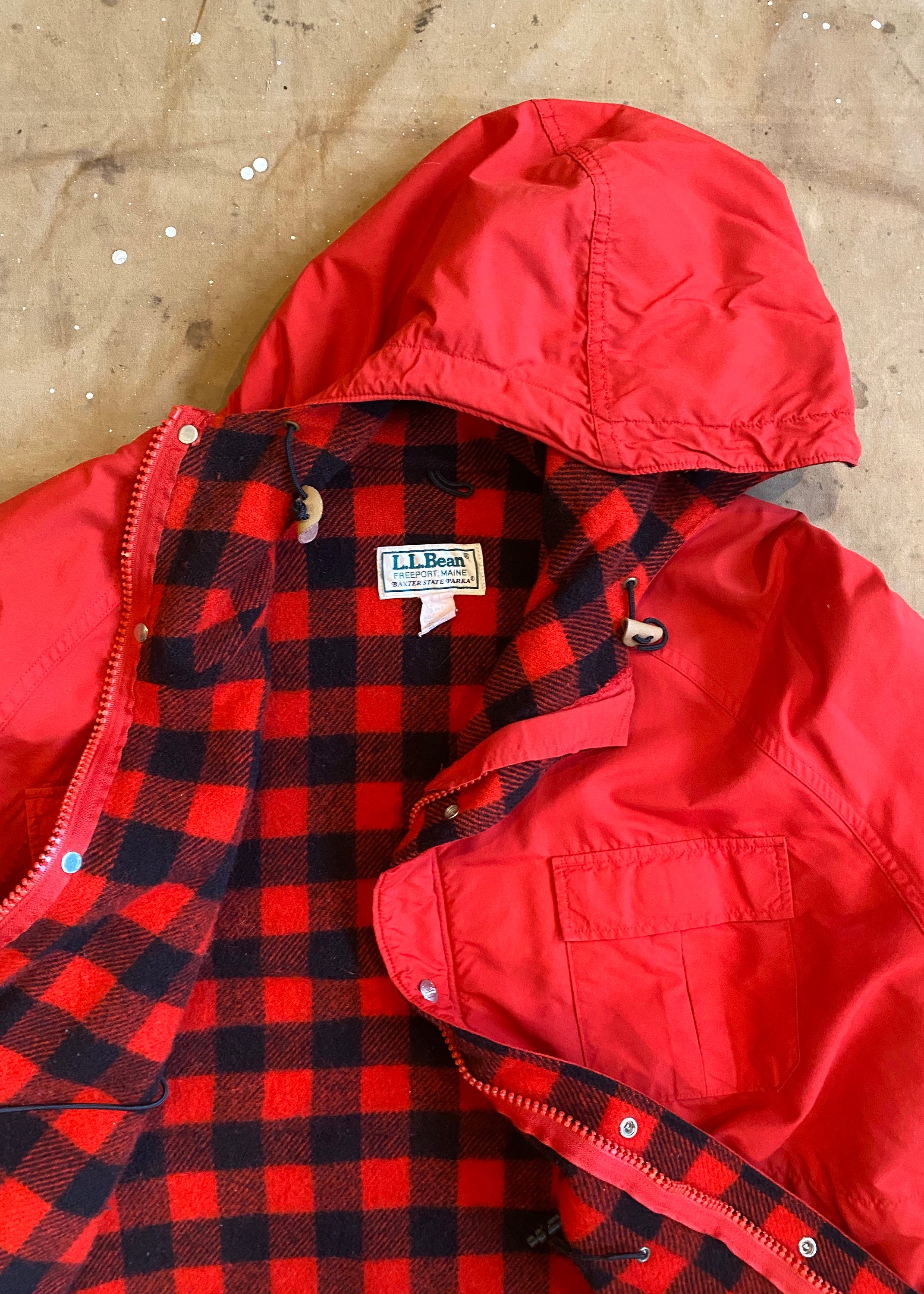 LL Bean Baxter state Parka. Timeless Buffalo plaid Wool lining, red nylon shell. Features 2 chest pockets, and 2 hand warmer pockets. Good new condition. No damage or discoloration.