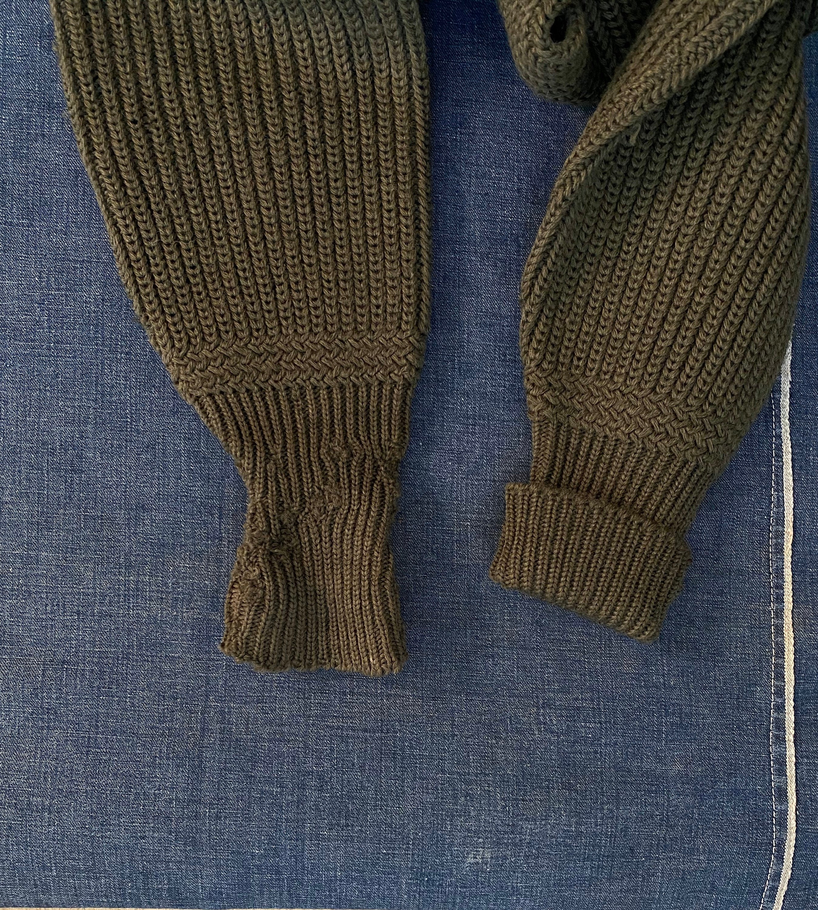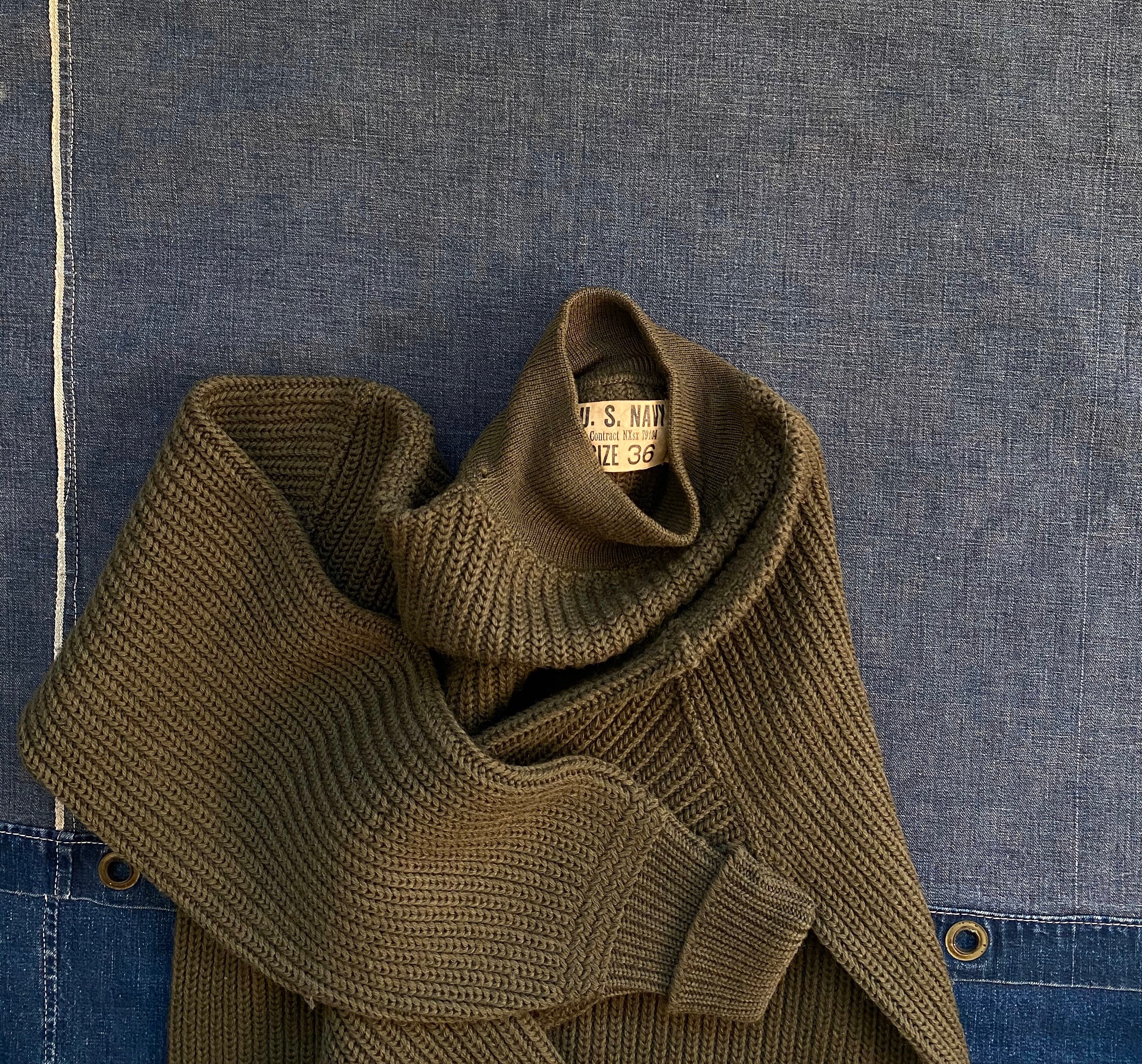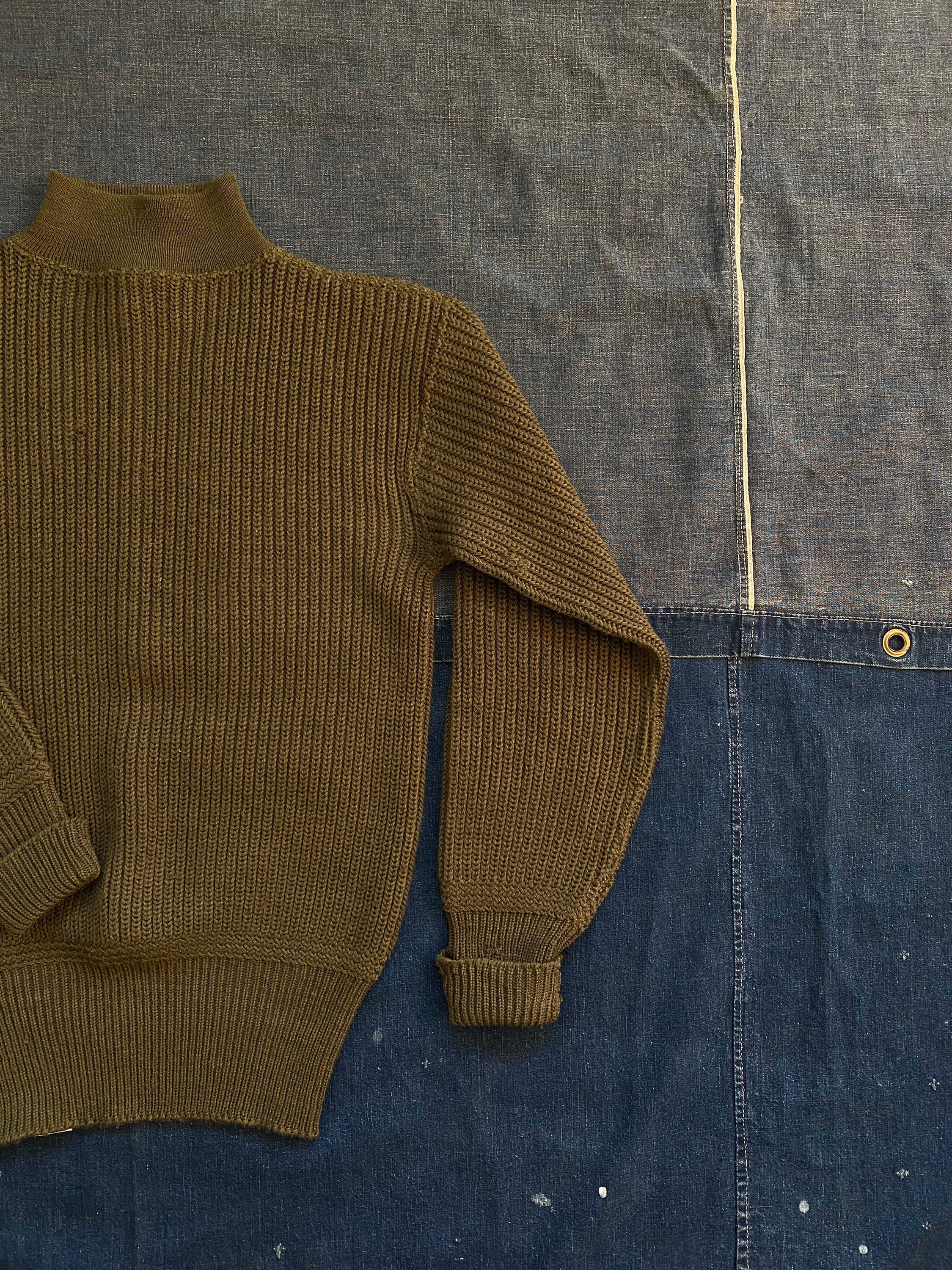 1940s WWII wool sweater . US Navy olive drab turtleneck sweater. Ribbed waist and sleeve cuffs. Size 36 , USN cloth label inside collar . Excellent condition, repaired sleeve cuff as photographed .