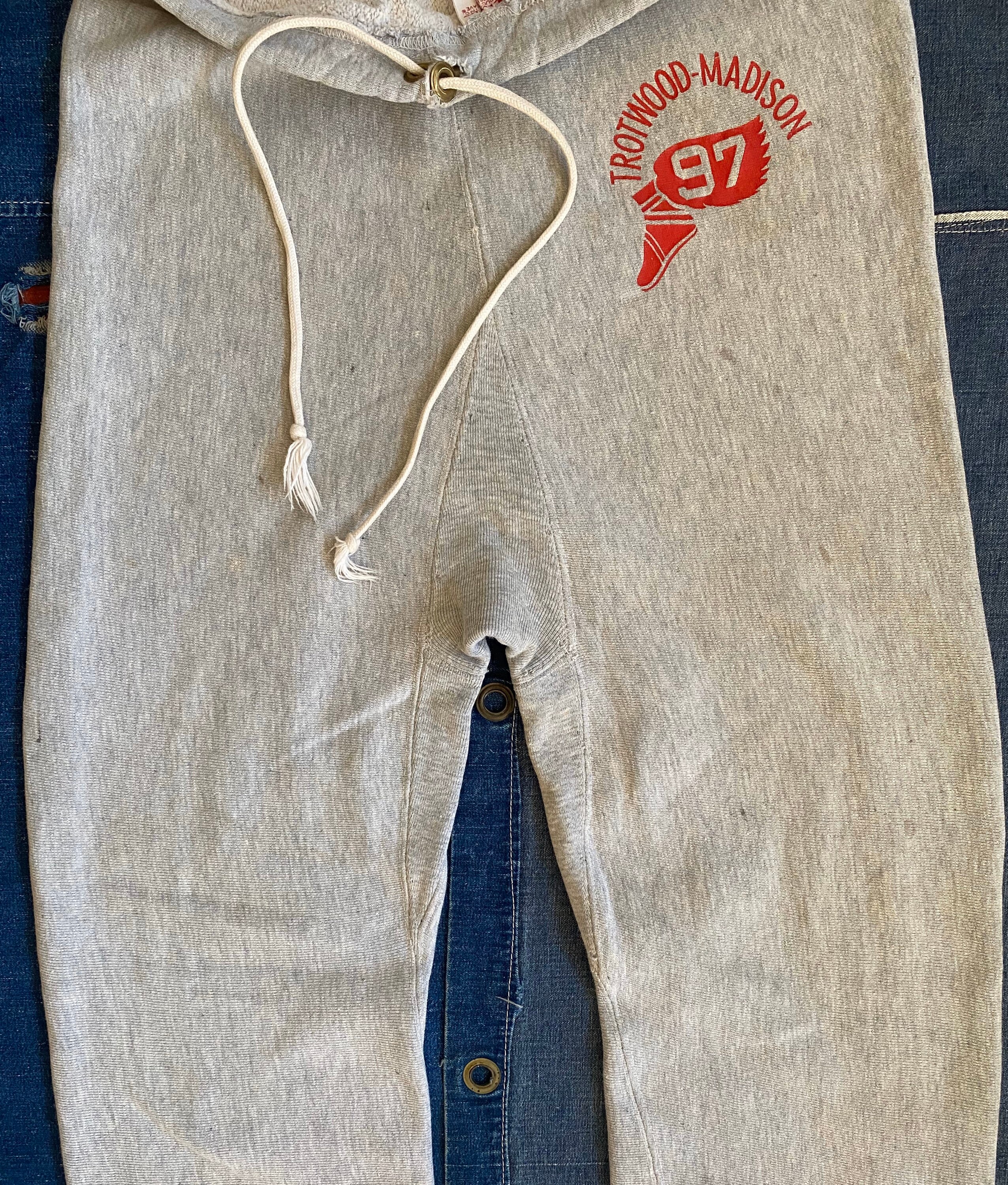 1970s Champion Reverse Weave sweatpants . Heather gray, athletic fit, gusseted crotch , Twotwood Madison Track. Light spotting , drawstring eyelet is loose , no elastic in left leg cuff. Otherwise , great condition .